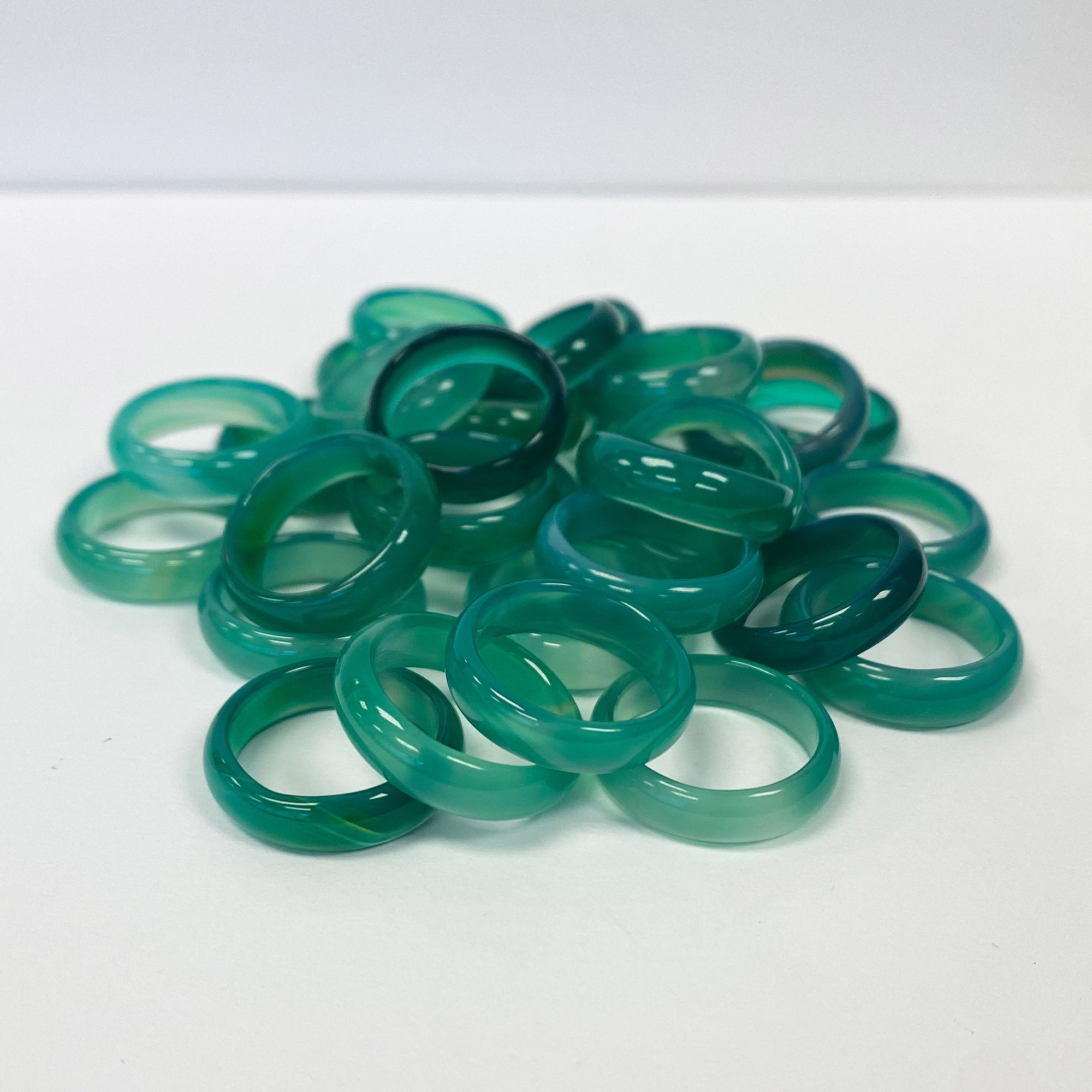 Be gorgeous in green with this beautiful green agate gemstone band. This lovely unisex ring ranges in size from 4.5 to 7.5. Be aware that the shade of green may vary due to differences in depth. Add this band to any outfit for that stunning pop of color! This gemstone band features a 5mm setting, making it a standout accessory that will draw the eye. It is polished to a smooth finish for comfortable wear.