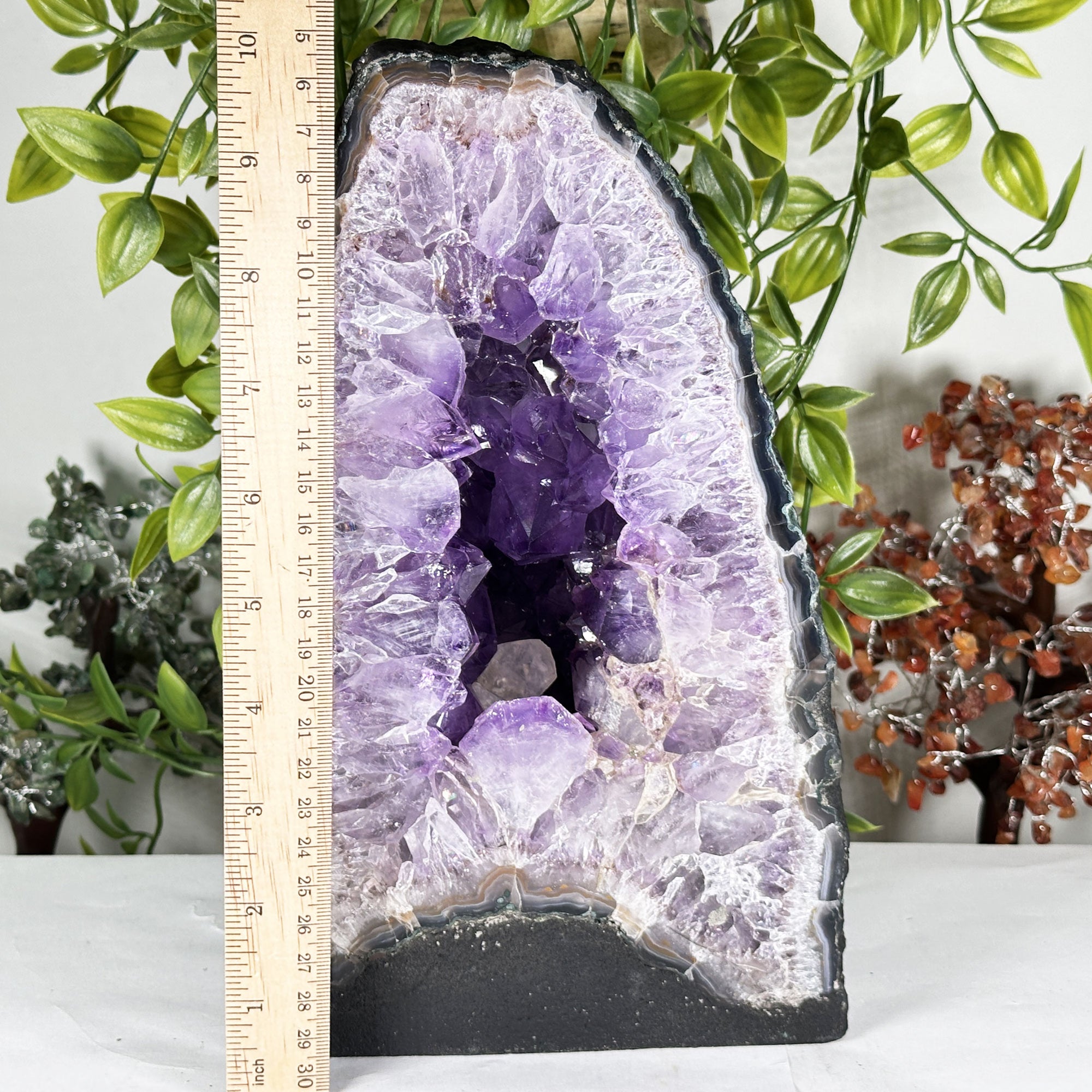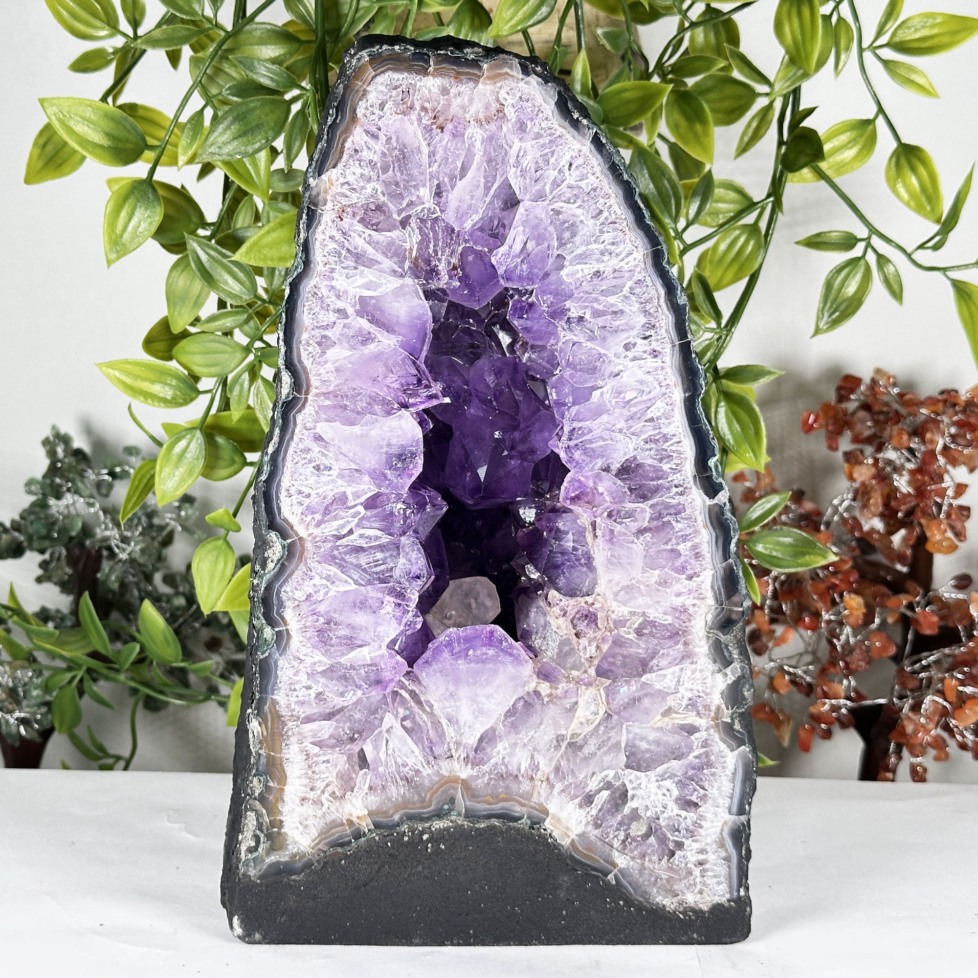 A large cathedral style amethyst geode cluster with natural crystal points and a deep purple hue featuring raw edges and polished interior surfaces