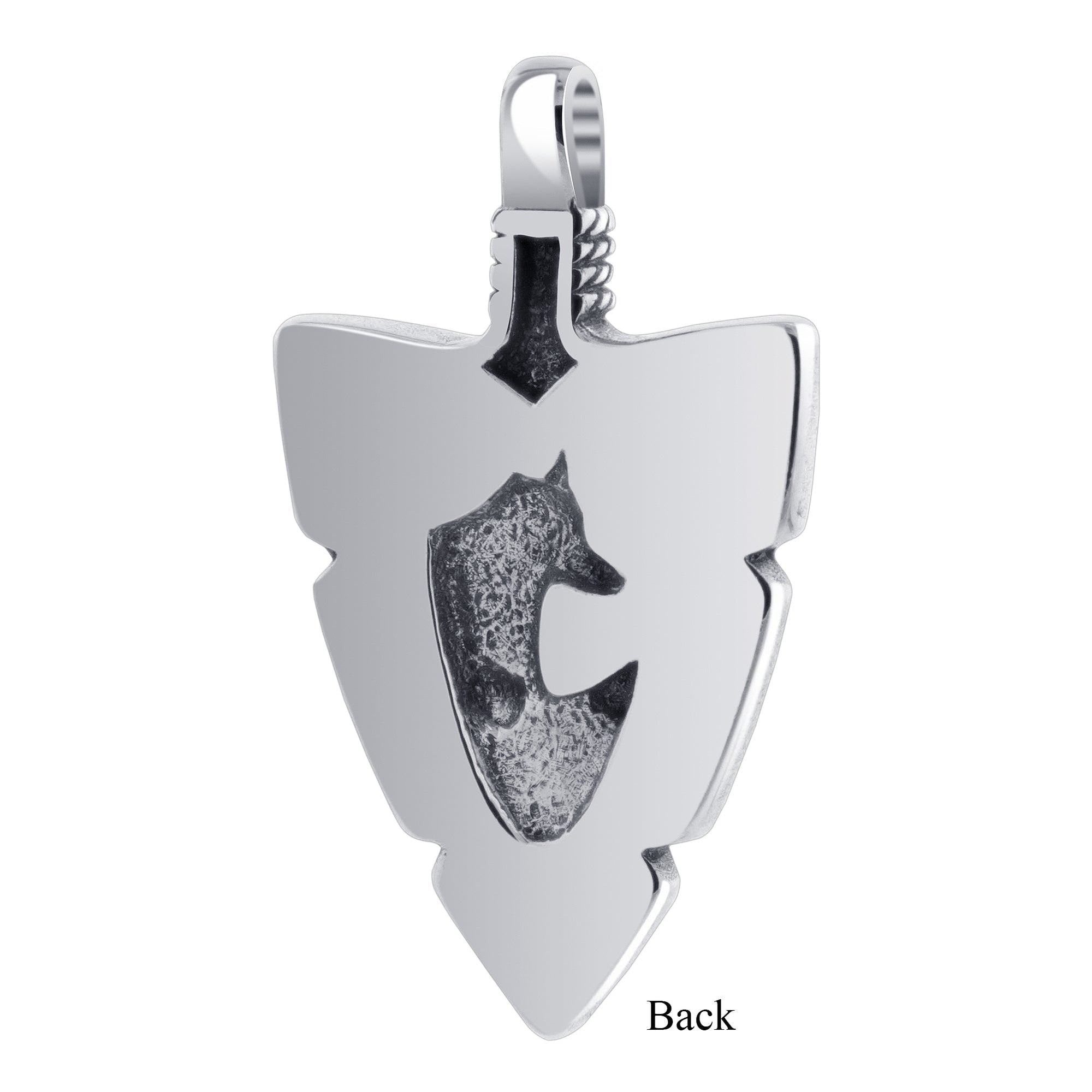 Crafted with quality chip inlay and a sterling silver pendant. This arrowhead-shaped pendant features the image of a wolf and a wolf's paw print.