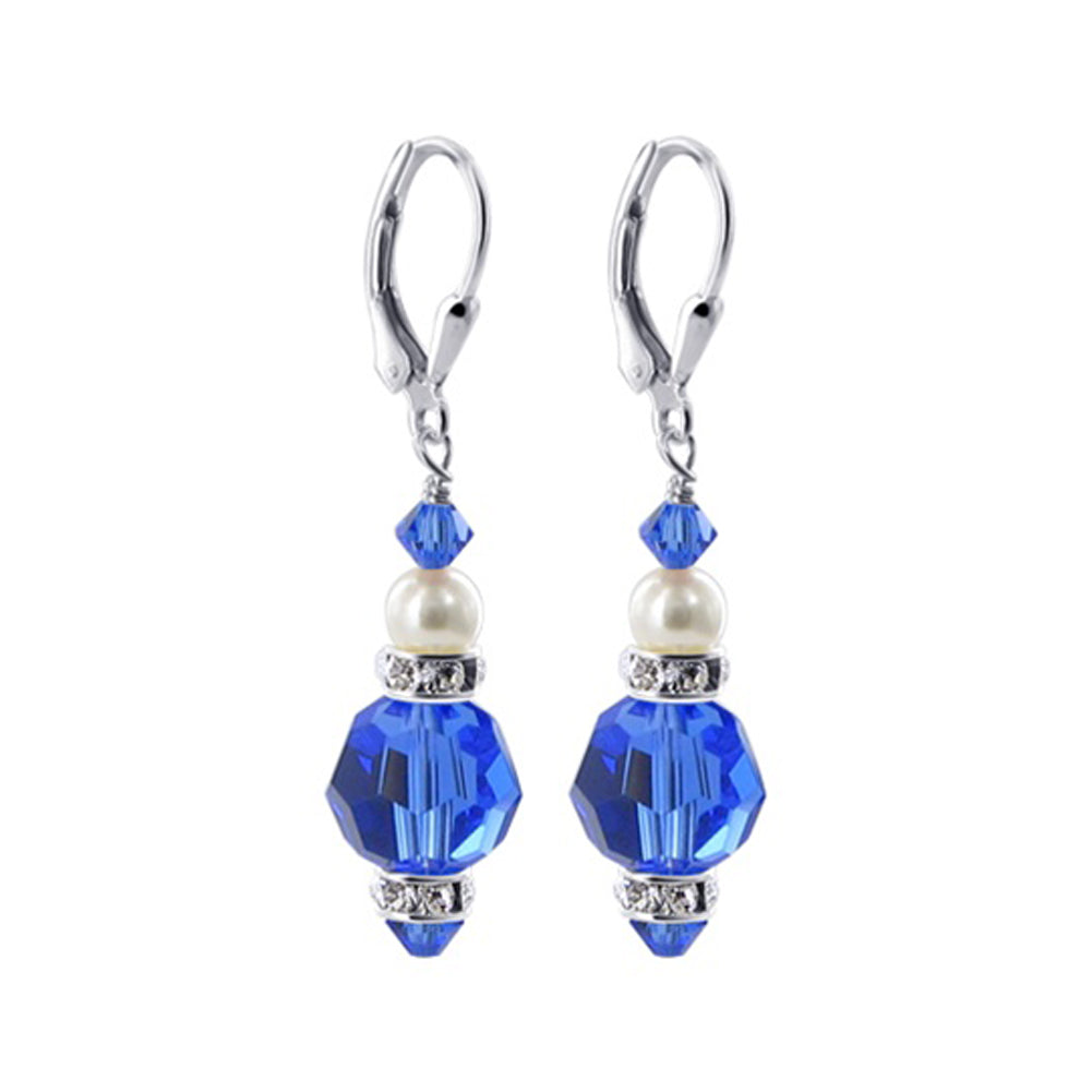 .925 Sterling Silver Dangle Earrings made with Austrian Crystals. Made with a 10mm multifaceted round crystal with 4mm bicones on the top and bottom of a 5mm imitation pearl with rondell bead decorations. 1.1-inch-long dangle earrings come with a sterling silver leverback finding.