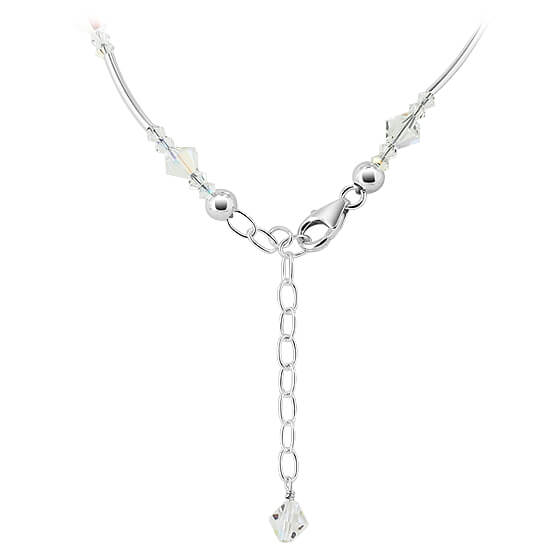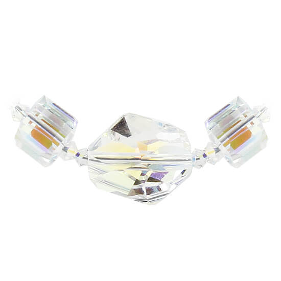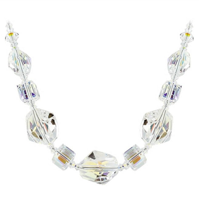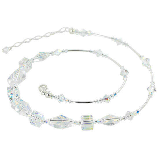 You will fall in love with this crystal necklace. Crafted from 925 sterling silver, the necklace features clear AB Austrian crystals. The crystals featured are 3 mm bicones with polygon and square shapes. This necklace comes with a lobster claw clasp to help secure it into place effectively. A wonderful addition to any jewelry collection, get yours now. Enhance your jewelry collection with this stunning sterling silver necklace featuring exquisite AB Austrian crystals in various geometric shapes.