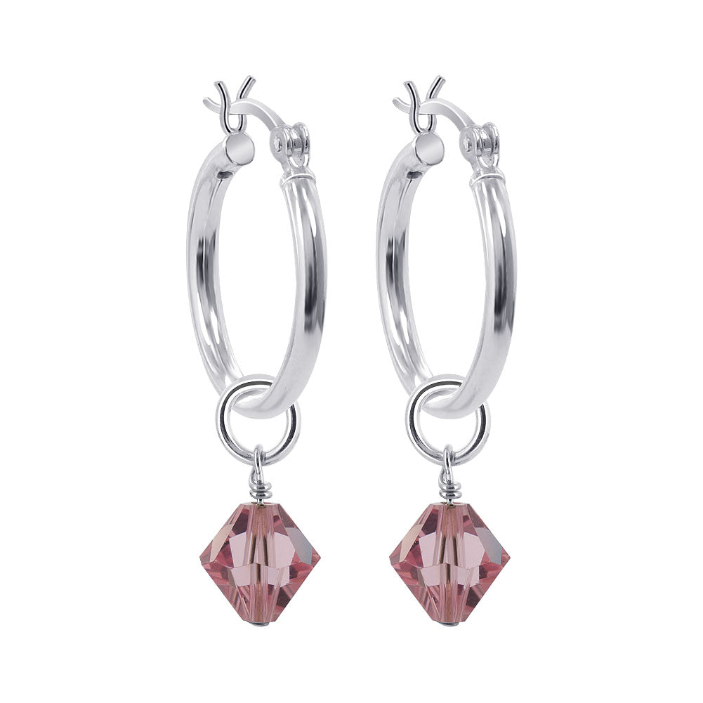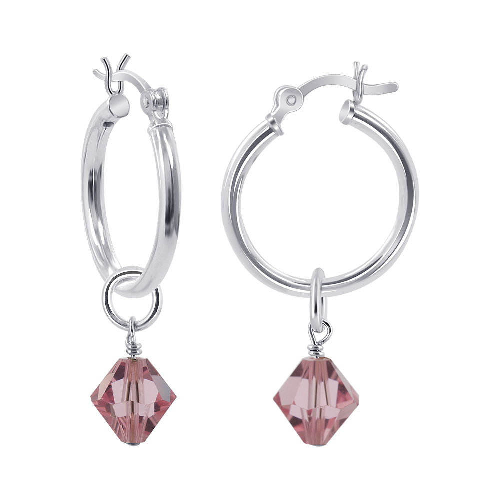 • description_tag : Fall in love with these elegant Crystal Bicone Hoop Earrings featuring 18mm sterling silver hoops. Each earring showcases a black bicone Austrian Crystal, adding a touch of glamour and sophistication. The ascending bicone design creates a unique look that gently sways with every step. Perfect for adding a stylish accent to any outfit. Explore our wide selection of colors to find the perfect match for your everyday wardrobe.