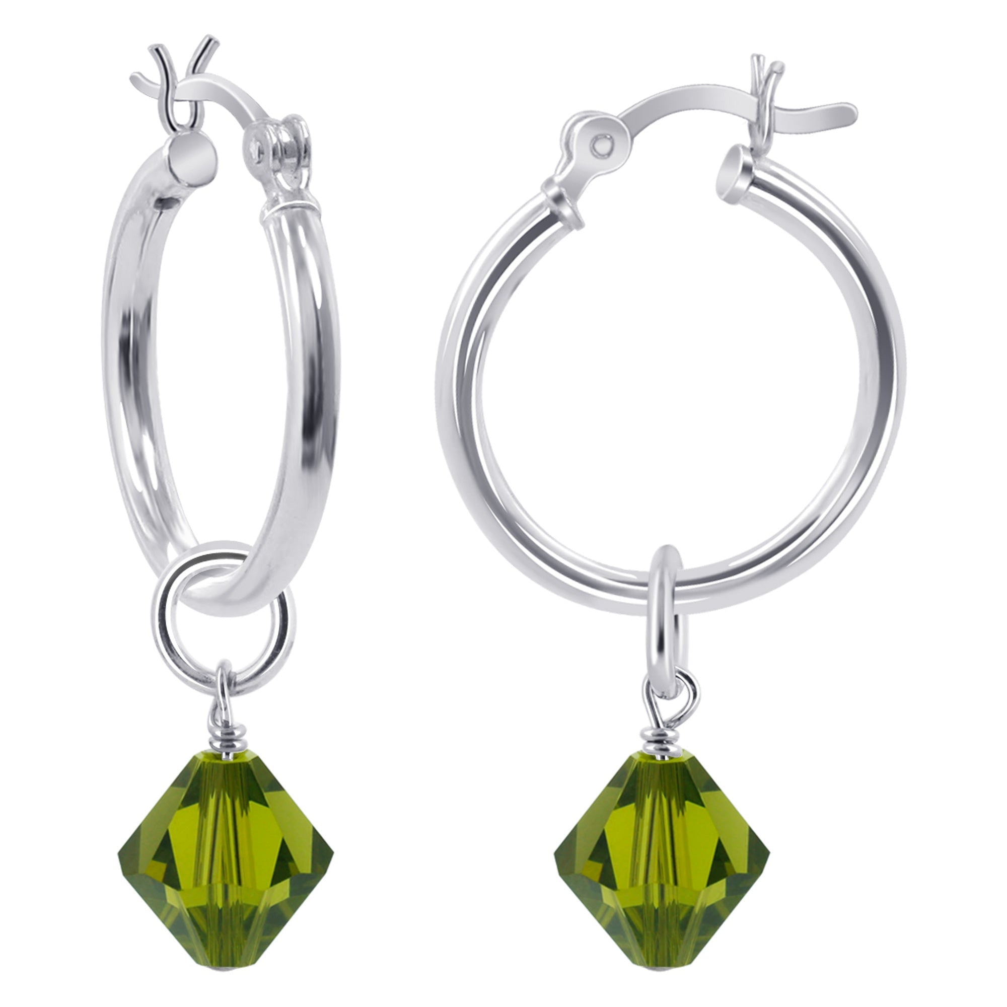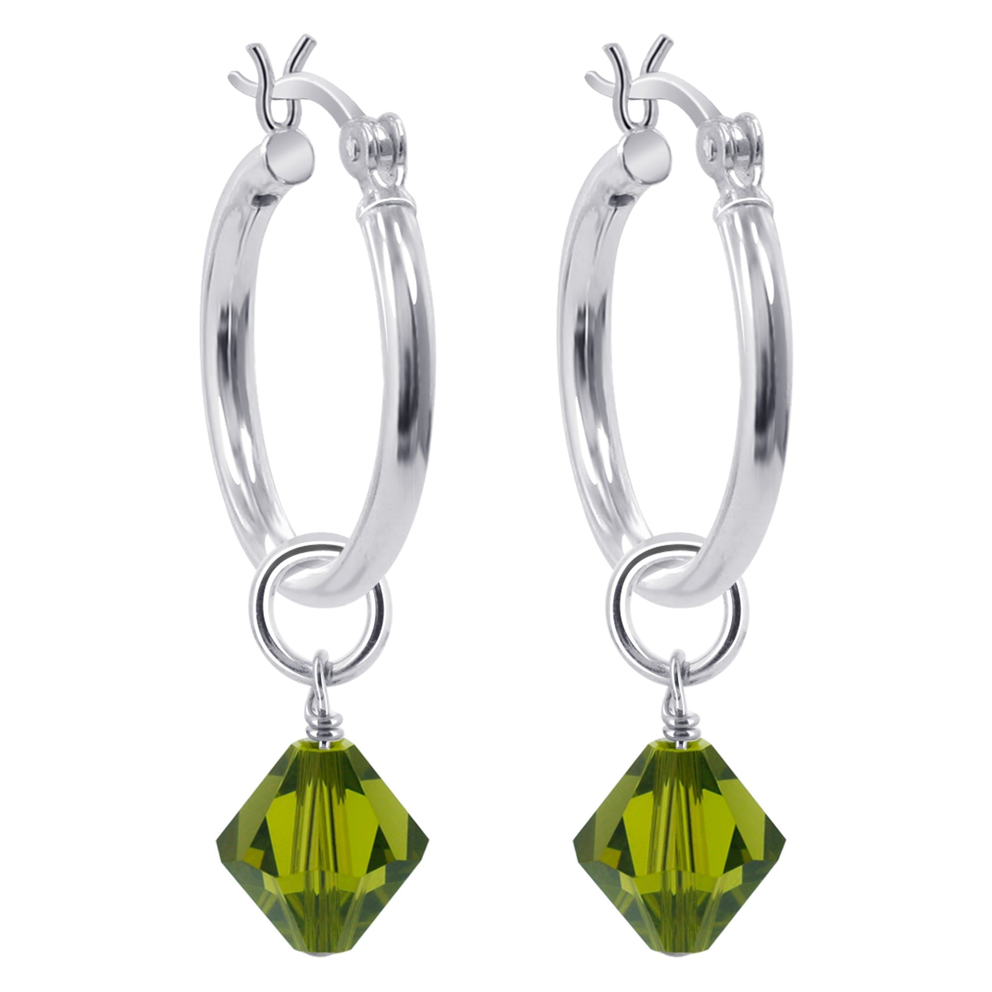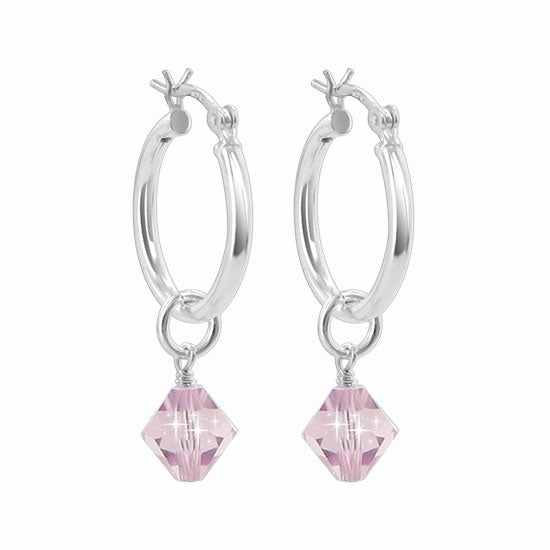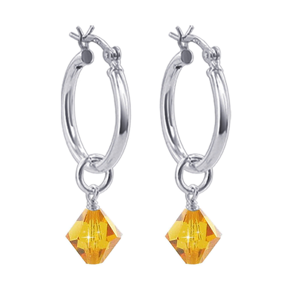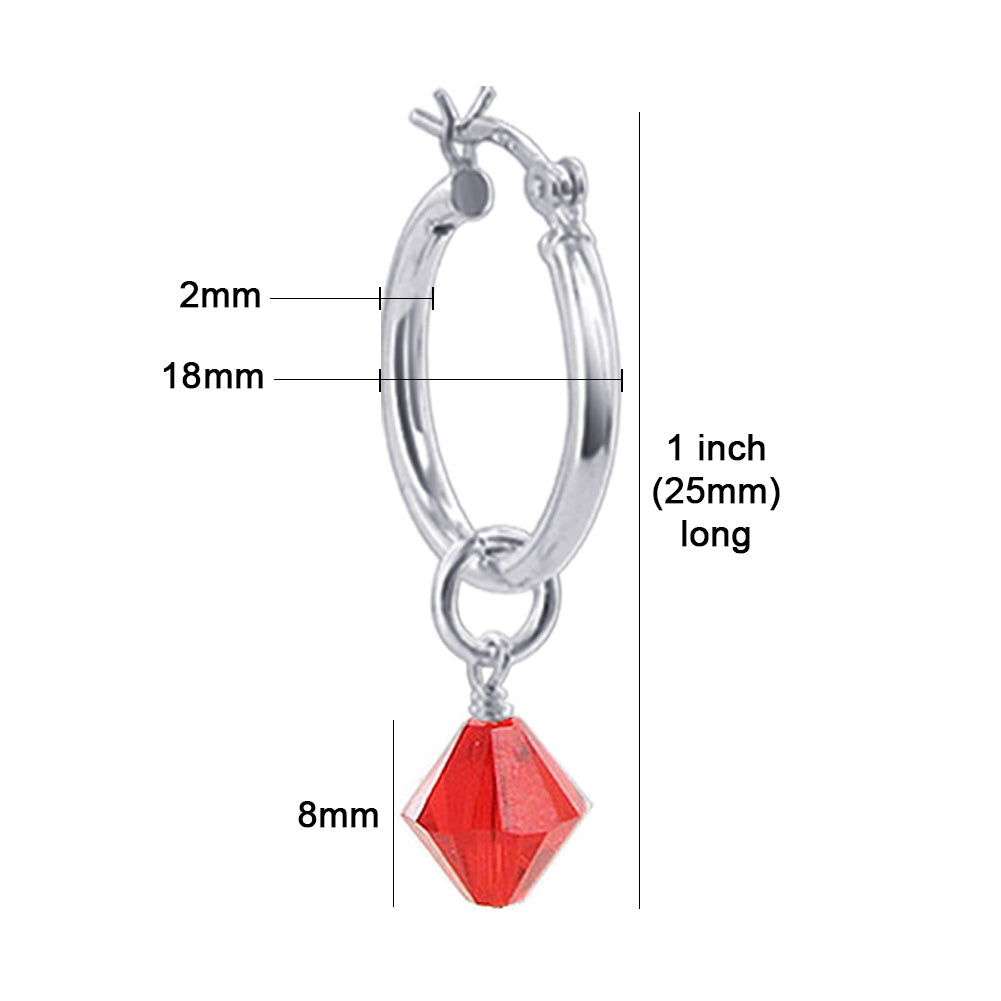You will fall in love with these Crystal Bicone 18mm diameter hoop earrings. These earrings feature a black bicone by Austrian Crystals, dangling from a sterling silver hoop earring, giving them a touch of glamour.