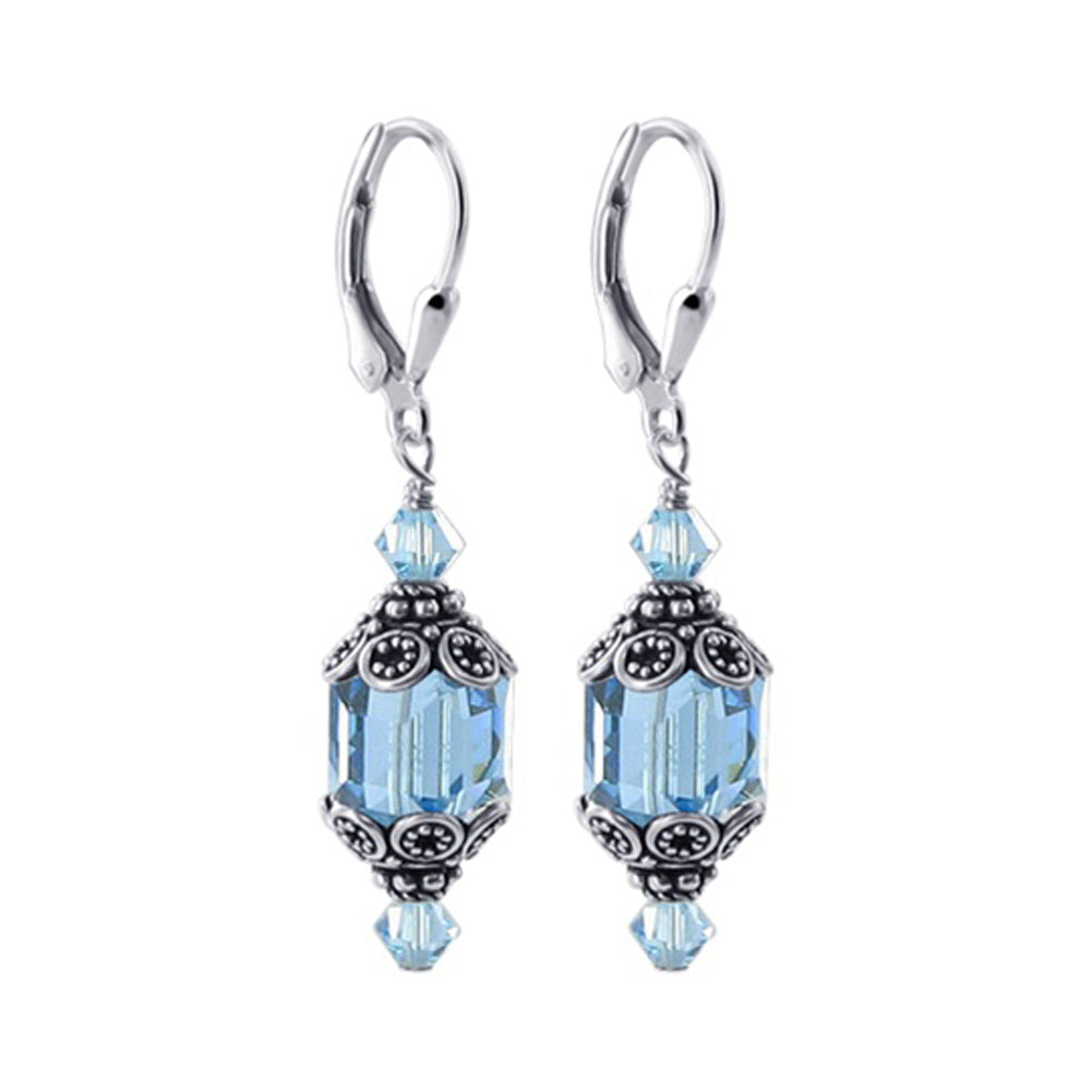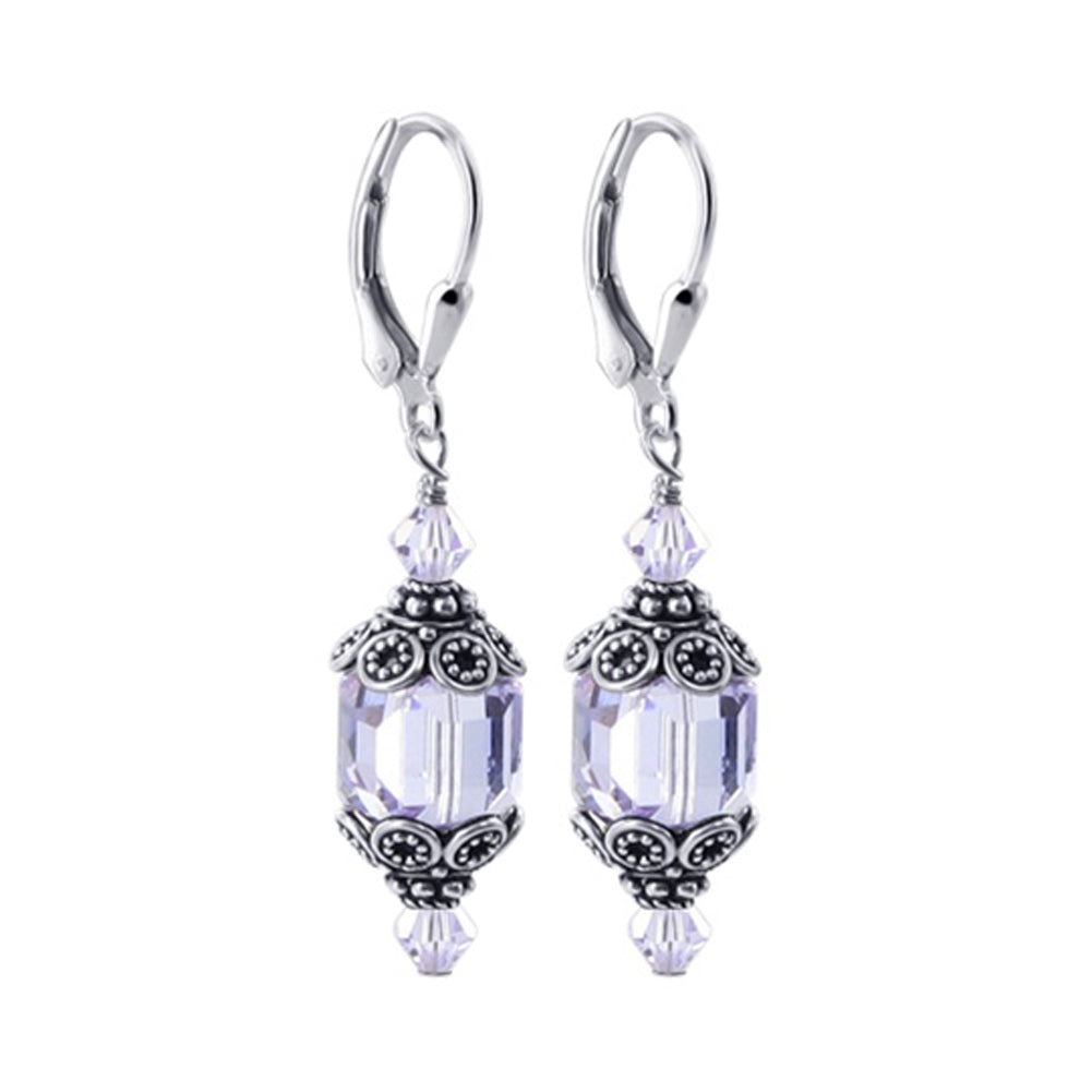 925 Sterling Silver Vintage Style Dangle Earrings made with Austrian Crystals. Made with 8mm Multifaceted Round Crystal with 4mm Bicone on top and bottom of Sterling Silver Bali Bead Cap decorations. 1 inch long dangle earrings come with sterling silver leverback findings.