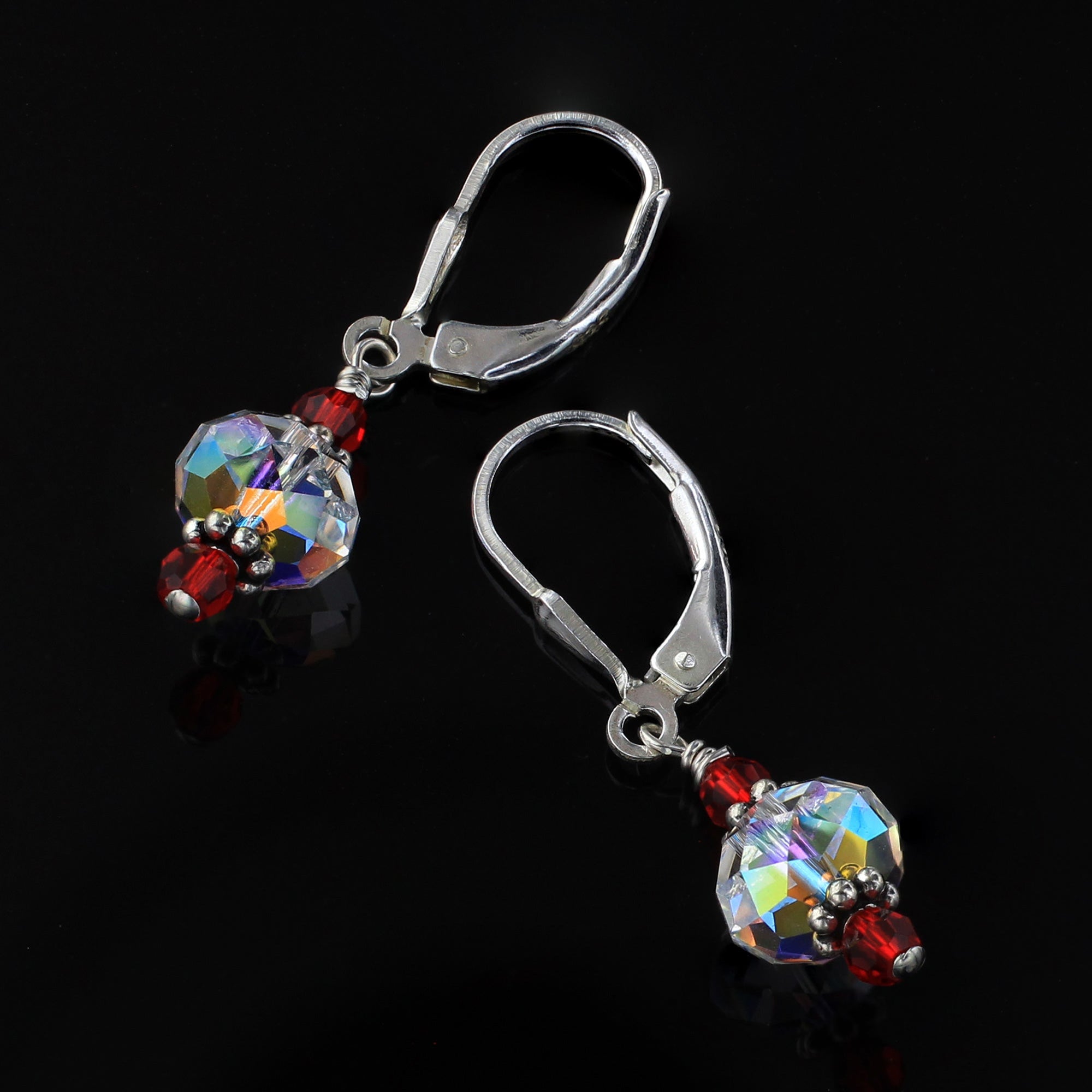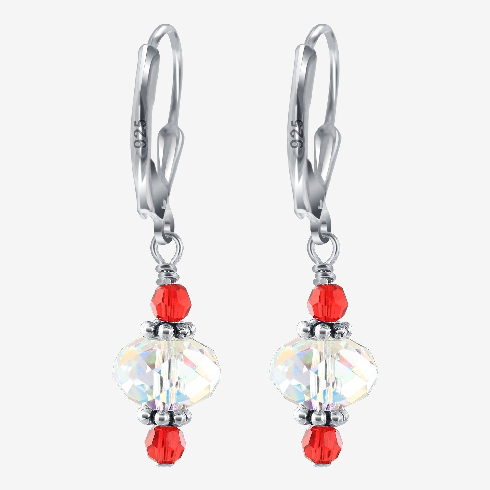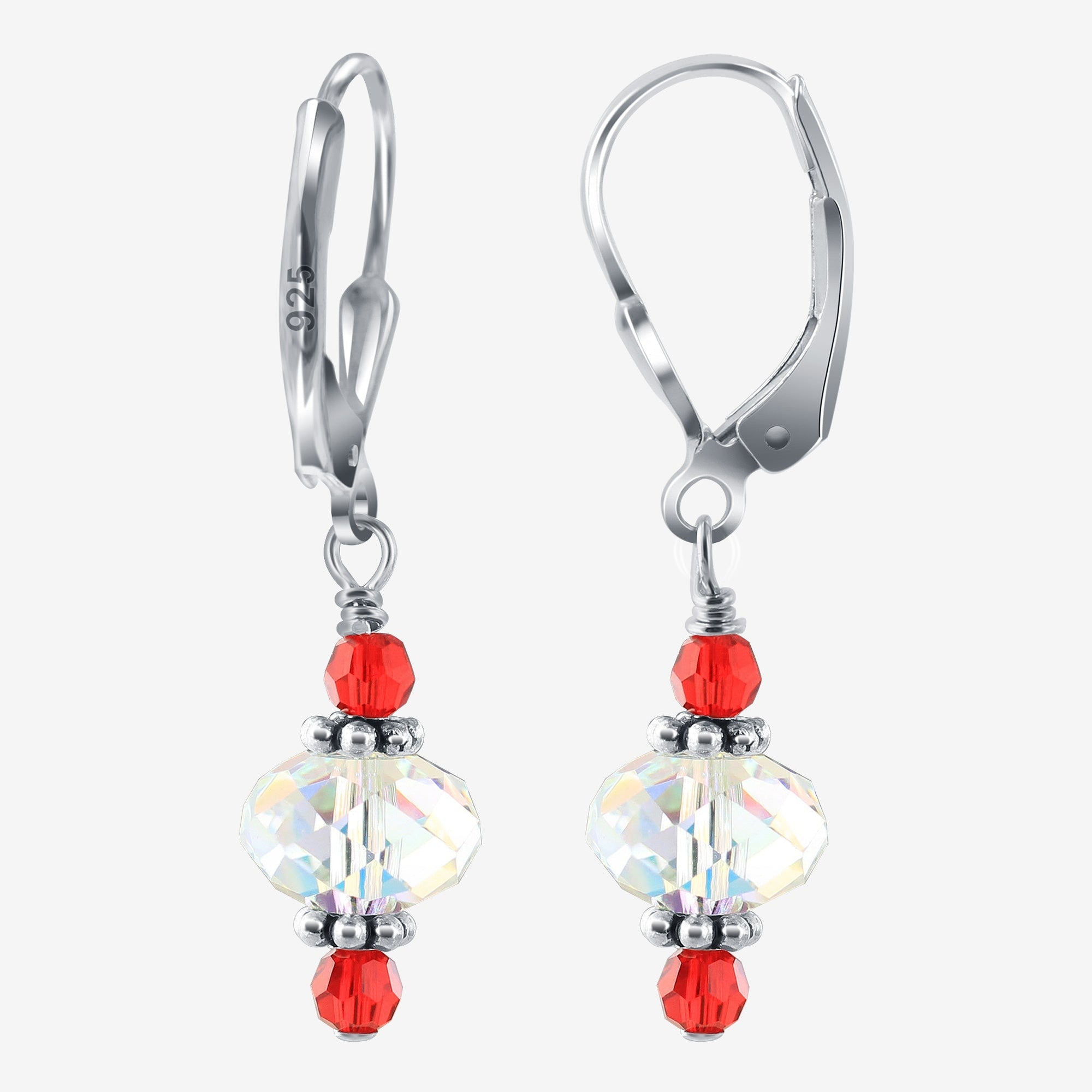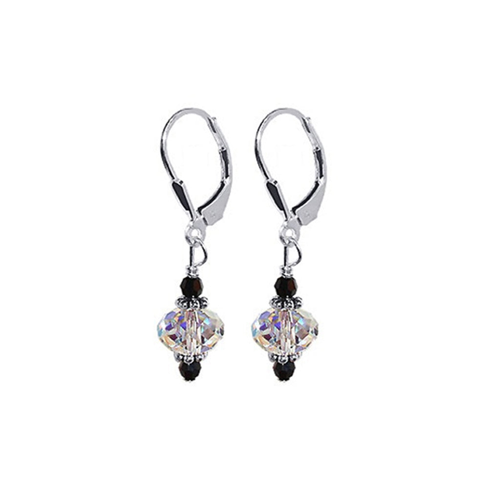These 925-sterling silver dangle and drop earrings are composed of 100% black and iridescent Austrian Austrian crystal elements. Adorning each end of the iridescent crystal are 6 mini silver beads. Each pair of earrings measures about 1.5 inches long from top to bottom.