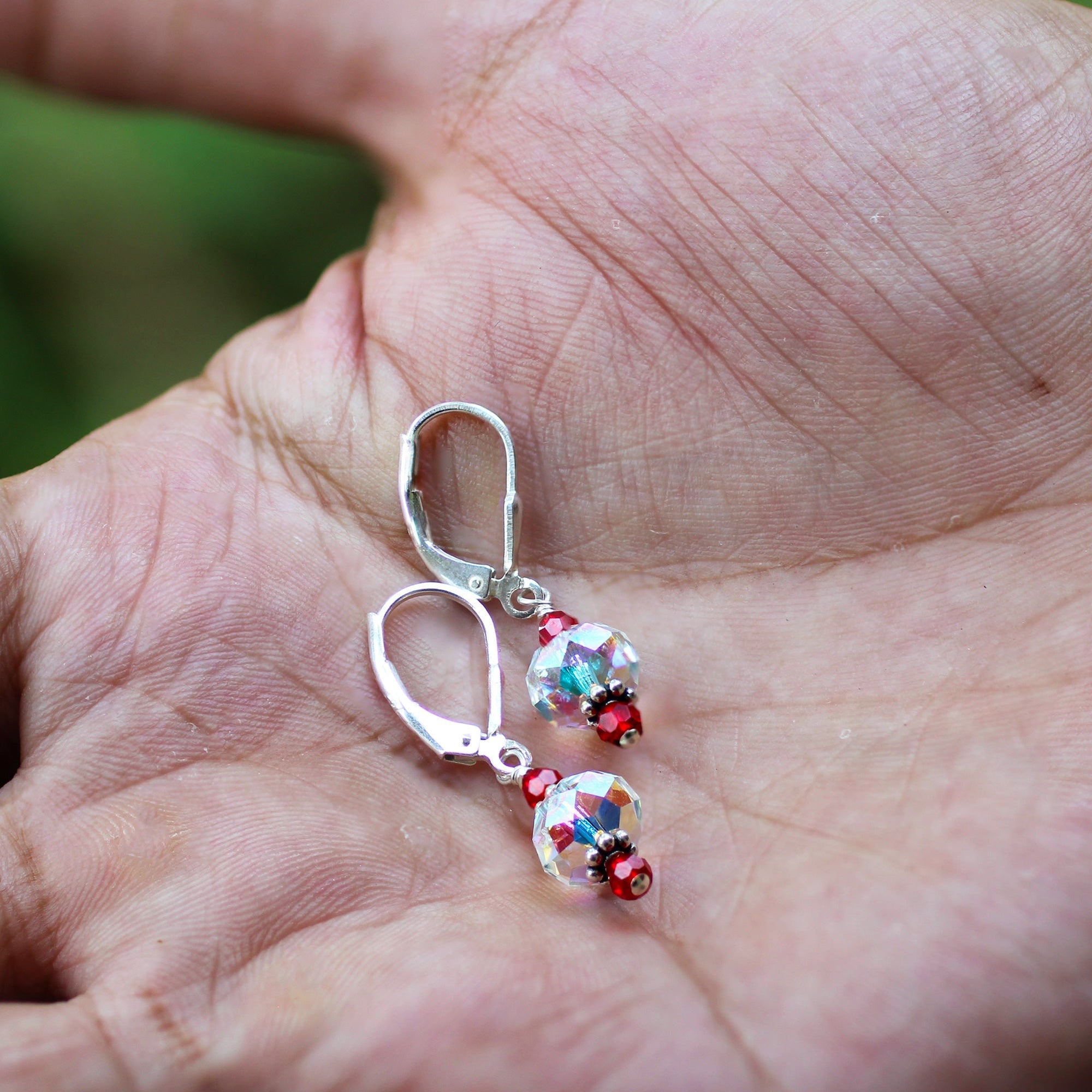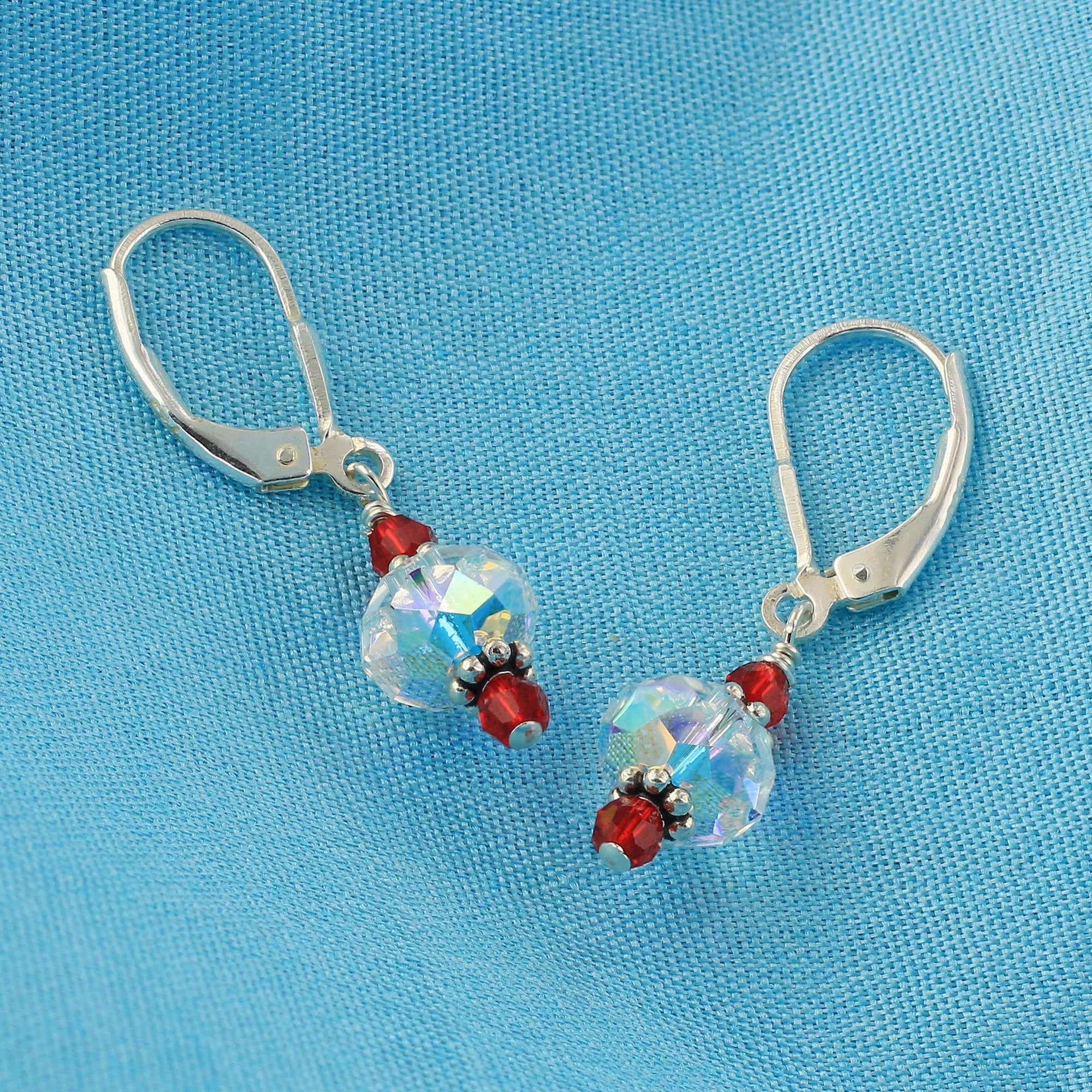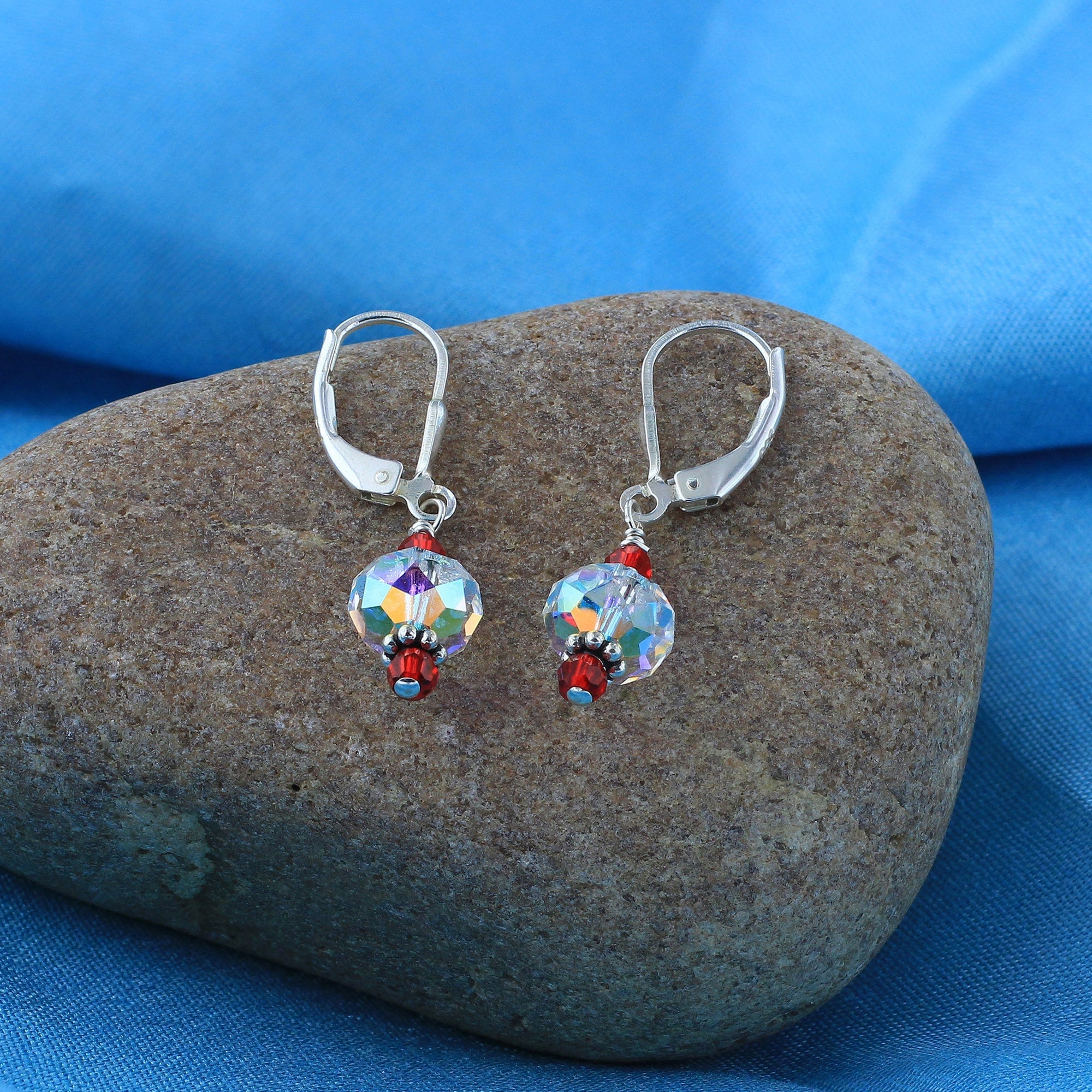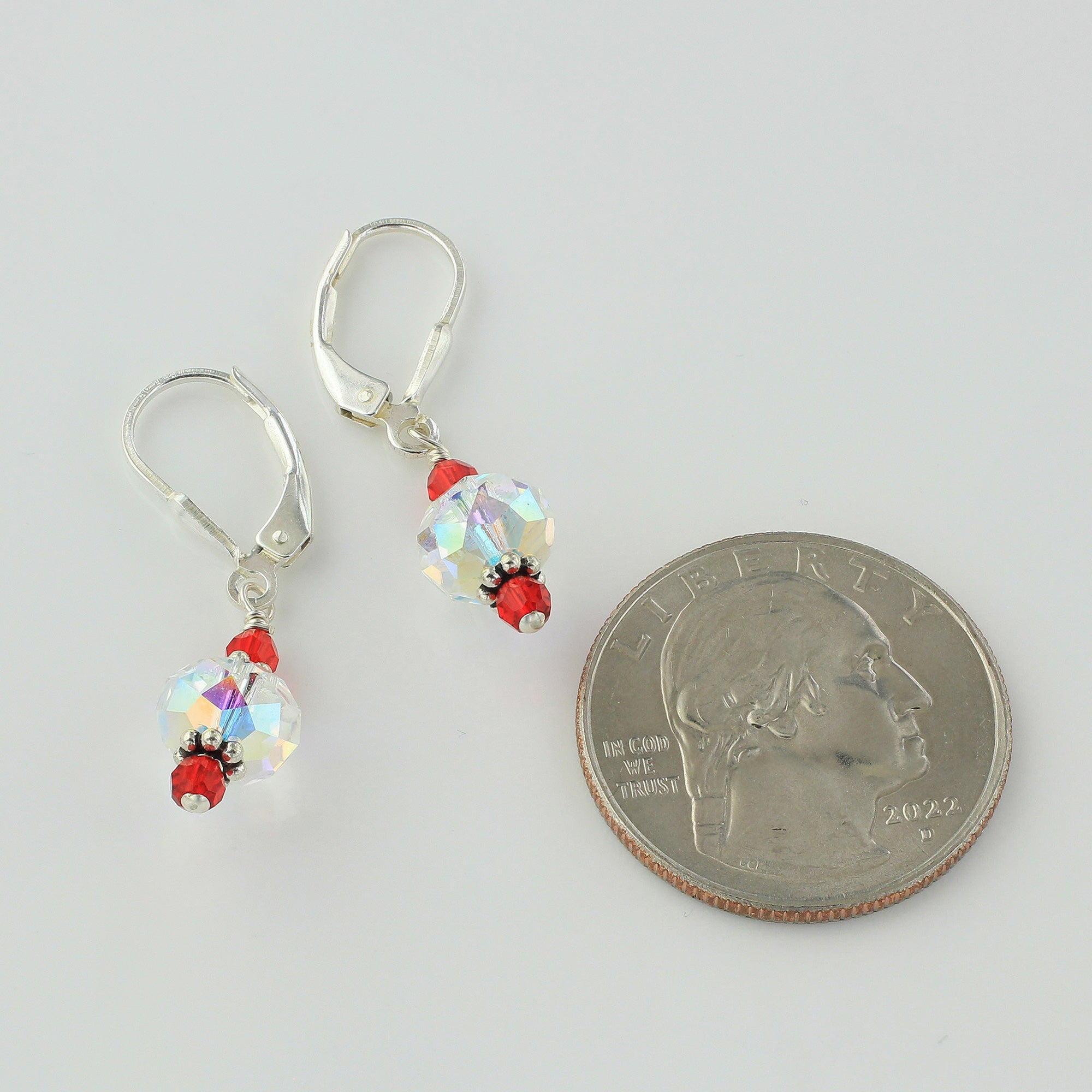 These 925-sterling silver dangle and drop earrings are composed of 100% black and iridescent Austrian Austrian crystal elements. Adorning each end of the iridescent crystal are 6 mini silver beads. Each pair of earrings measures about 1.5 inches long from top to bottom.