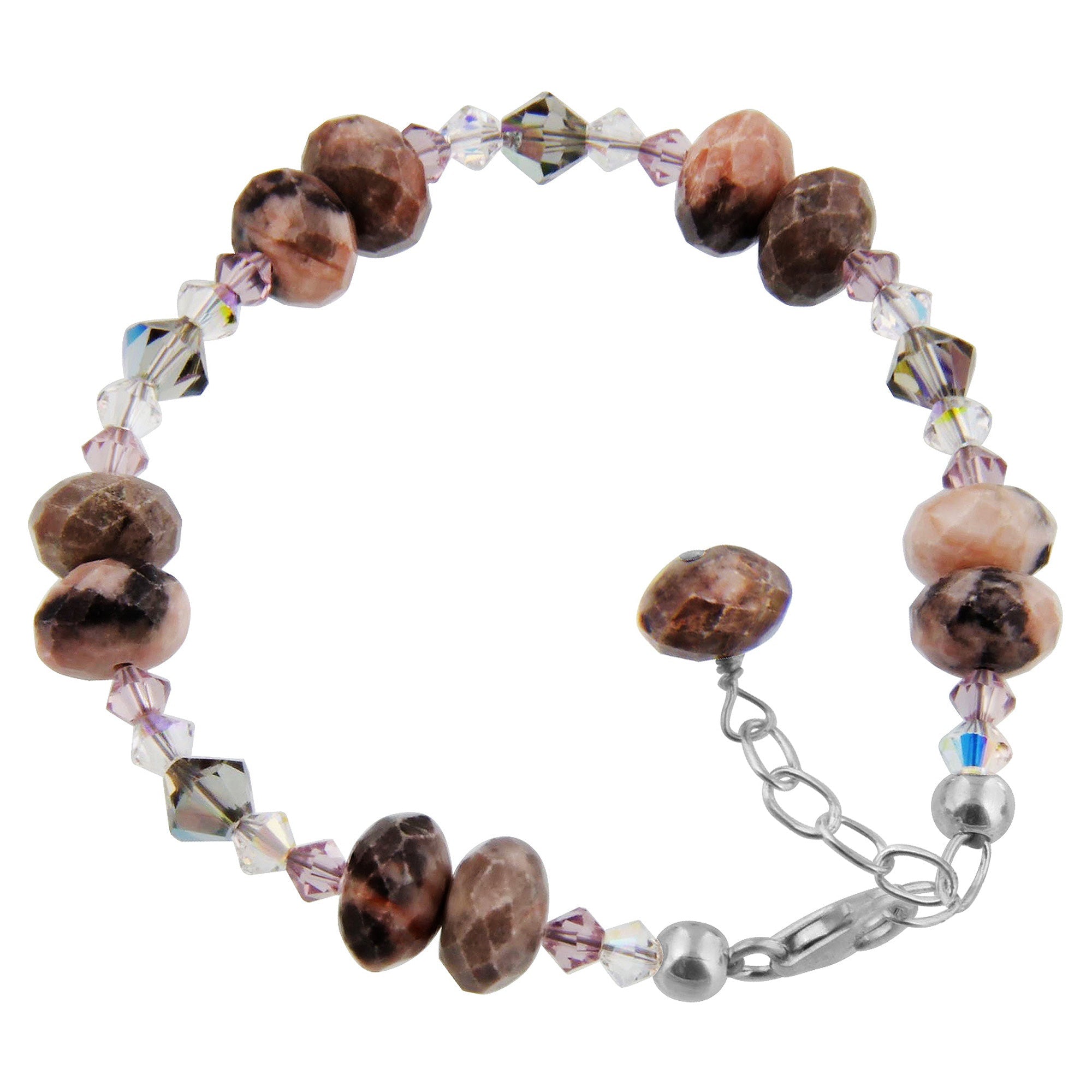 Crafted with 925 sterling silver and shades of pink and purple Austrian crystals. This bracelet is adjustable from 7 inches to 9 inches. Comes with a secure lobster claw clasp. Be it for yourself or as a gift to someone.