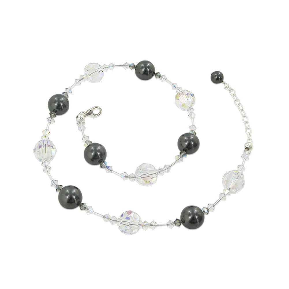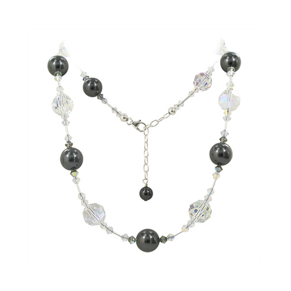 Glittering like diamonds, this fabulous crystal and pearl necklace will delight all those around you. Crafted from .925 sterling silver, the necklace is made up of multiple 4mm bicone crystals in clear AB and black 12mm round clear AB crystals, and 12mm black Austrian pearls.