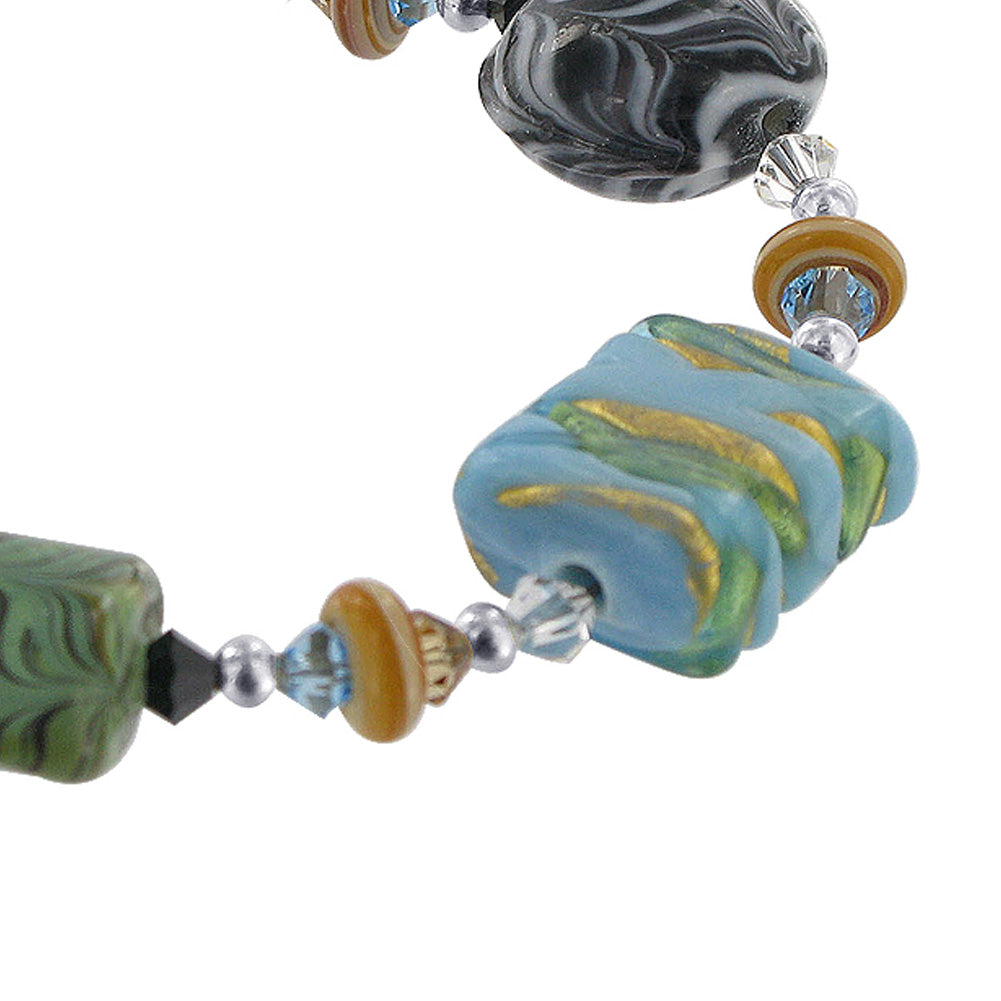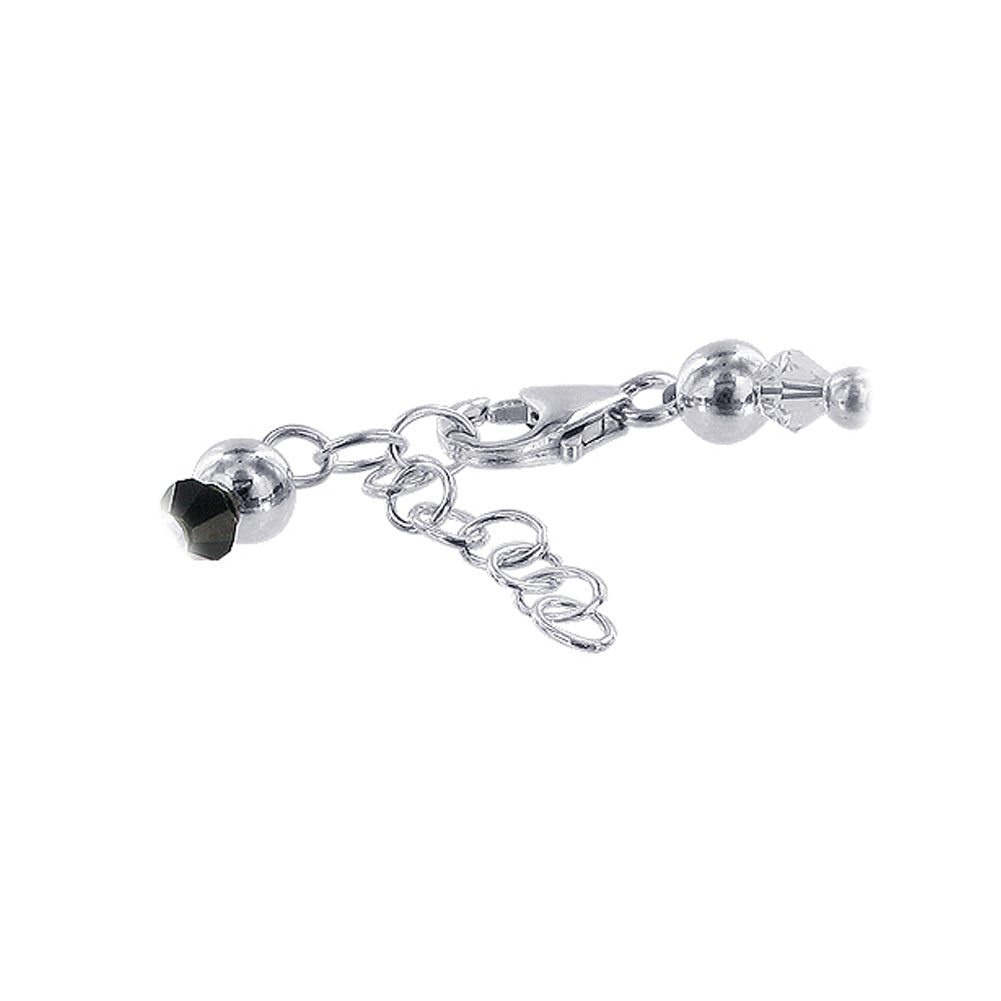 The bracelet is crafted from 925 sterling silver and features blown glass beads adorned with multicolor Austrian crystals. It is lightweight at only 0.025 gram.