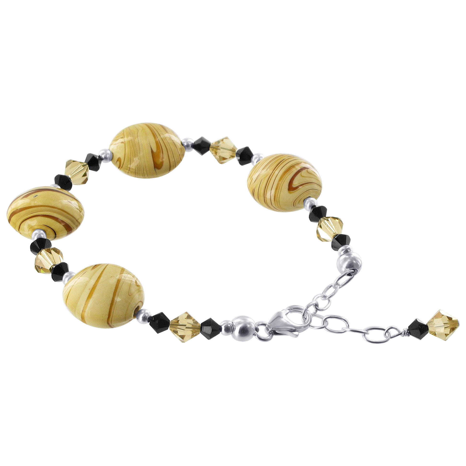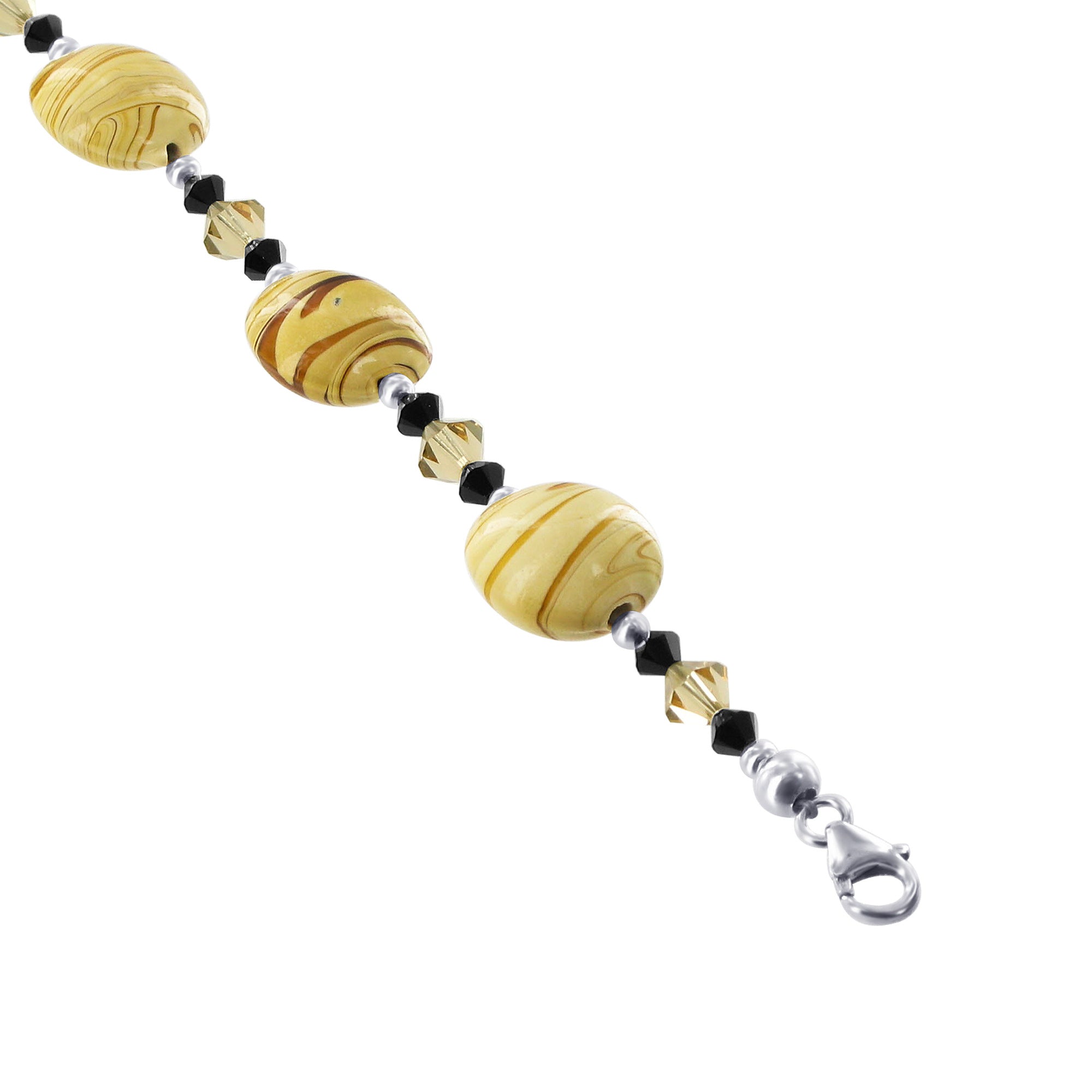 This bracelet is crafted from solid 925 sterling silver and features blown glass beads adorned with multicolor Austrian crystals. It is lightweight at 0.025 gram and designed to fit most wrists comfortably.
