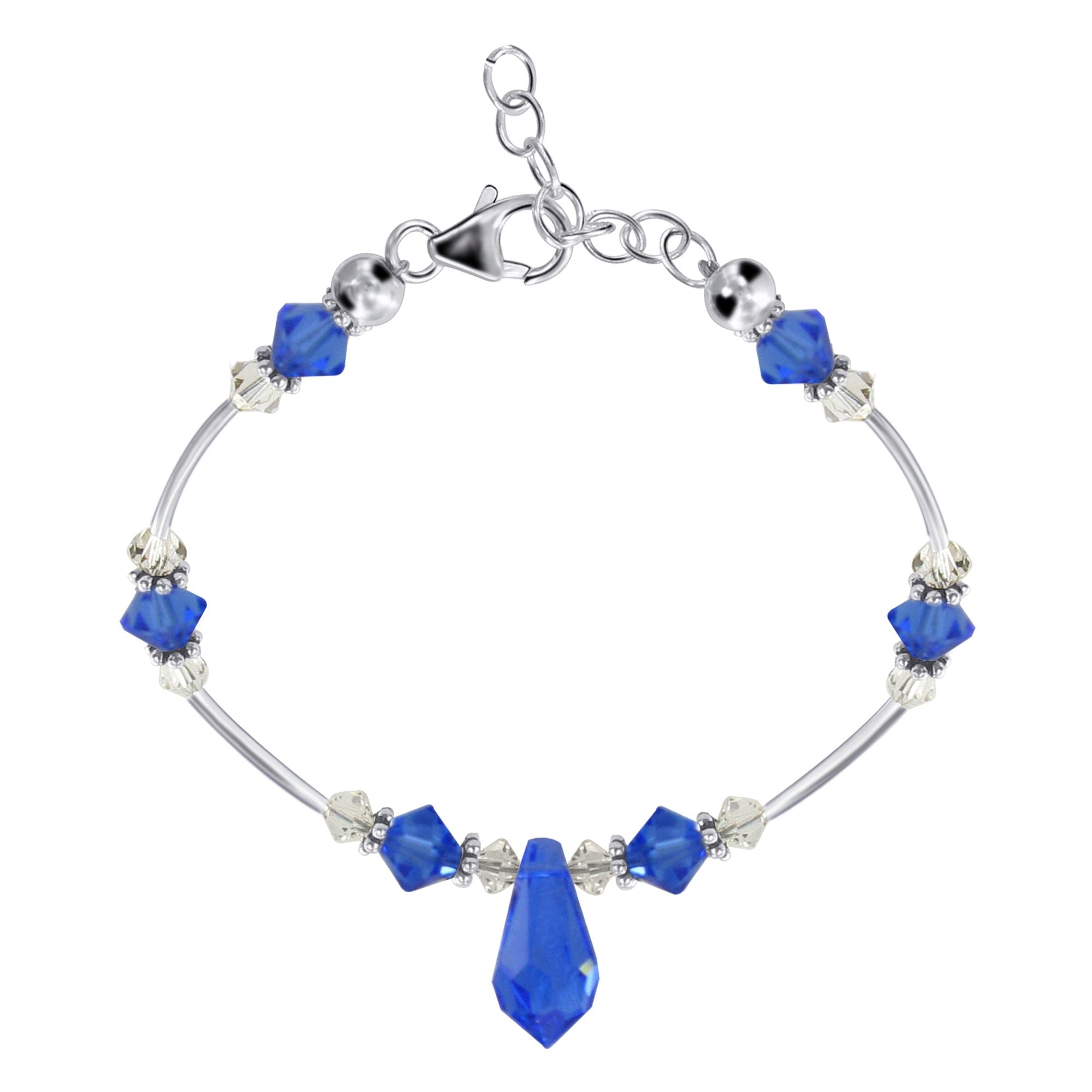 In the middle of the bracelet is a teardrop-shaped blue crystal measuring 11mm long. The bracelet is adjustable from 7" to 8.5" and comes with a lobster claw clasp to help secure it into place.