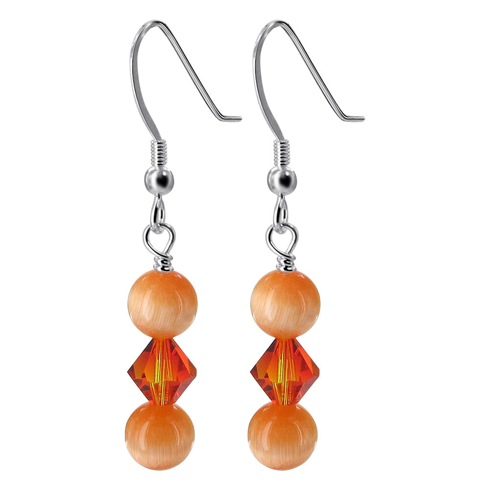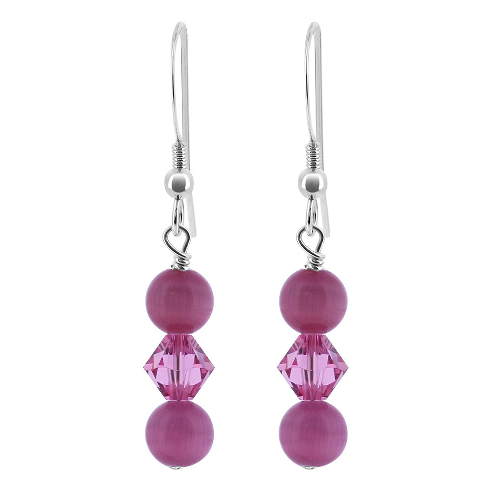 Delightfully colorful, these crystal and cat's eye bead earrings are sure to put you into the spotlight. Crafted from .925 sterling silver, the earrings feature two 6mm round cat's eye beads that surround a 6mm bicone Austrian crystal that rests in the middle. The earrings measure a total of 1.5 inches long and come with French ear wire hooks to help secure them into place.