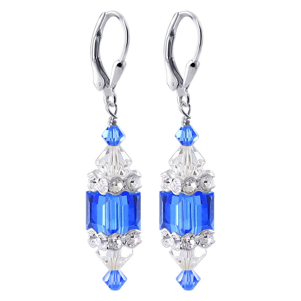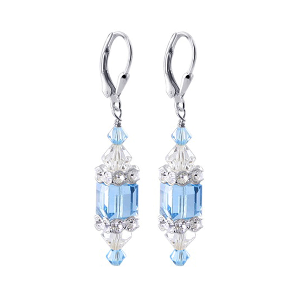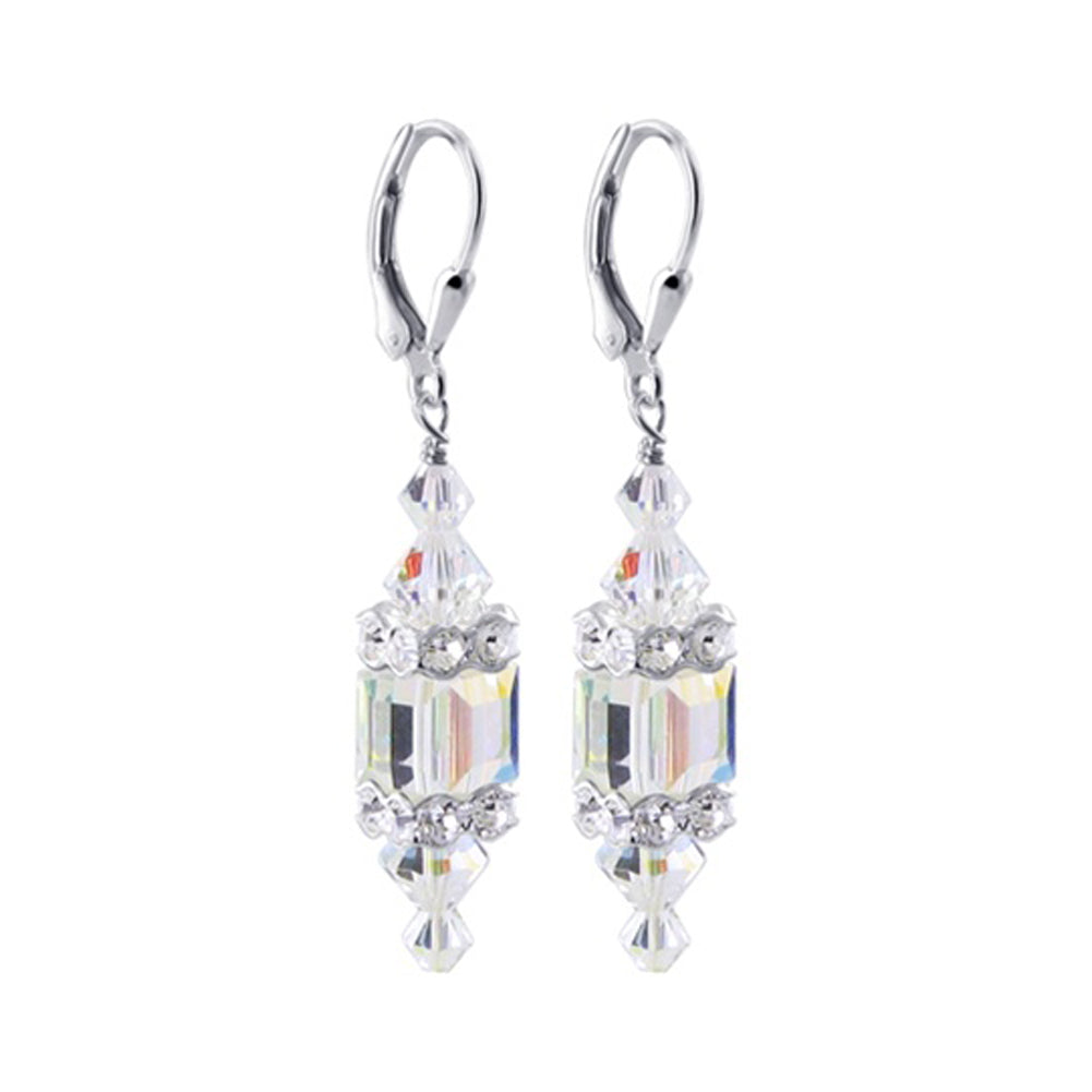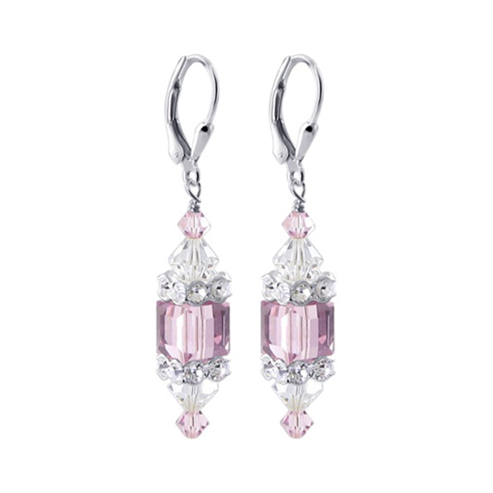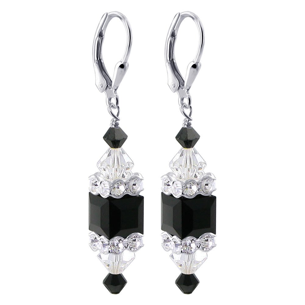 925 Sterling Silver Dangle Earrings made with Austrian Crystals. Made with an 8mm multifaceted cube crystal with 3mm and 6mm crystal bicones, respectively, on top and bottom with 3mm rondell bead decorations. 1.3-inch-long dangle earrings come with sterling silver leverback findings.