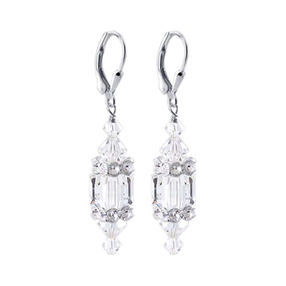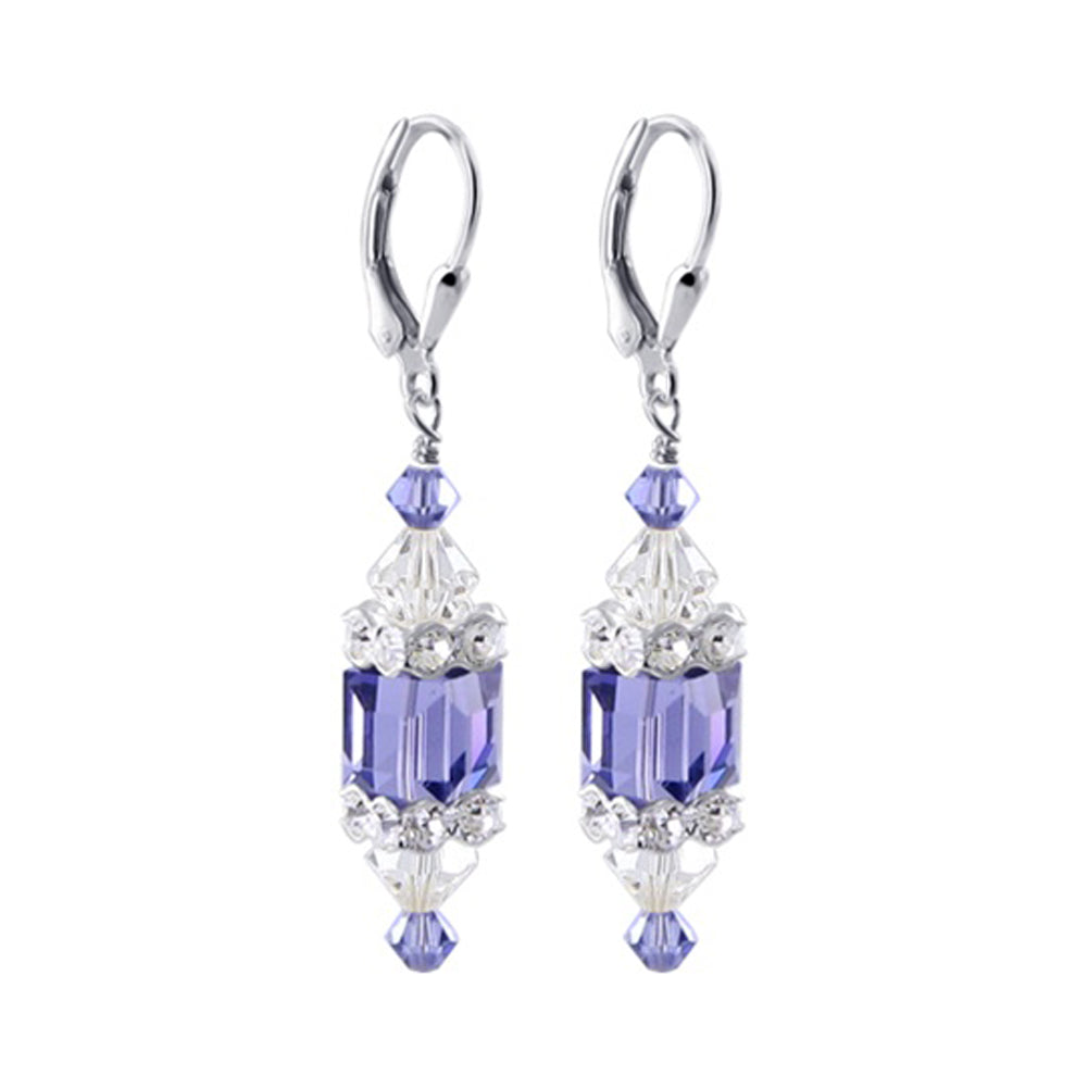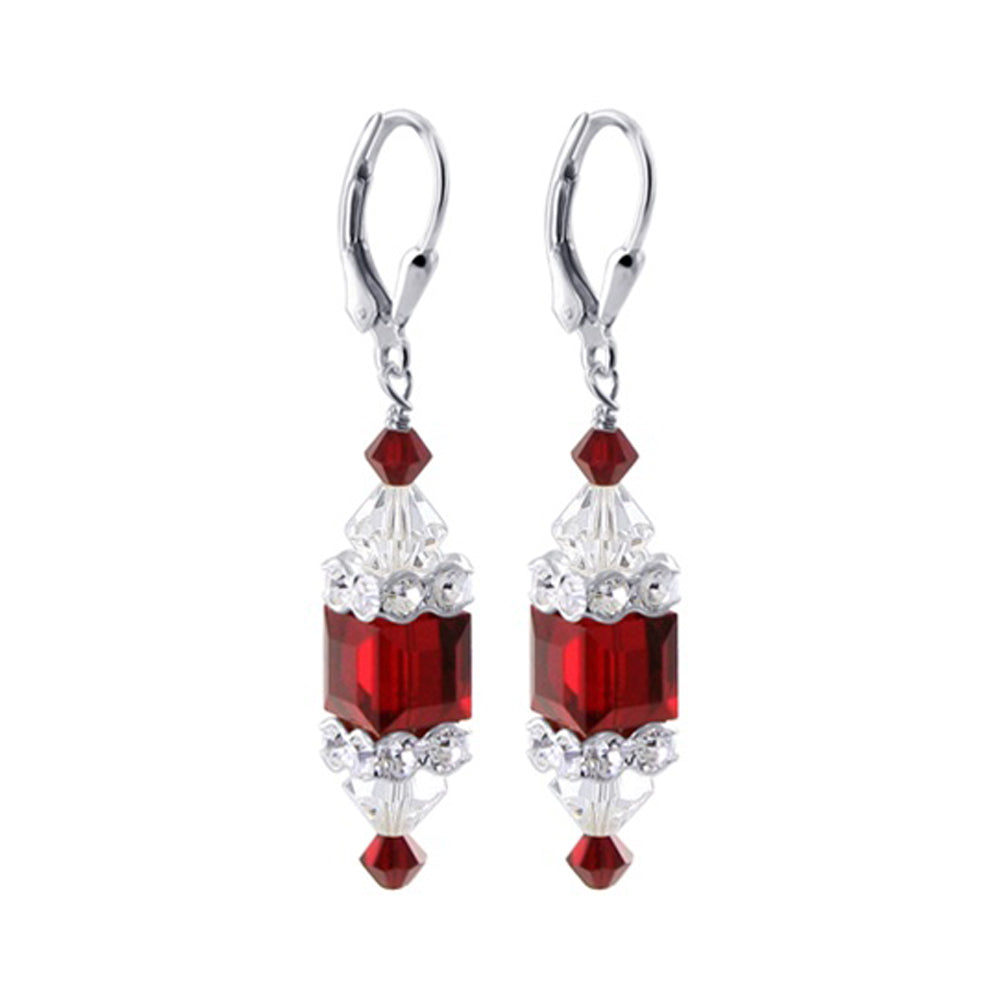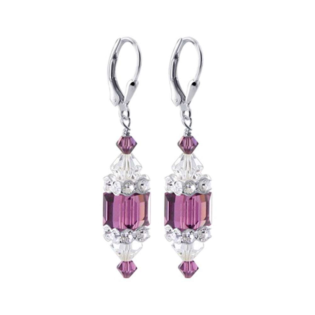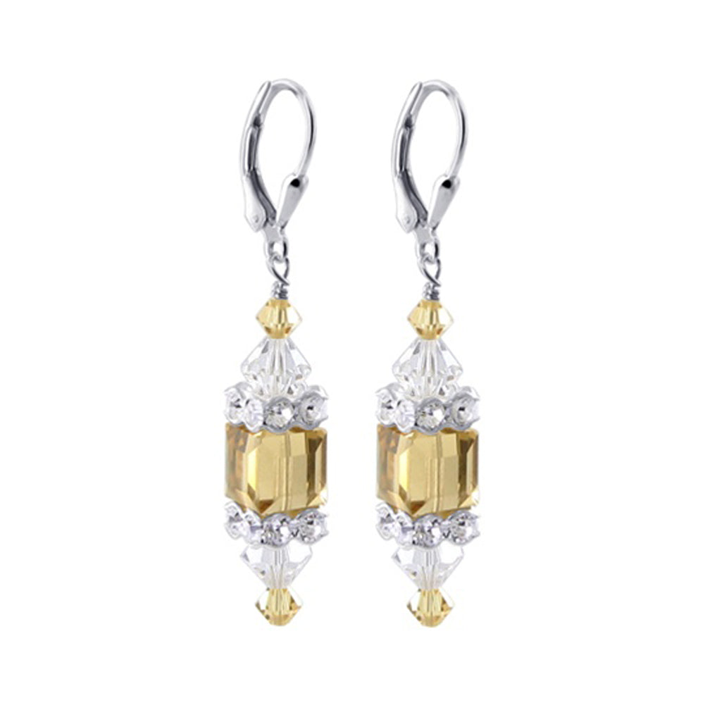 925 Sterling Silver Dangle Earrings made with Austrian Crystals. Made with an 8mm multifaceted cube crystal with 3mm and 6mm crystal bicones, respectively, on top and bottom with 3mm rondell bead decorations. 1.3-inch-long dangle earrings come with sterling silver leverback findings.