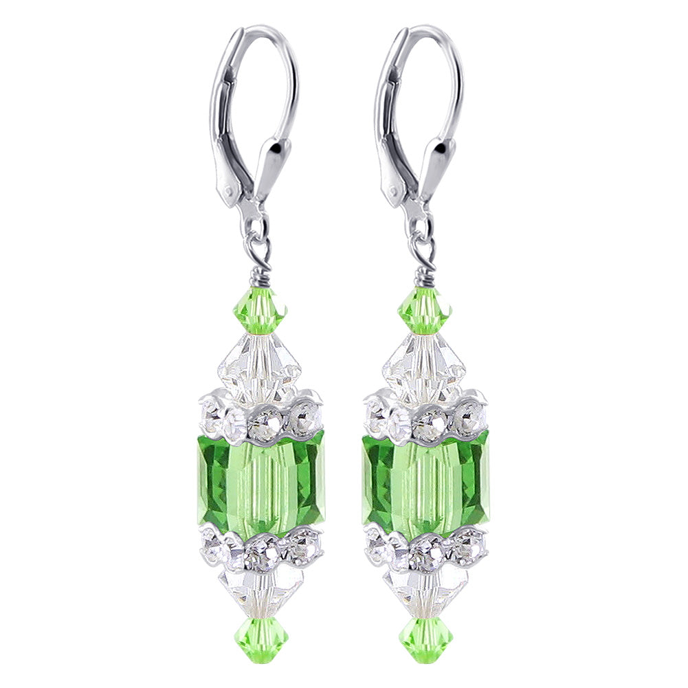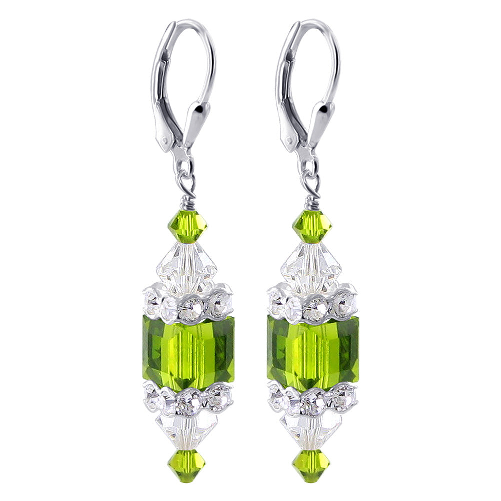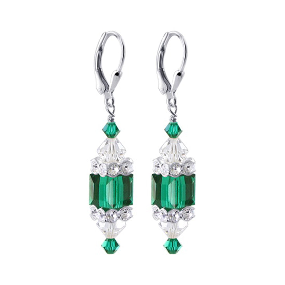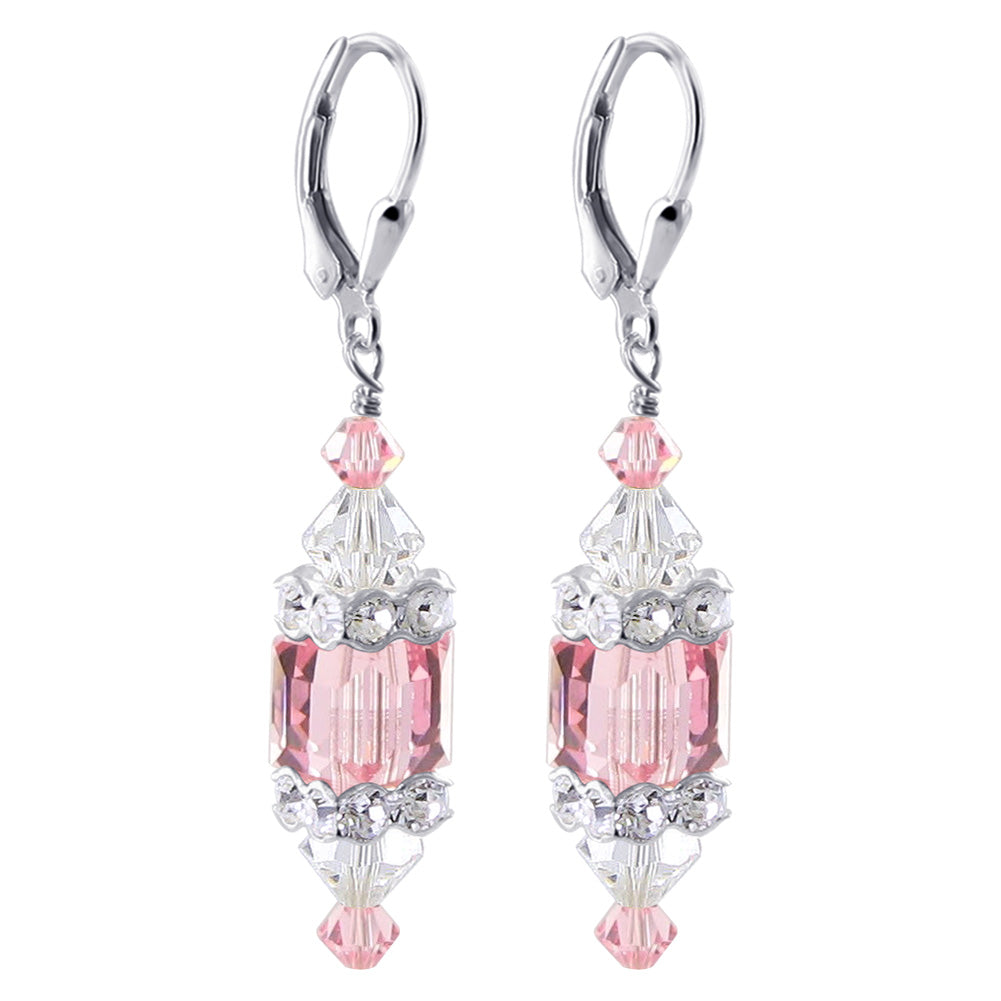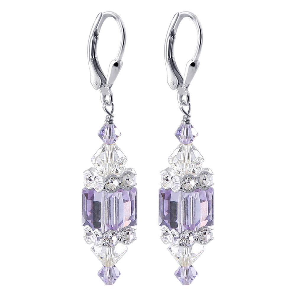 925 Sterling Silver Dangle Earrings made with Austrian Crystals. Made with an 8mm multifaceted cube crystal with 3mm and 6mm crystal bicones, respectively, on top and bottom with 3mm rondell bead decorations. 1.3-inch-long dangle earrings come with sterling silver leverback findings.