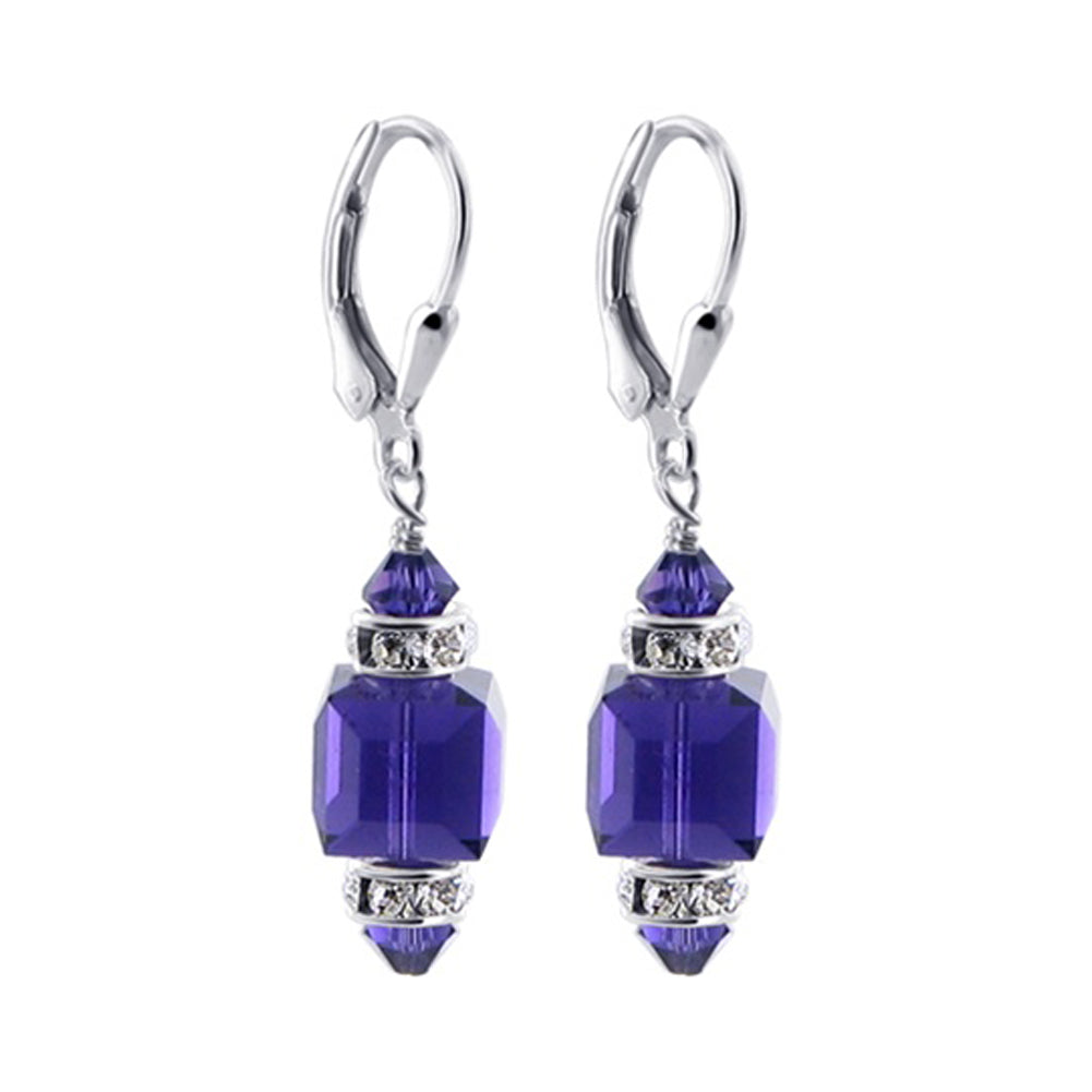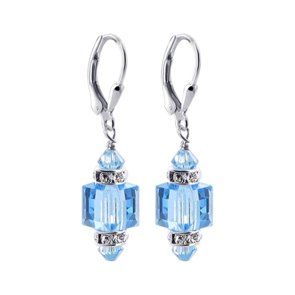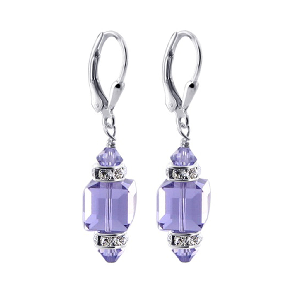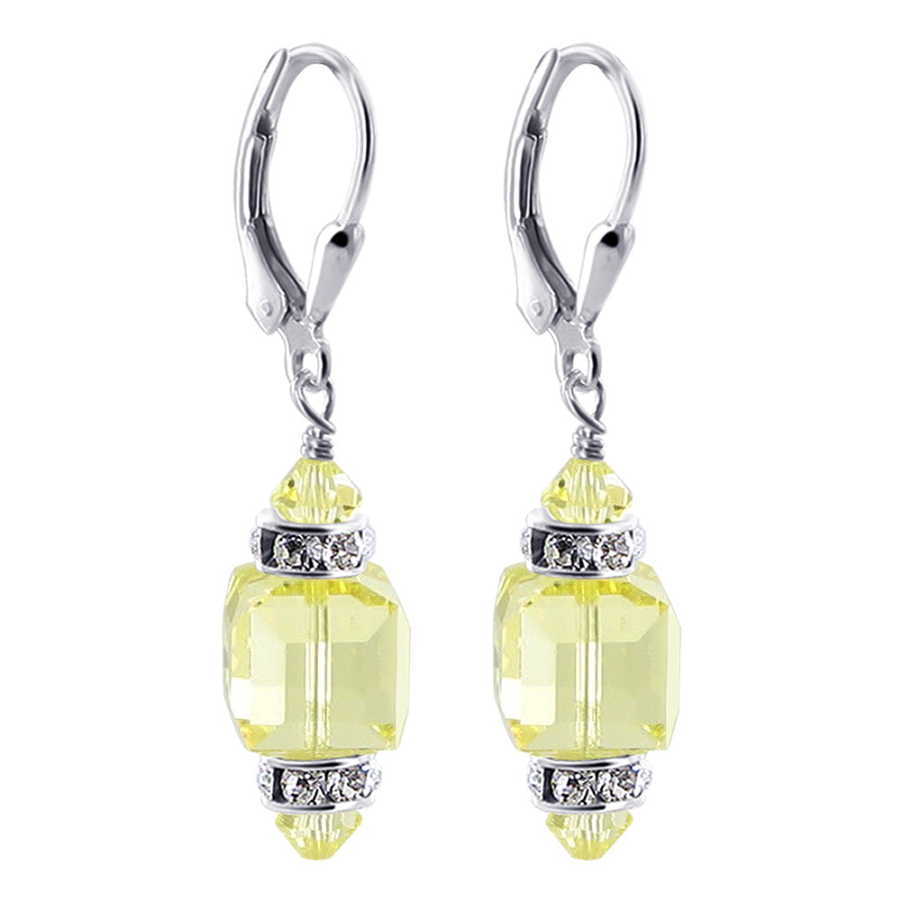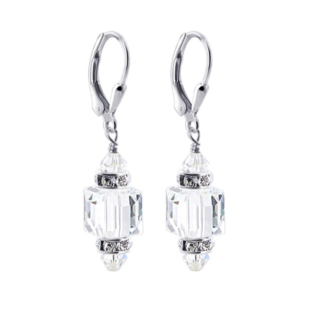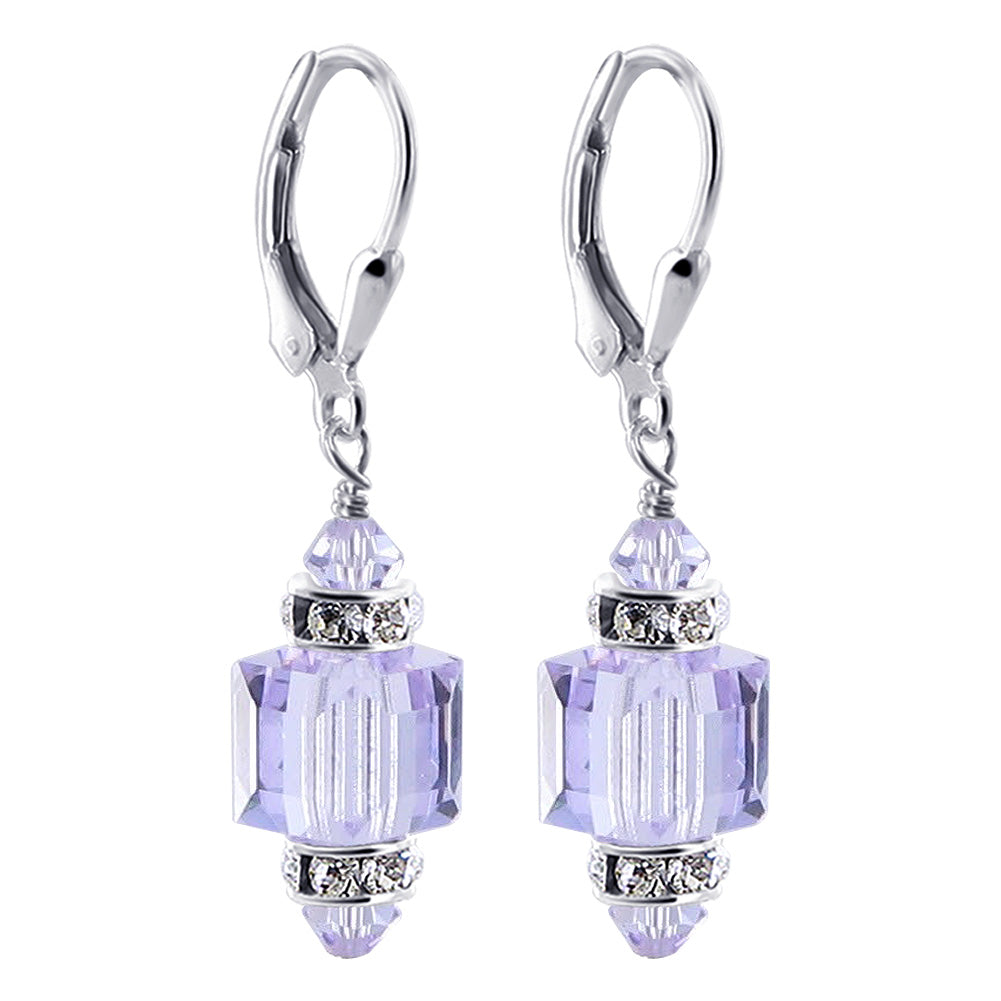 925 Sterling Silver Dangle Earrings made with Austrian Crystals. Made with an 8mm multifaceted crystal cube with 4mm crystal bicone and rhinestone rondell beads on top and bottom. 0.9-inch long-dangle earrings come with sterling silver leverback findings.