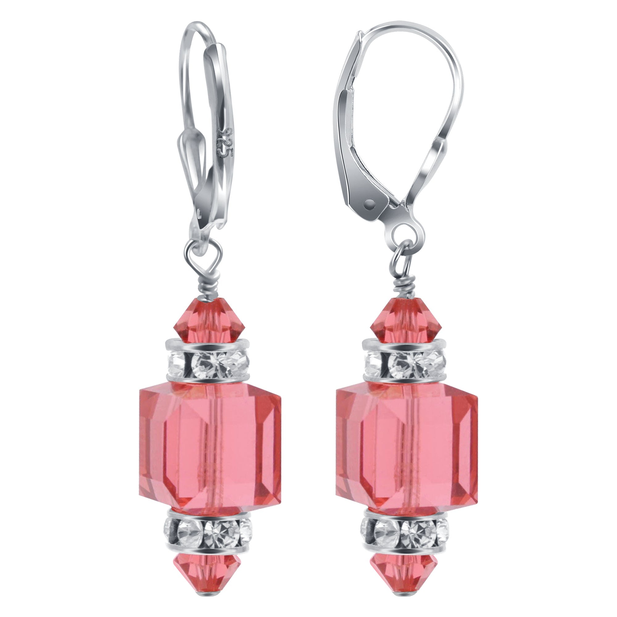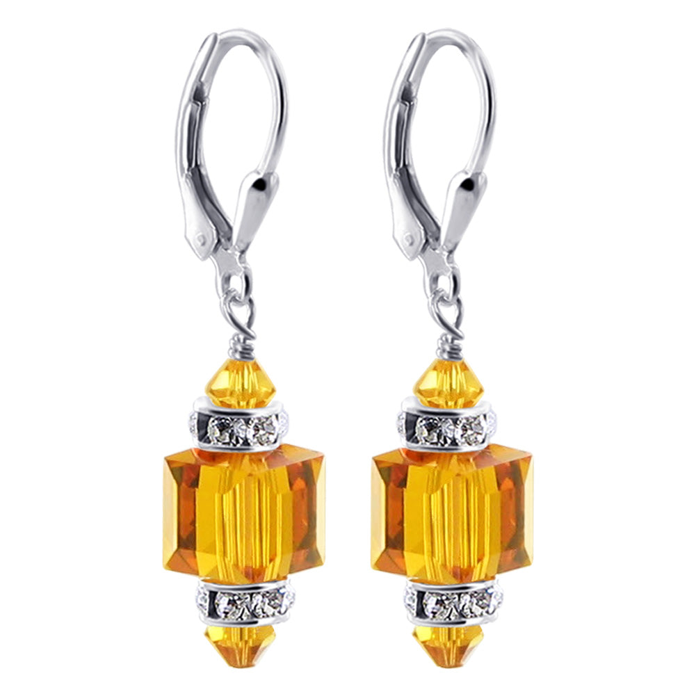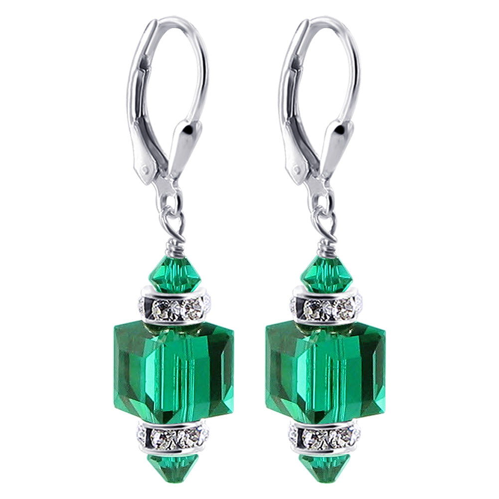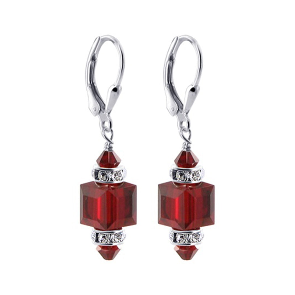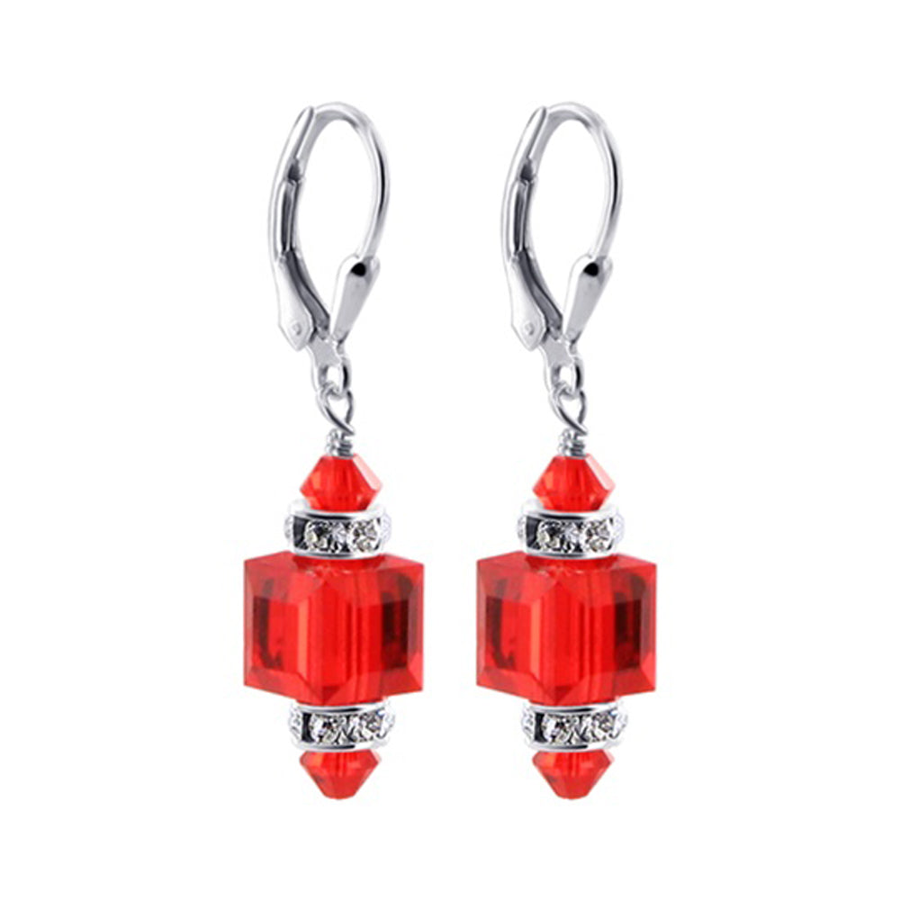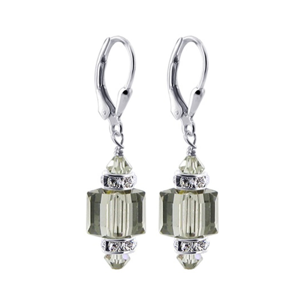 925 Sterling Silver Dangle Earrings made with Austrian Crystals. Made with an 8mm multifaceted crystal cube with 4mm crystal bicone and rhinestone rondell beads on top and bottom. 0.9-inch long-dangle earrings come with sterling silver leverback findings.