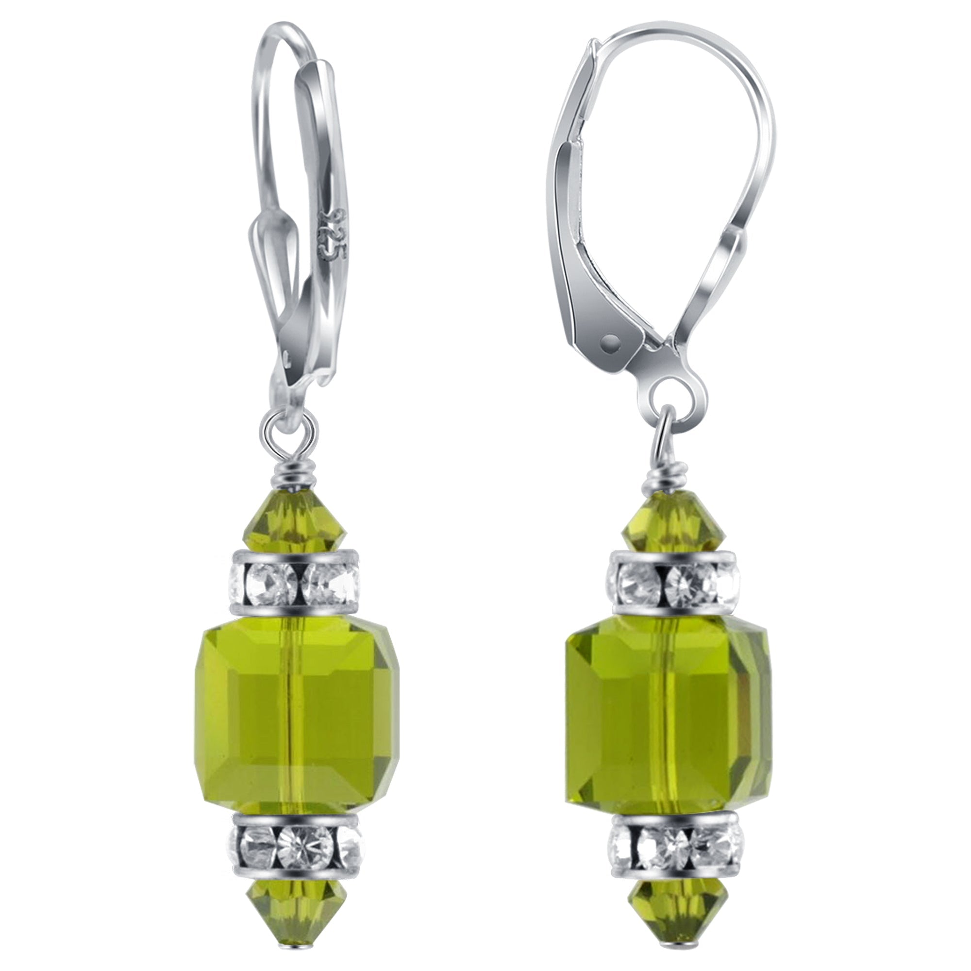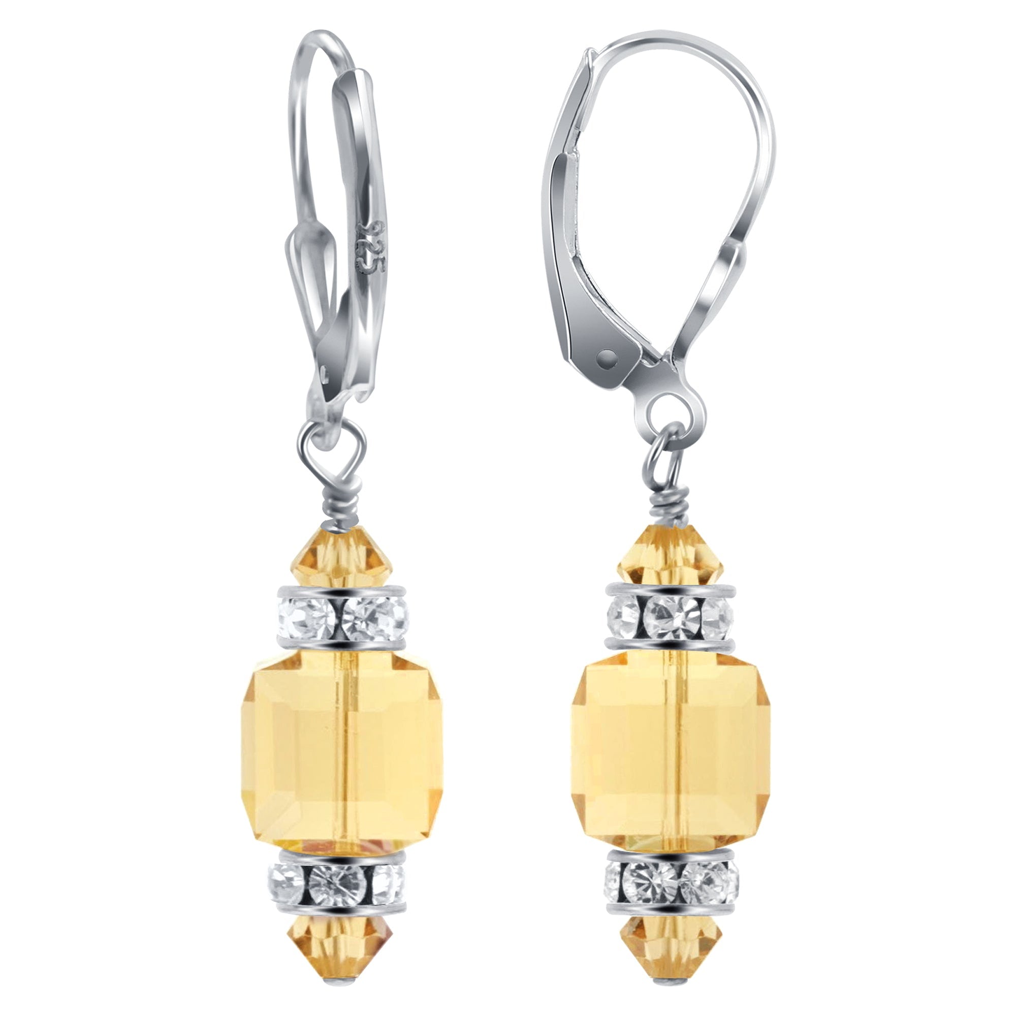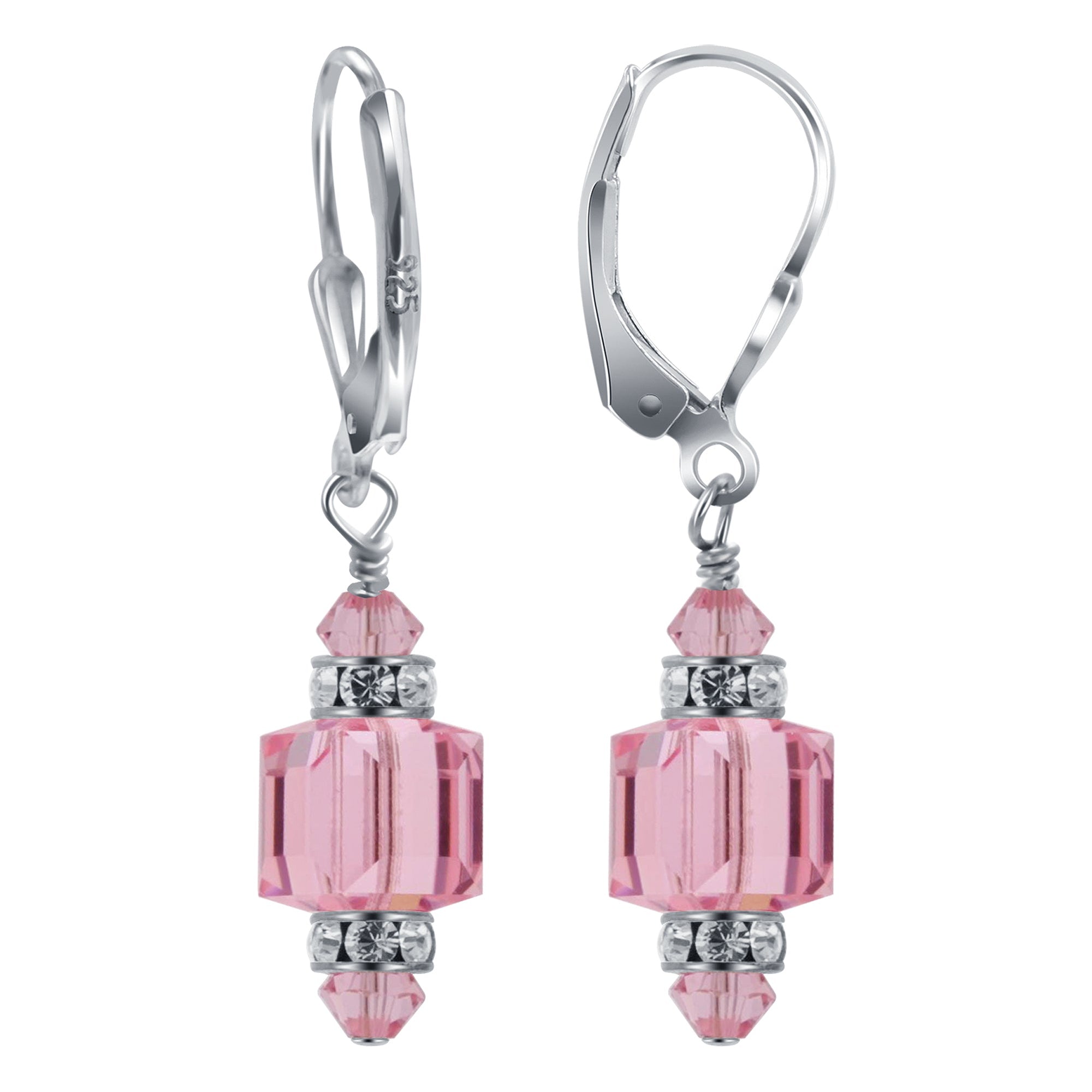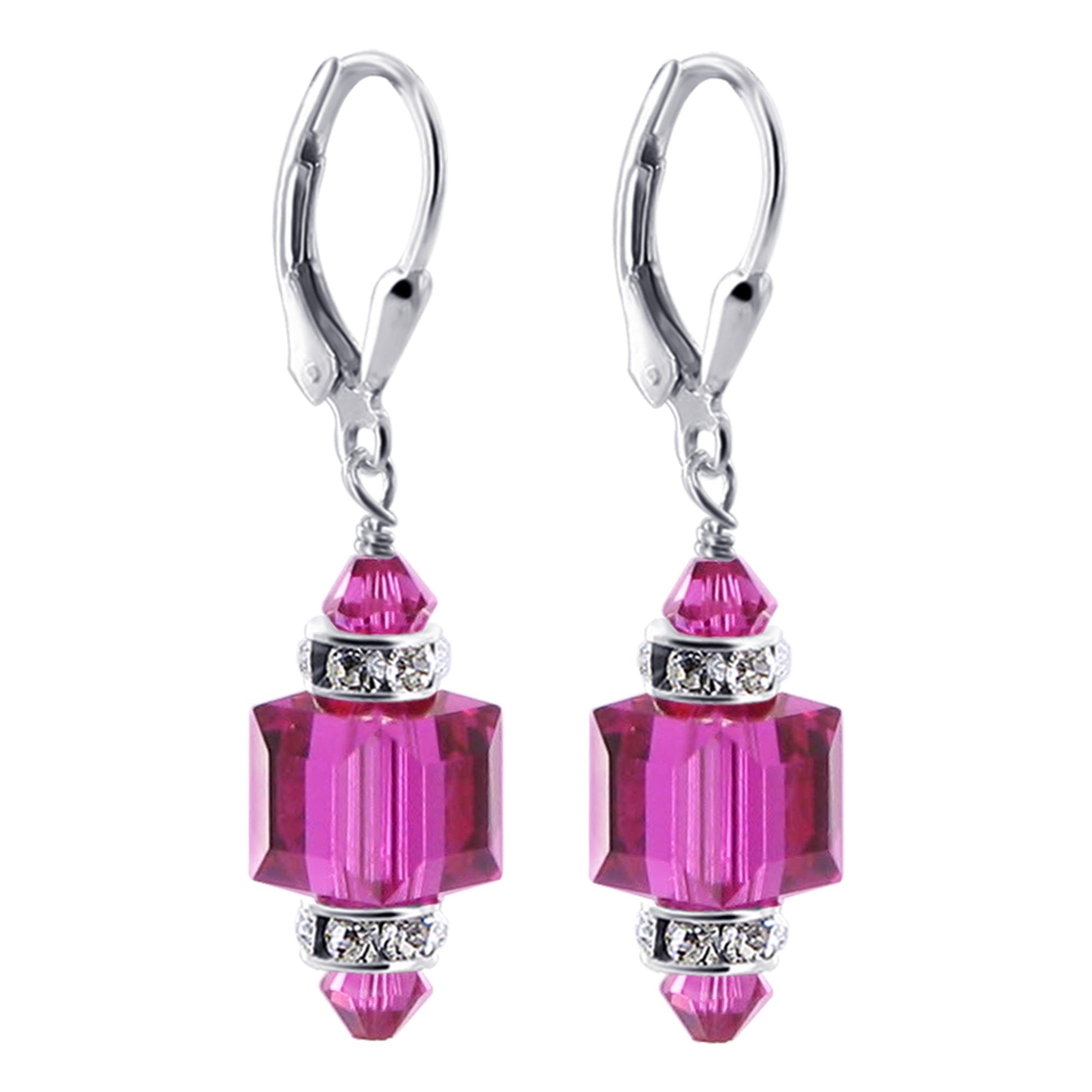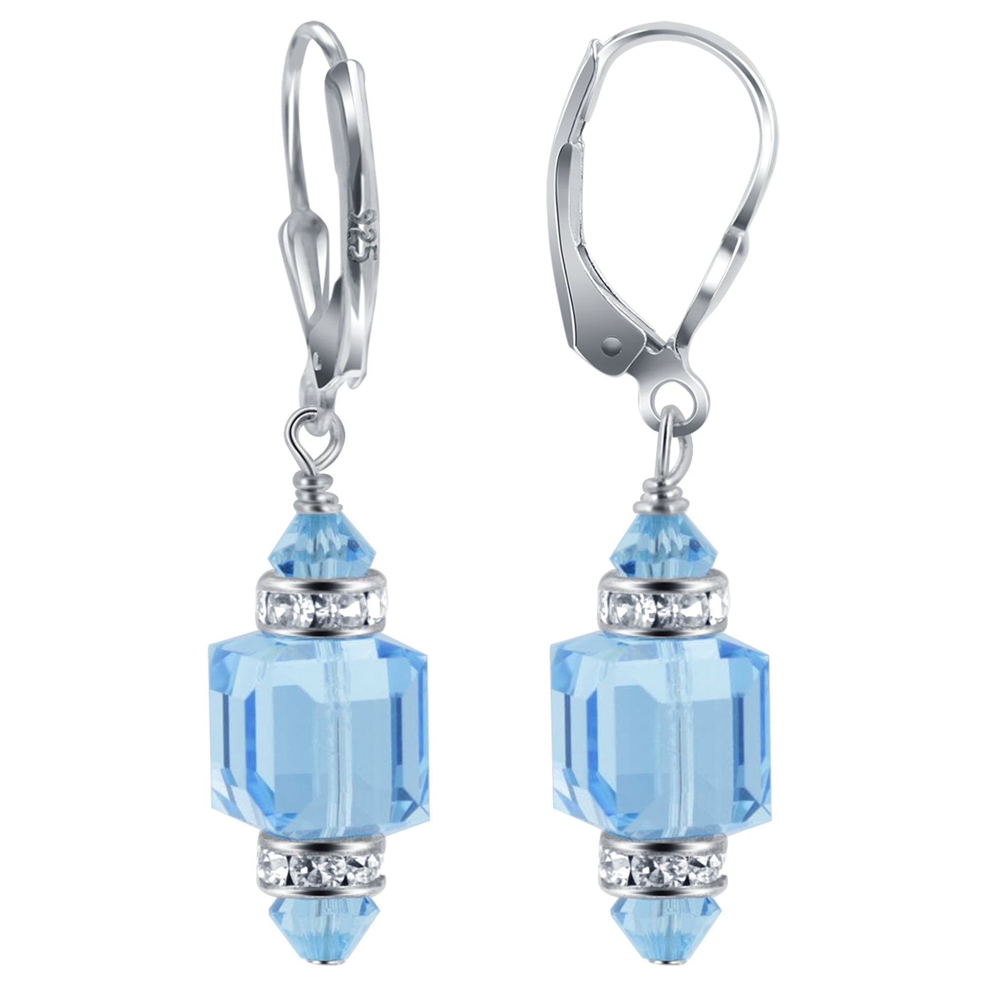 925 Sterling Silver Dangle Earrings made with Austrian Crystals. Made with an 8mm multifaceted crystal cube with 4mm crystal bicone and rhinestone rondell beads on top and bottom. 0.9-inch long-dangle earrings come with sterling silver leverback findings.