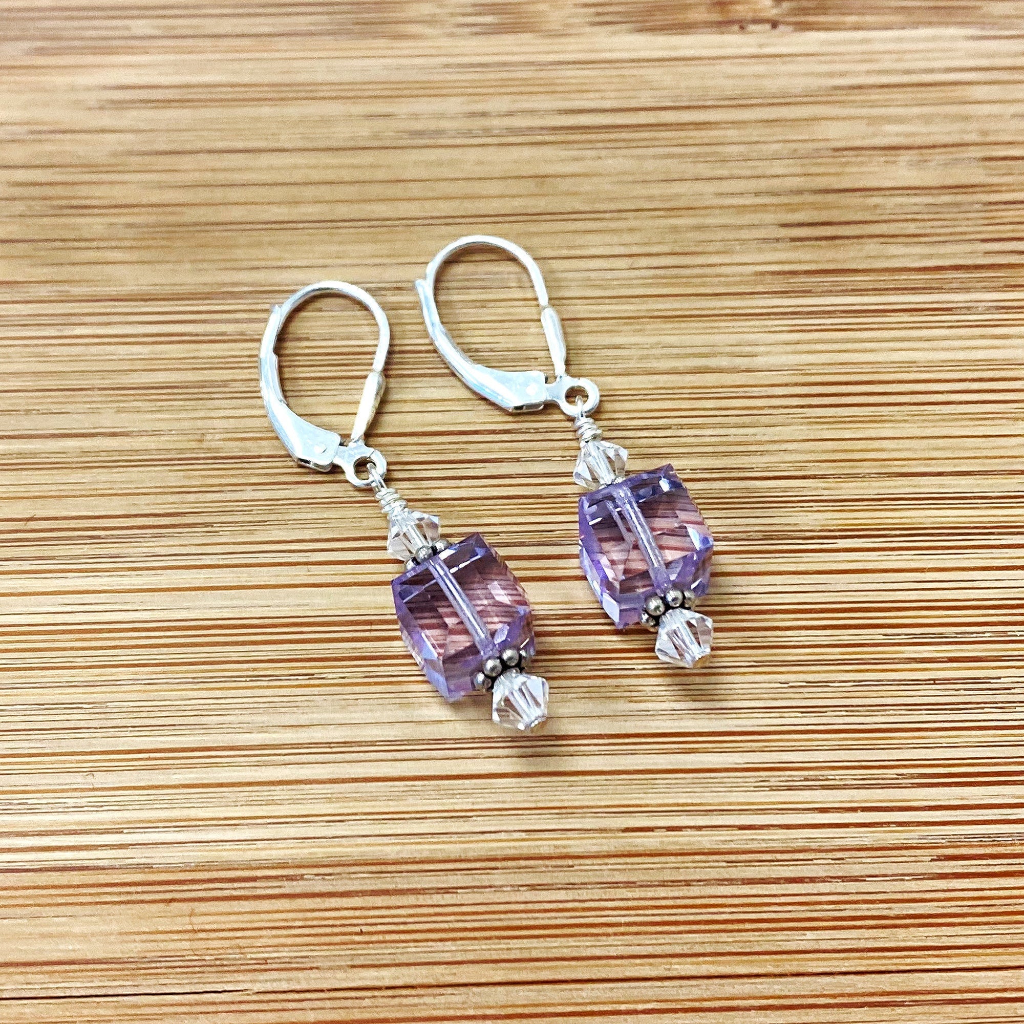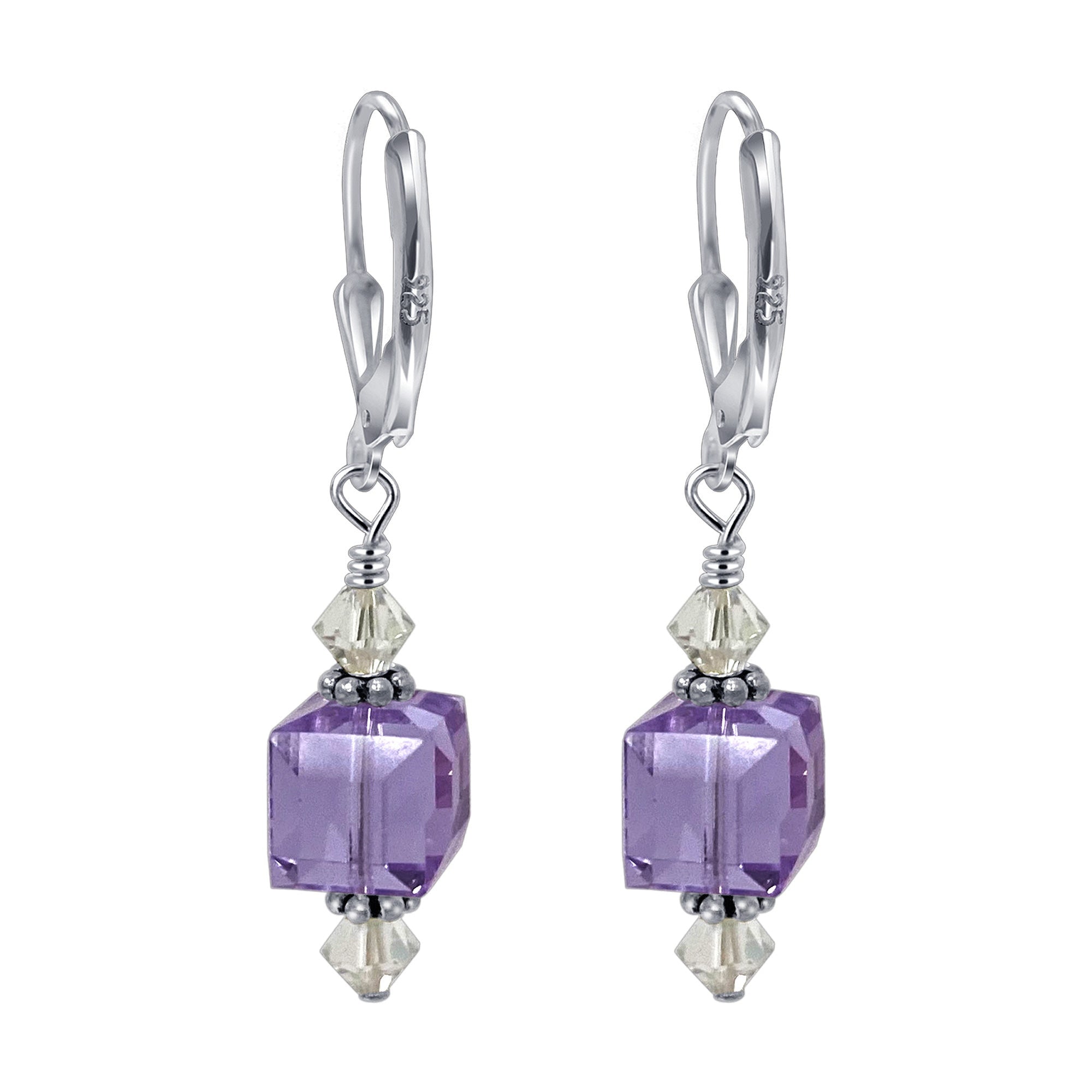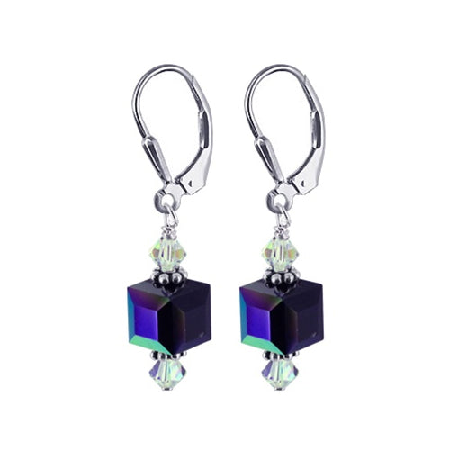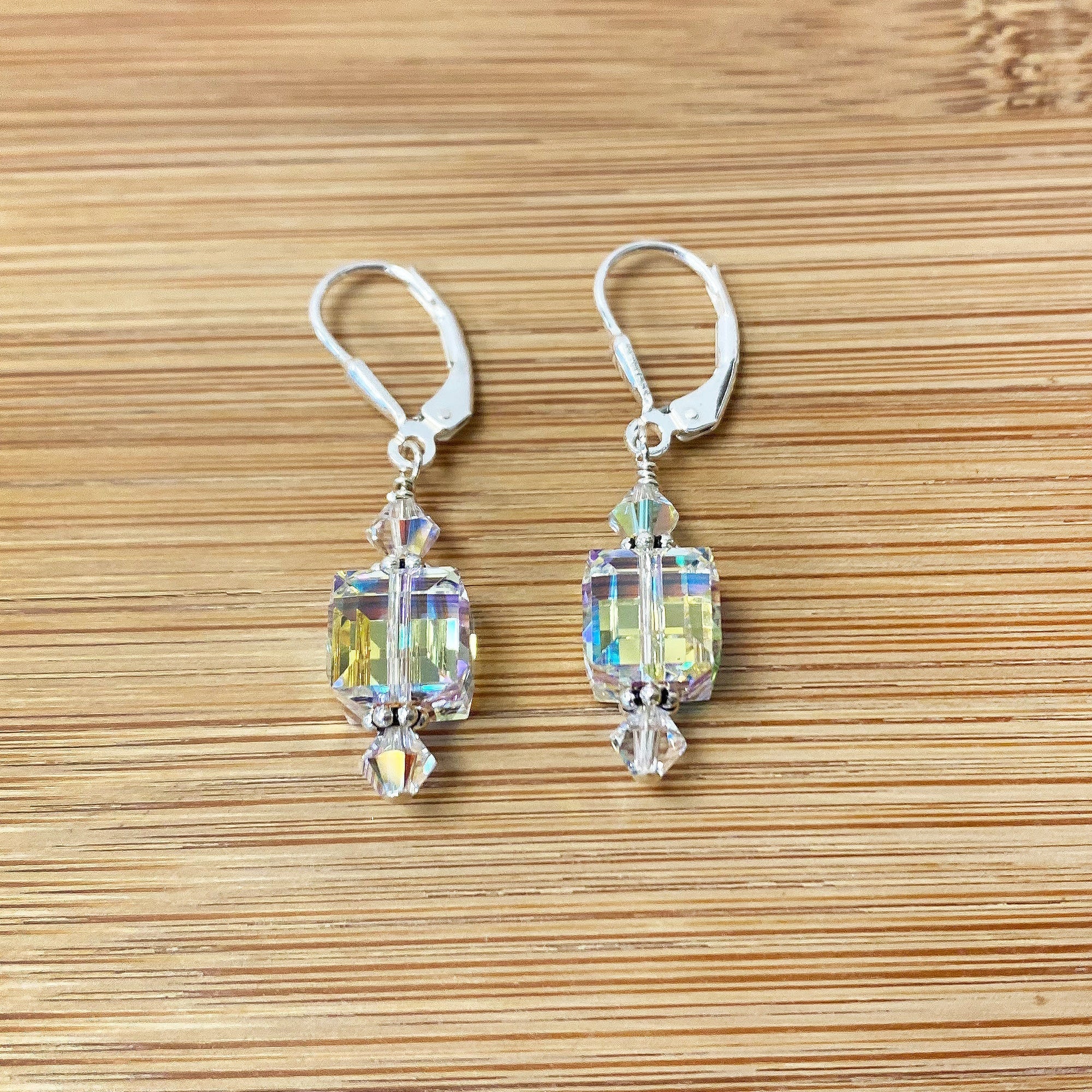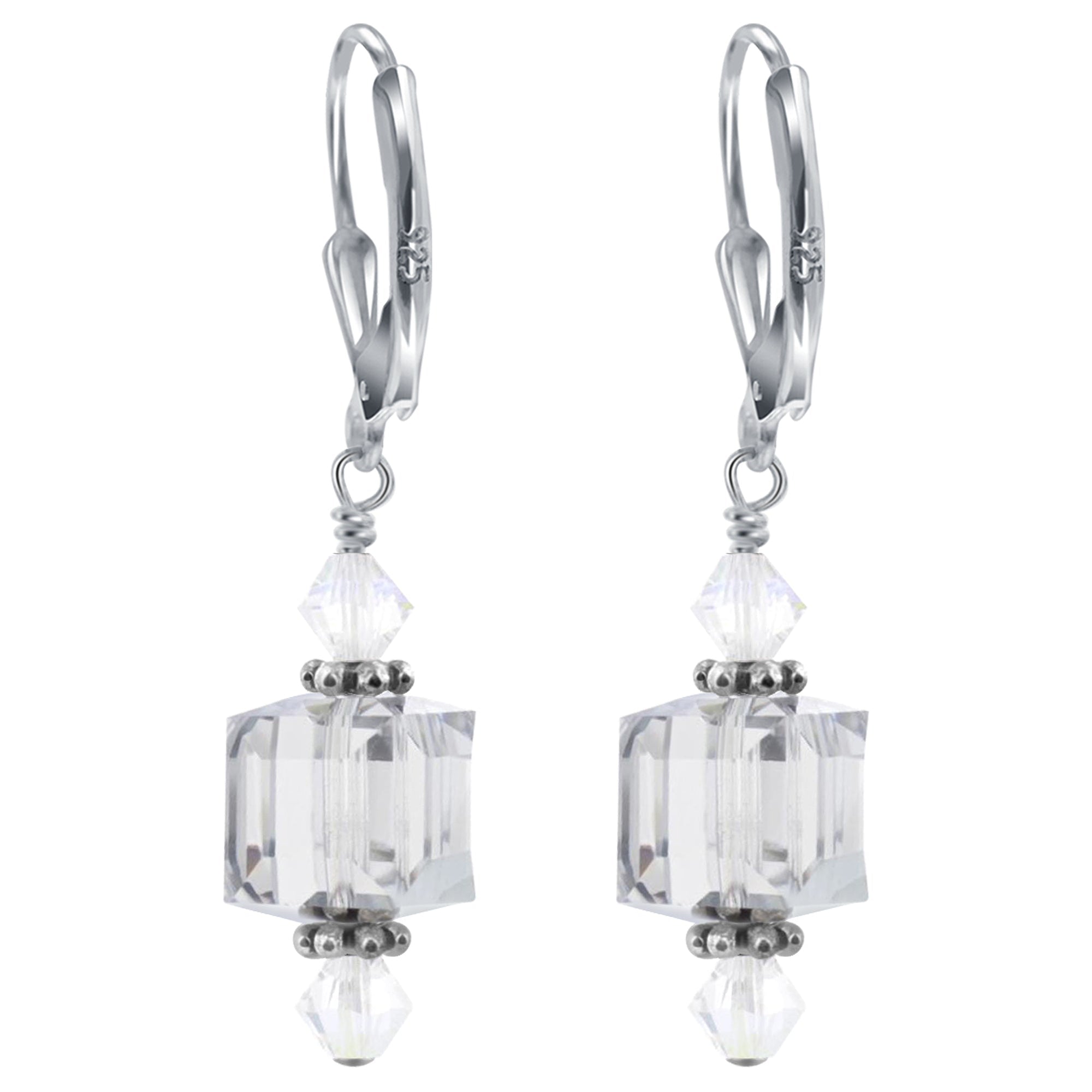 925 sterling silver lever back dangle earrings made with faceted cube-shaped Austrian crystal.