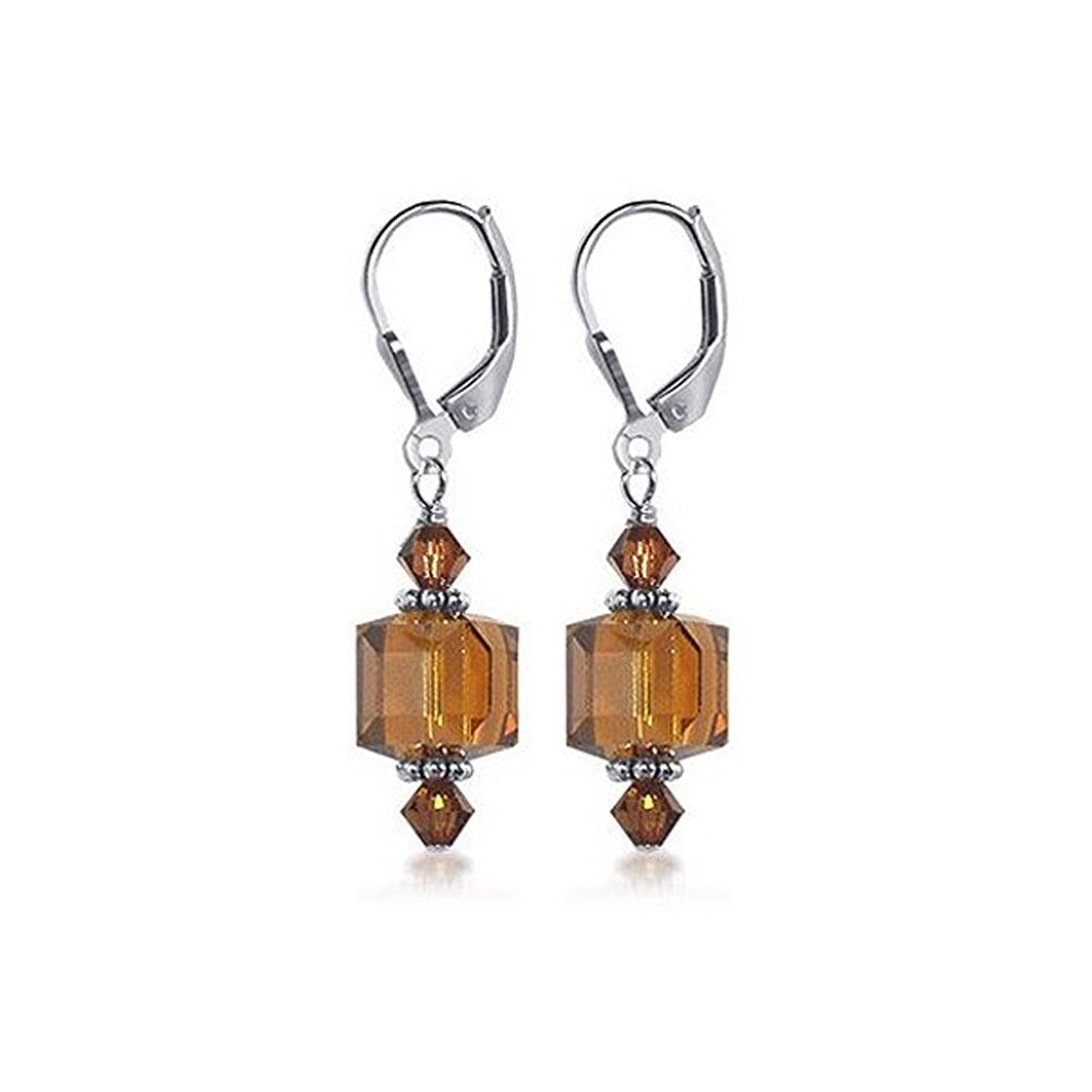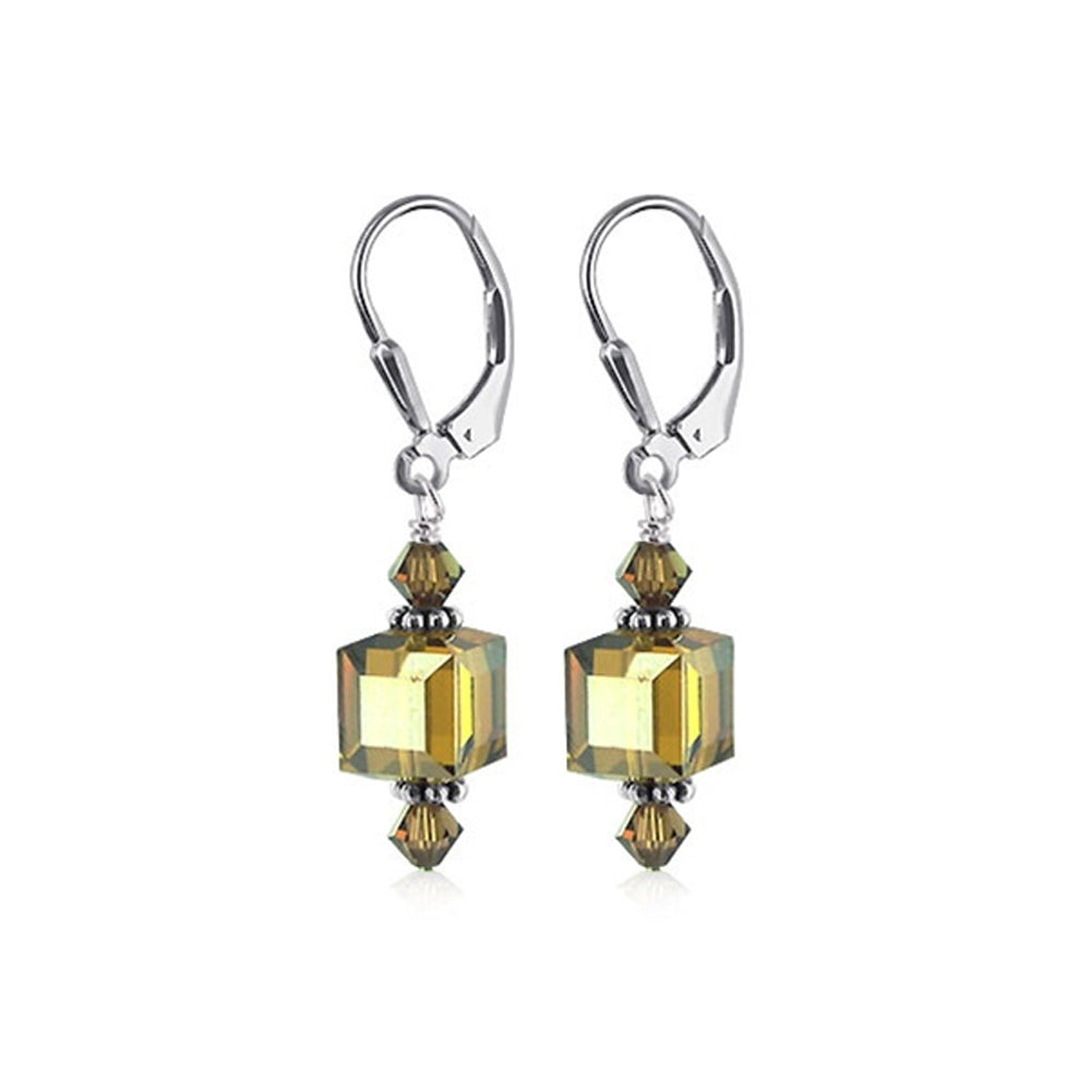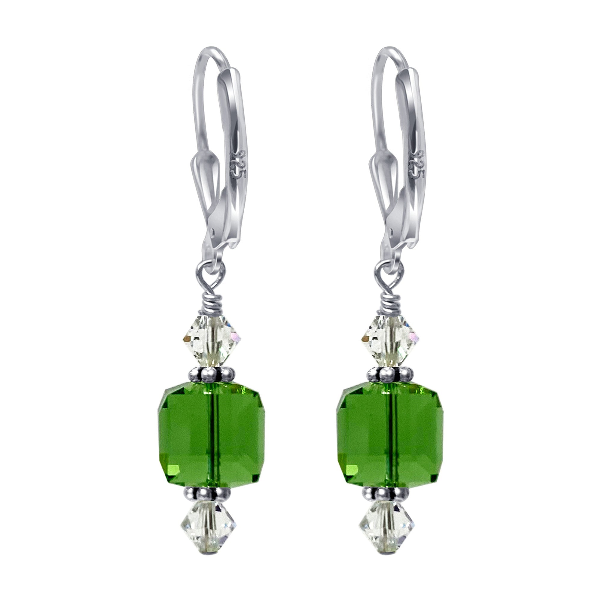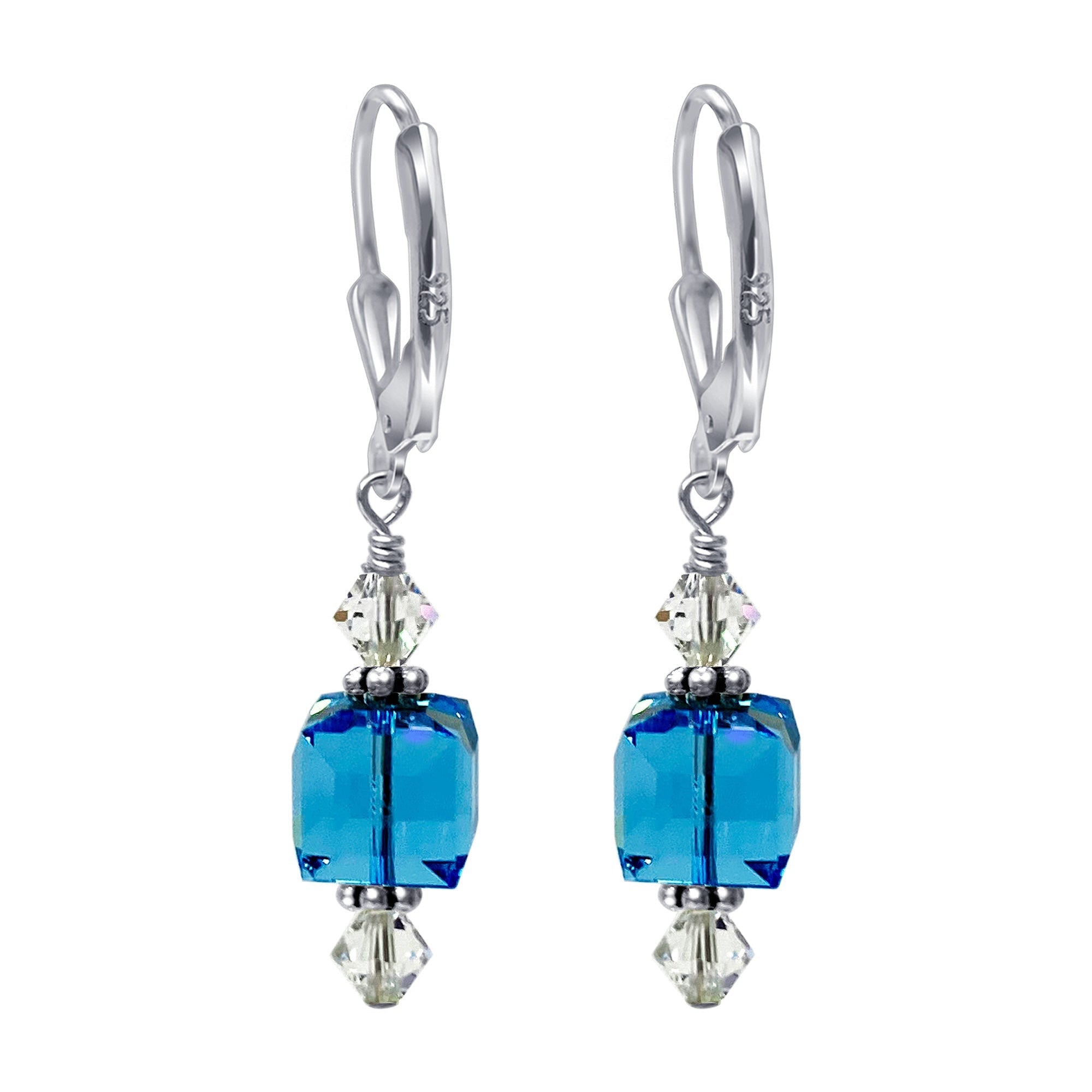 925 sterling silver lever back dangle earrings made with faceted cube-shaped Austrian crystal.