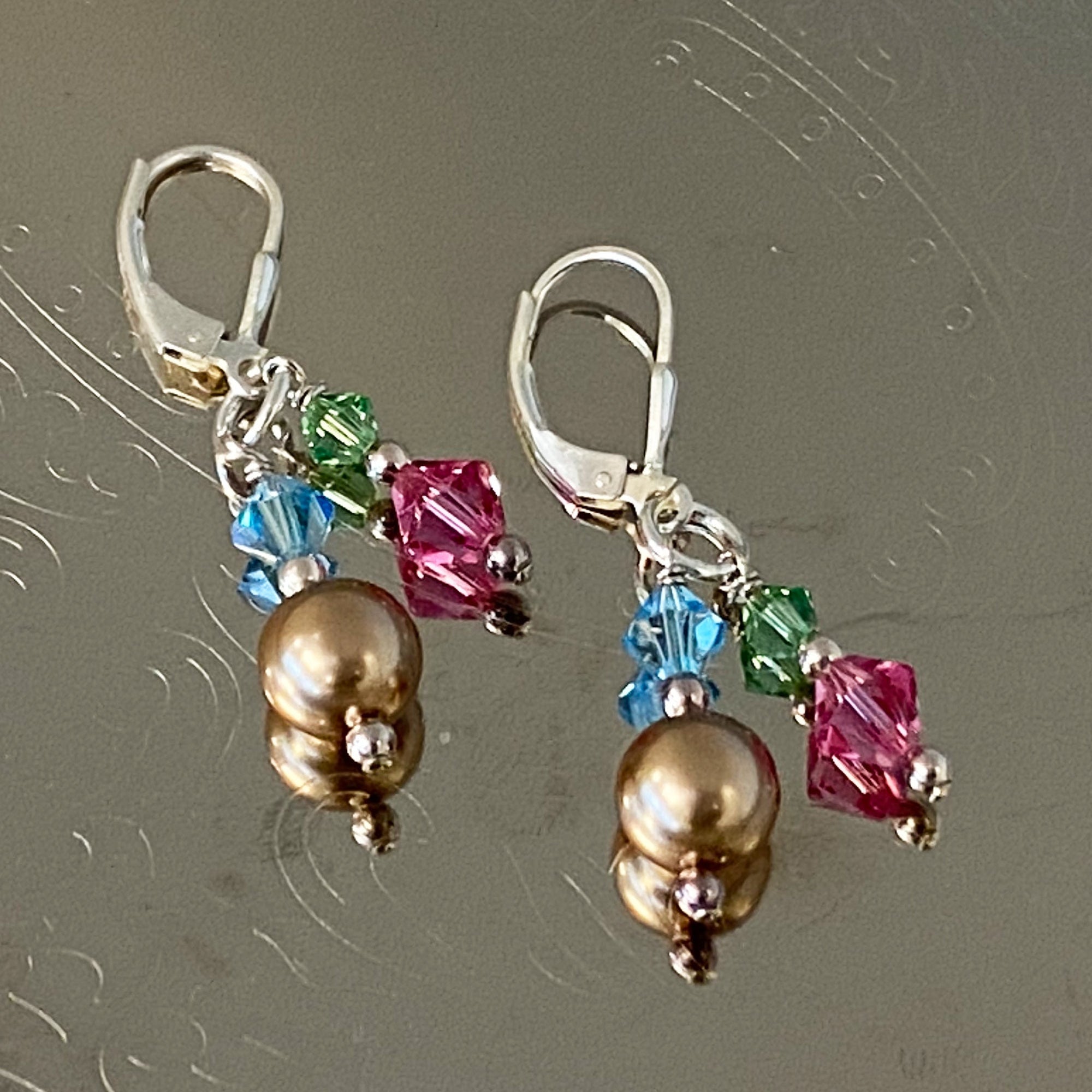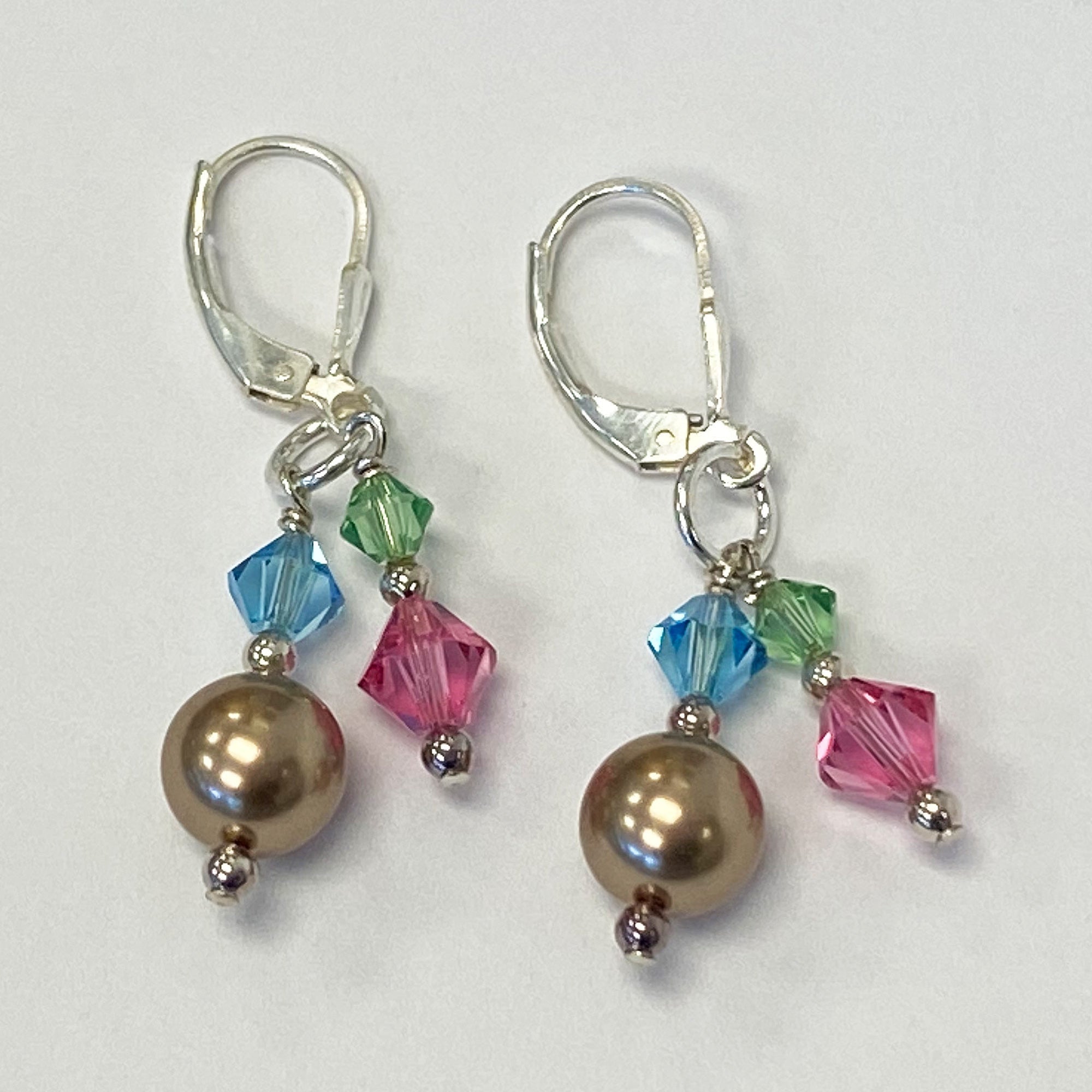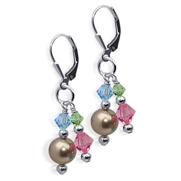 Crafted from 925 sterling silver, these dangle and drop earrings feature a bronze imitation pearl alongside tremendous blue, green, and purple Austrian crystal accents. Each earring measures approximately 1.5 inches in length and is designed with a spring leverback for a comfortable fit.