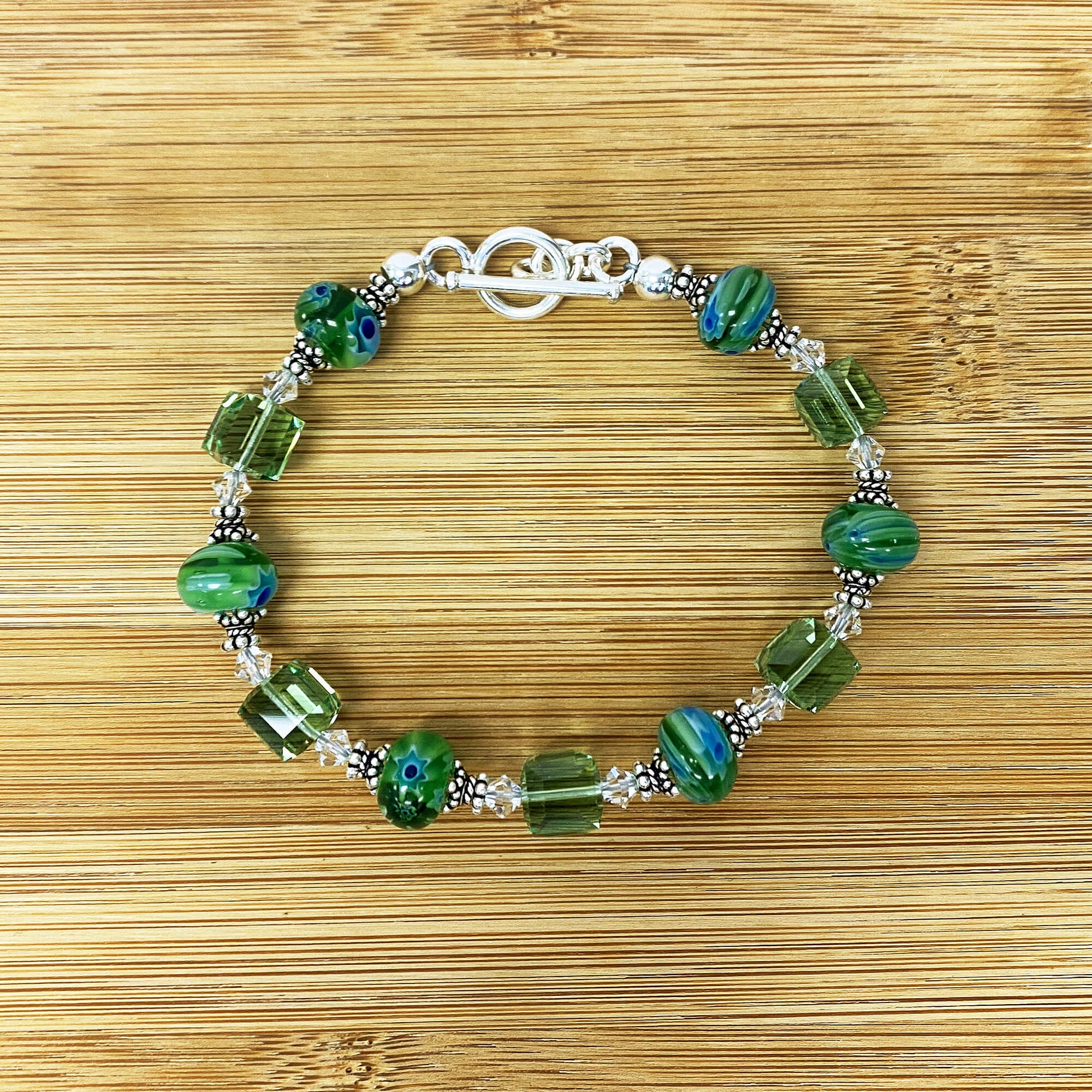 Experience the elegant blend of Millefiori Glass, Sterling Silver, and Austrian Crystals in this stunning bracelet. The shimmering Milano Glass measures 10mm in diameter, perfectly complemented by the dazzling 8mm cube-shaped crystals. With a length of 7.5 inches, this bracelet is the ideal accessory for any occasion. Trust in the expertly crafted design and skillful use of quality materials to ensure a beautiful and lasting piece of jewelry.