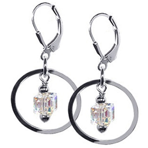 These 925-sterling silver circle dangle and drop earrings are composed of 100% Austrian crystals with a beautifully crafted cube that dangles front and center of these dazzling earrings. The iridescent cube measures approximately 6 mm, with all earrings being about 1.5 inches long.