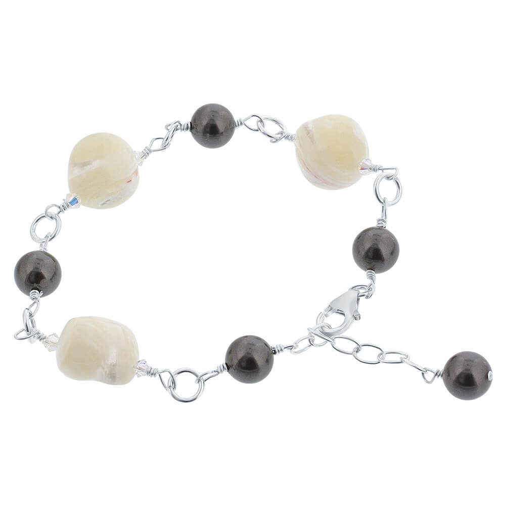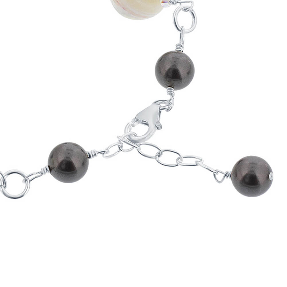 925 Sterling Silver Bracelet with 13mm Mother of Pearl and 8mm Black Faux Pearl with 2mm Clear AB Austrian crystal bicones 7 to 8 Inch Adjustable Bracelet. Elevate your style with this exquisite and unique piece of jewelry. With its combination of opulent materials, this bracelet is sure to catch the eye and turn heads.