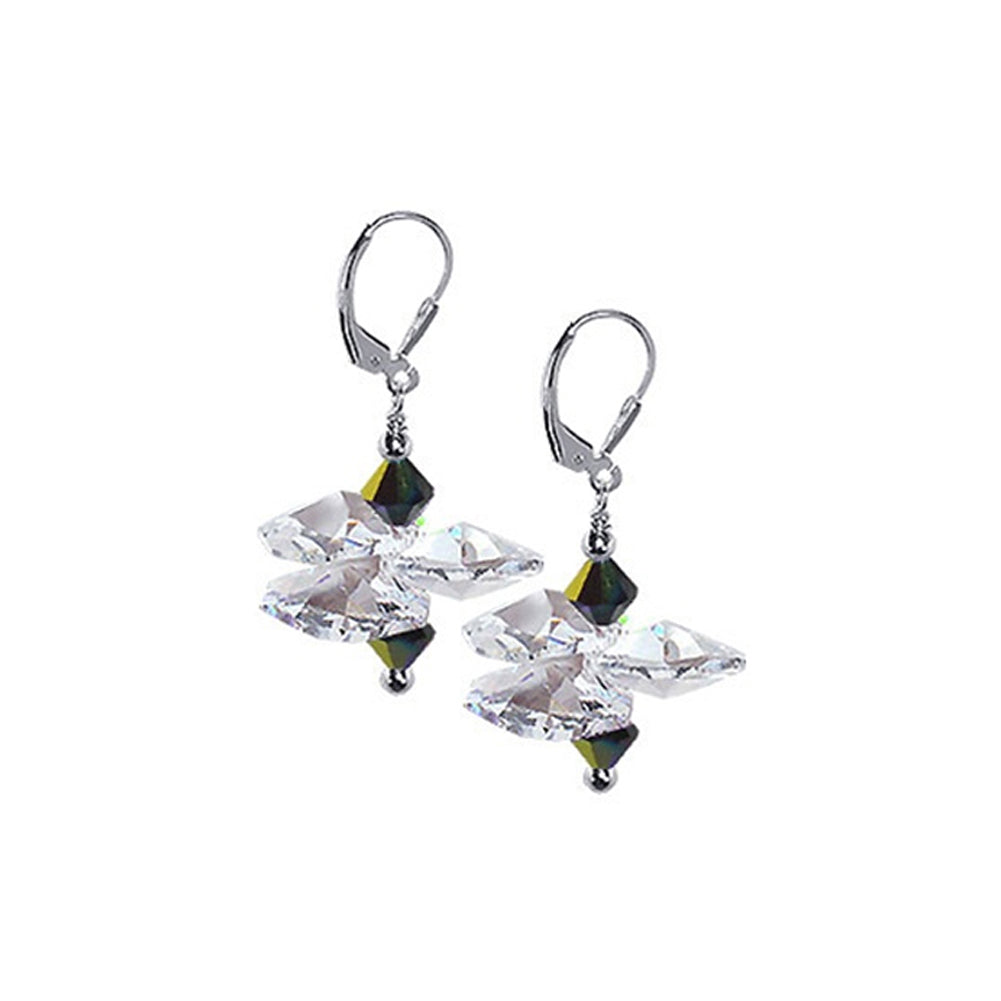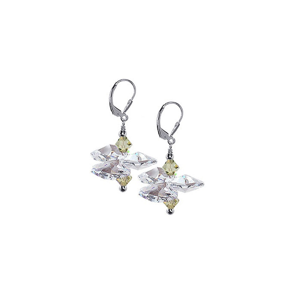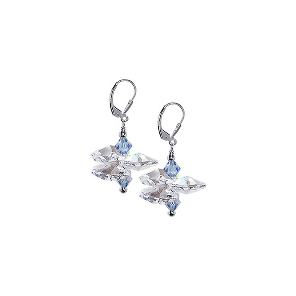 Sterling Silver, a pair of dangle earrings made with Austrian crystals. Unique style with horizontal crystals arranged so as to make a floral petal look.