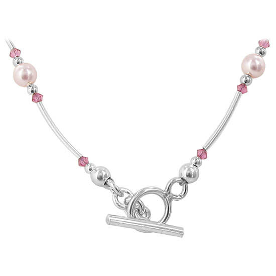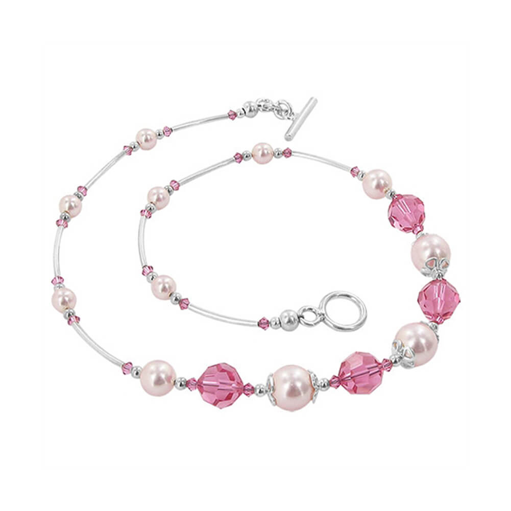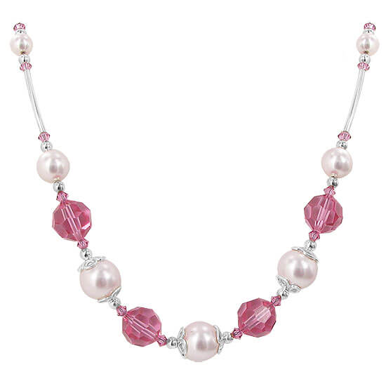 Sterling silver necklace crafted with silver accents and elegantly adorned with authentic Austrian crystals. The stunning piece showcased pink crystals and imitation pearls.