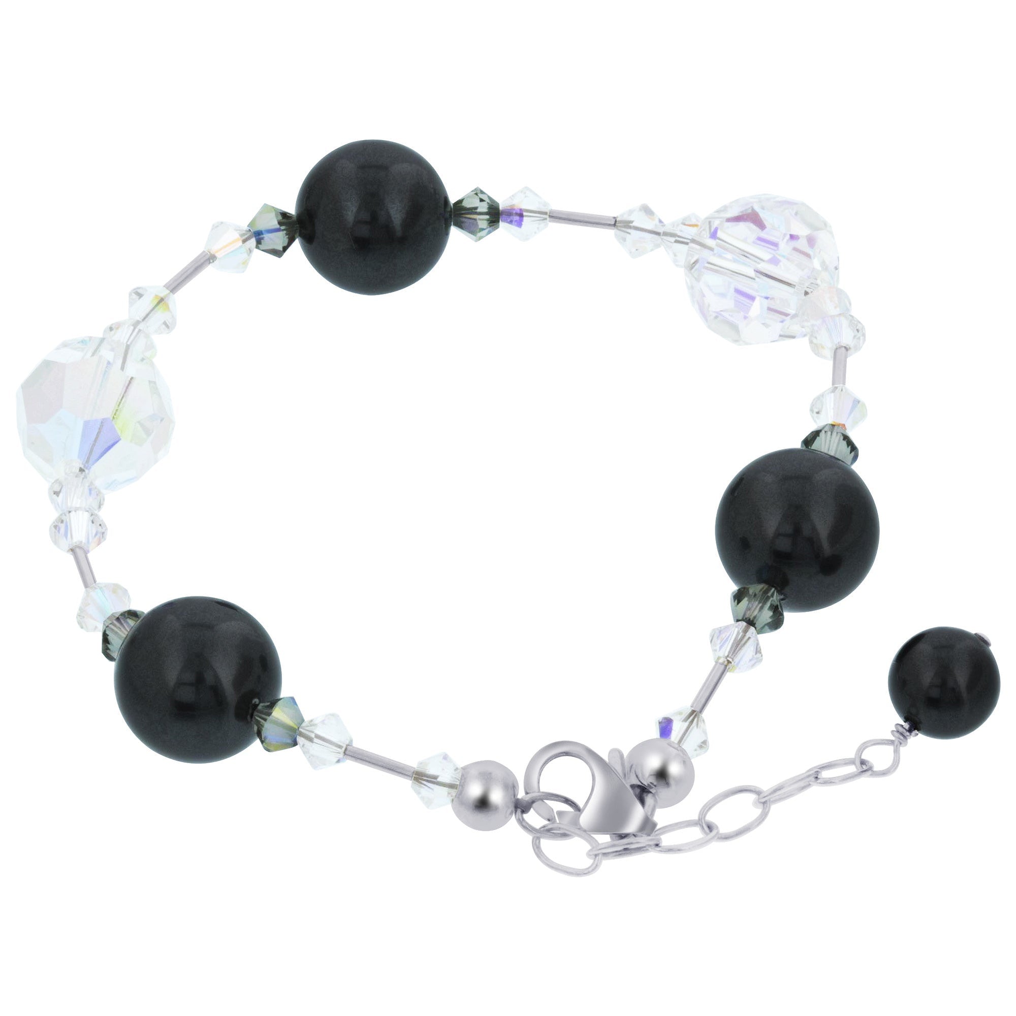 Glittering like diamonds, this fabulous crystal and pearl bracelet will delight all those around you. Crafted from .925 sterling silver, the bracelet is made up of multiple 4mm bicone crystals in clear AB and black. The bracelet also features 12mm round black Austrian faux pearls and 12mm round clear AB crystals. Easily adjustable from 7 inches to 8 inches, the bracelet comes with a lobster claw clasp to help secure the bracelet into place.