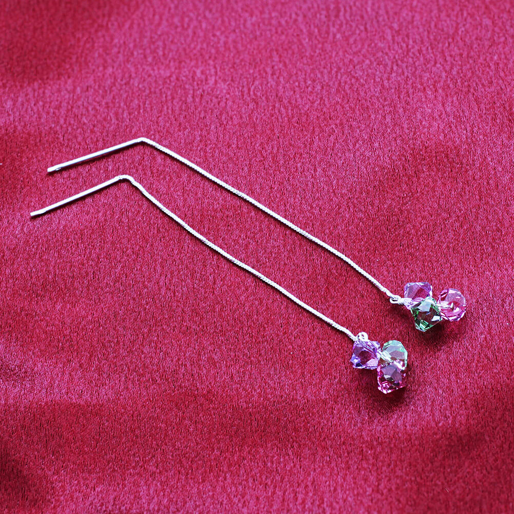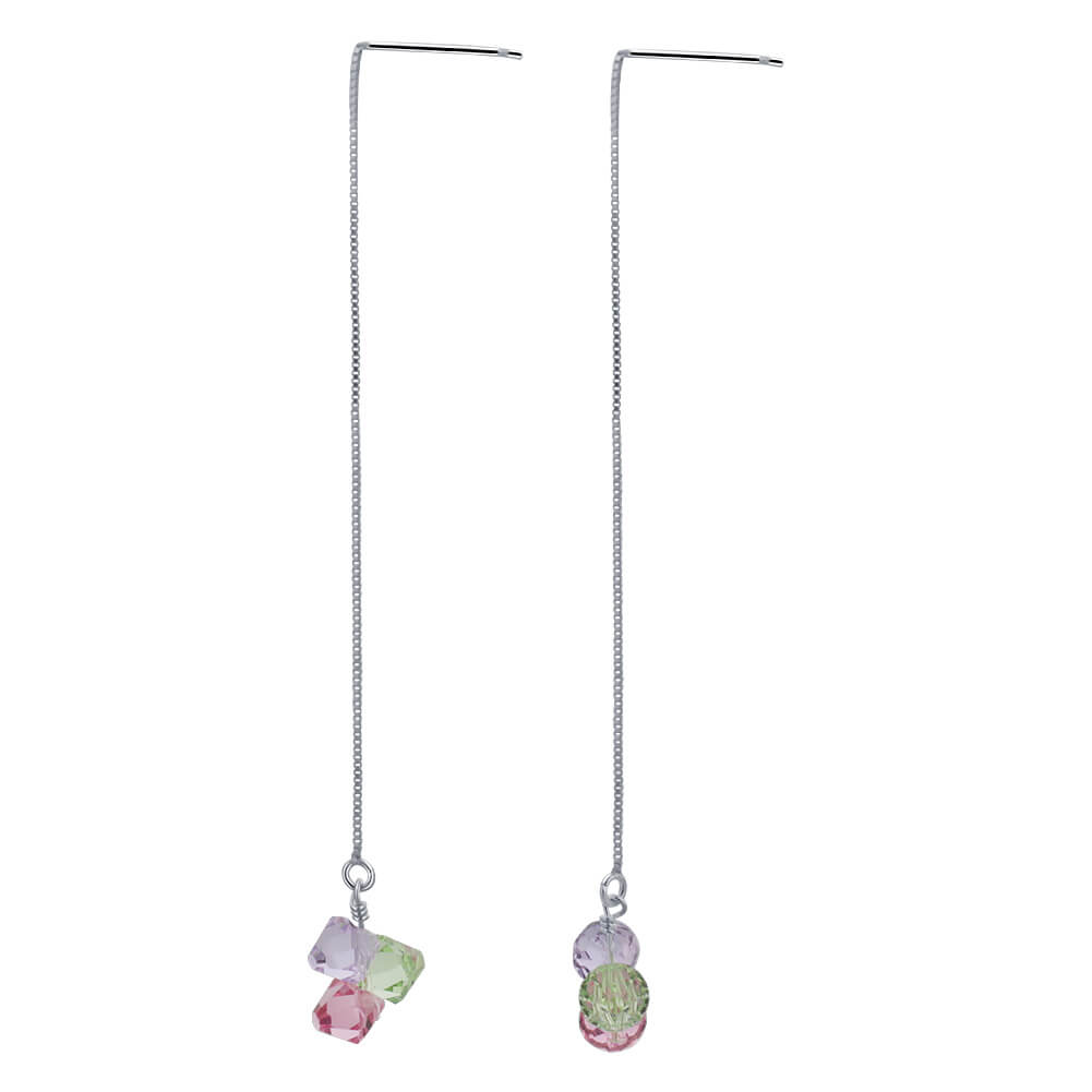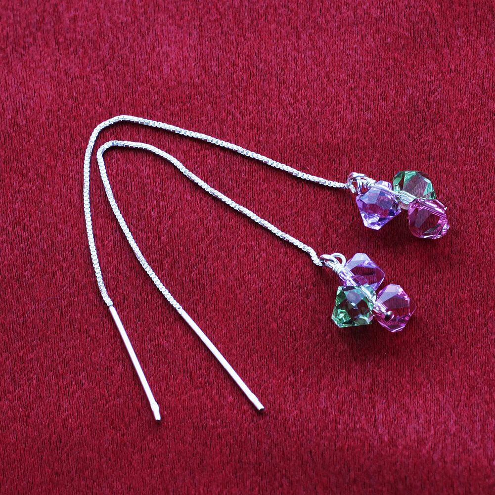 These interesting and unique sterling silver French wire earrings are blue, green, and pink 4mm bicone crystals from Austrian Crystals. 1mm French wire comes with an additional stopper back in case the wire doesn't sit by itself in your piercings.