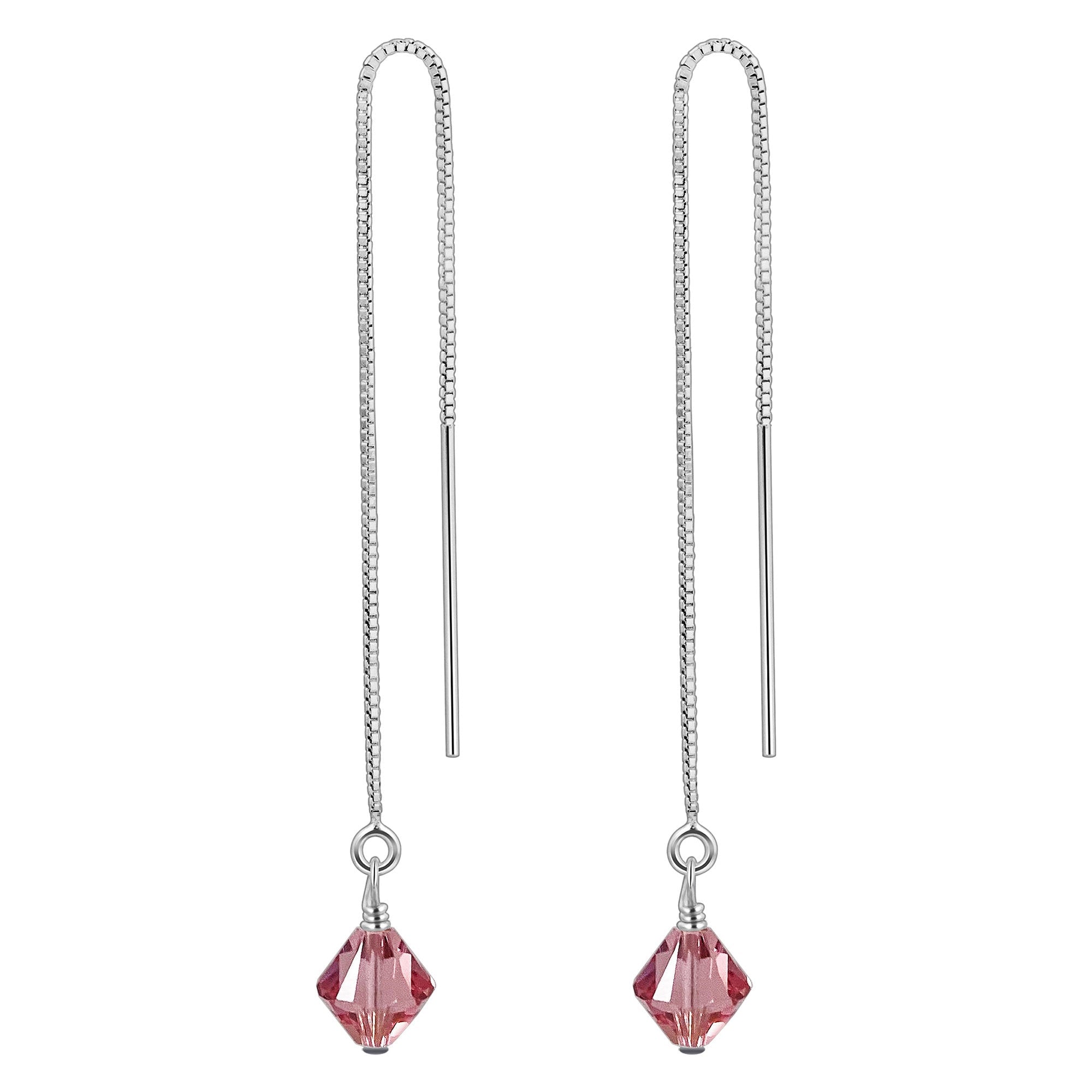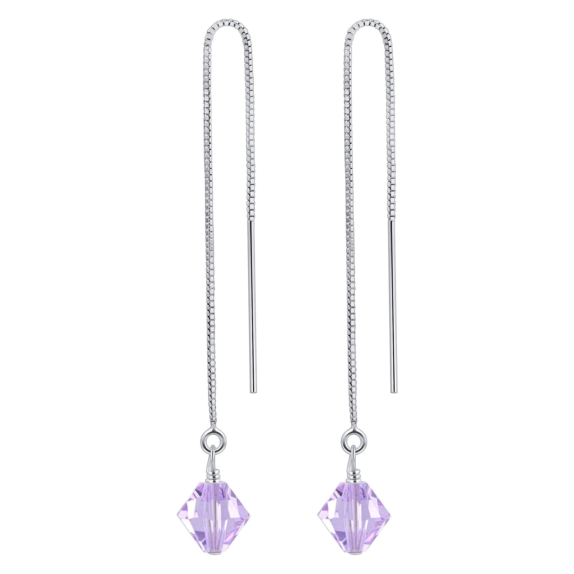 These 925 sterling silver earrings are composed of 100% Austrian crystals. Step into the light and watch how they sparkle and shine! The vibrant crystal dangles from a silver box chain string that is approximately 4 inches long, from top to bottom.