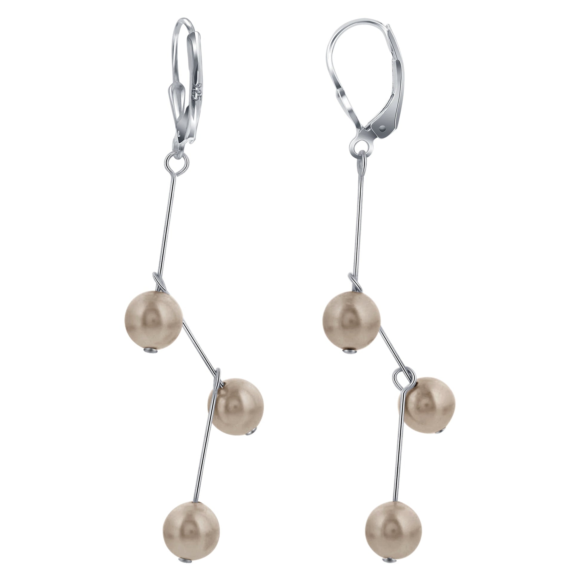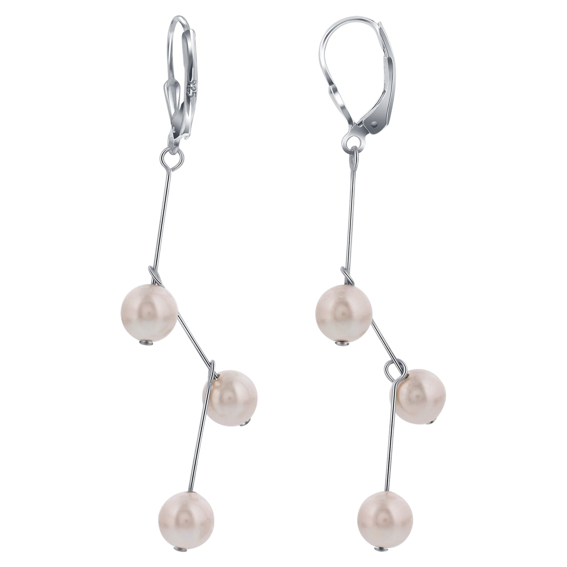 These 925-sterling silver dangle and drop earrings are composed of three imitation pearls that are in a zig zag formation. Each pair of earrings measures approximately 2 inches from top to bottom and comes with a lever back to ensure a secure and comfortable fit.