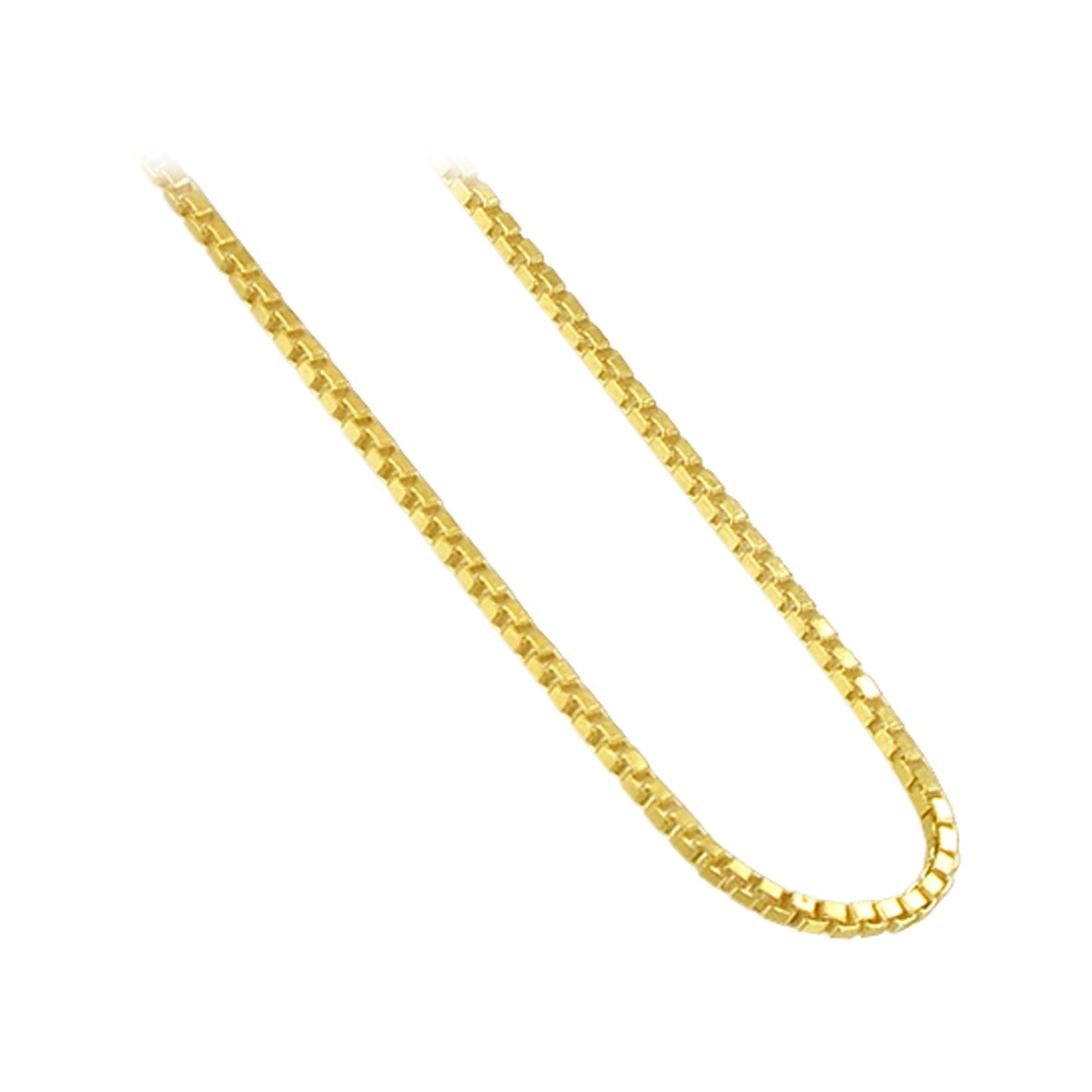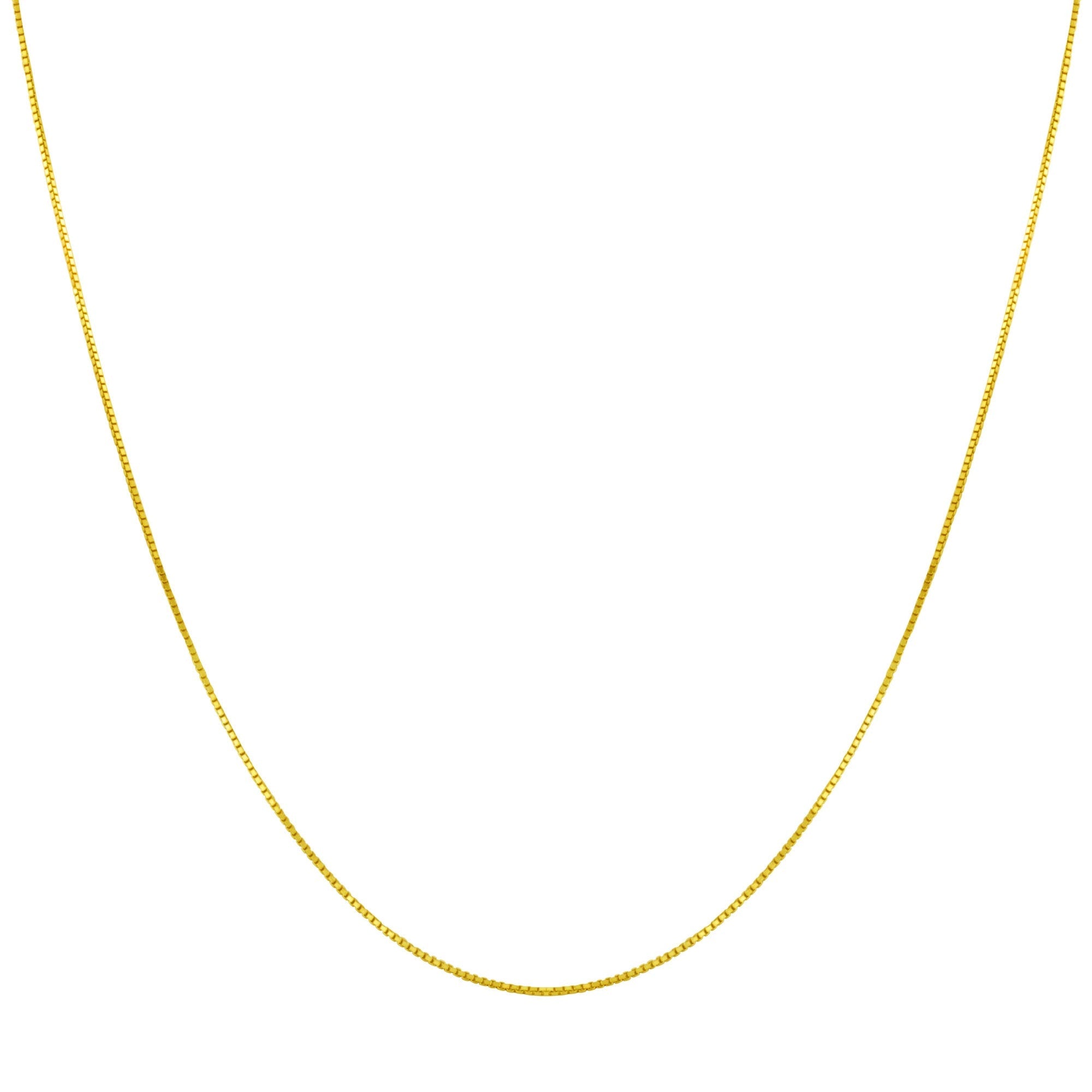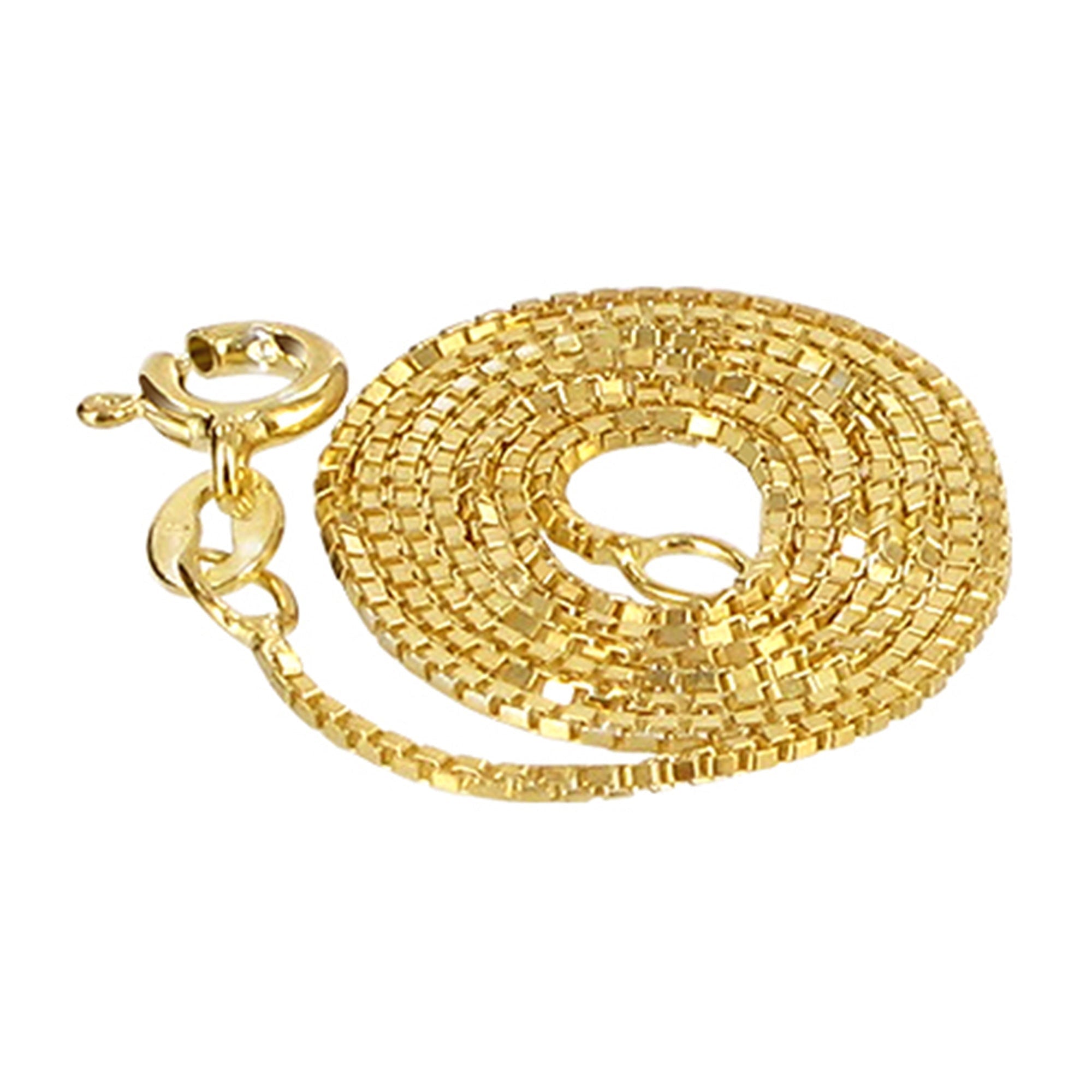 Beautiful gold box chain necklace. This dazzling necklace ranges from 14 inches up to 30 inches, perfect sizing for everyone to enjoy! Although this necklace is quite simple, it is perfect for that subtle touch of gold. This chain comes with a secure spring ring clasp. This necklace comes with a beautiful 14k gold plating to provide a classic, timeless look. All of the components of this necklace, from the chain to the clasp, are made with high-grade sterling silver to ensure a durable and long-lasting product.
