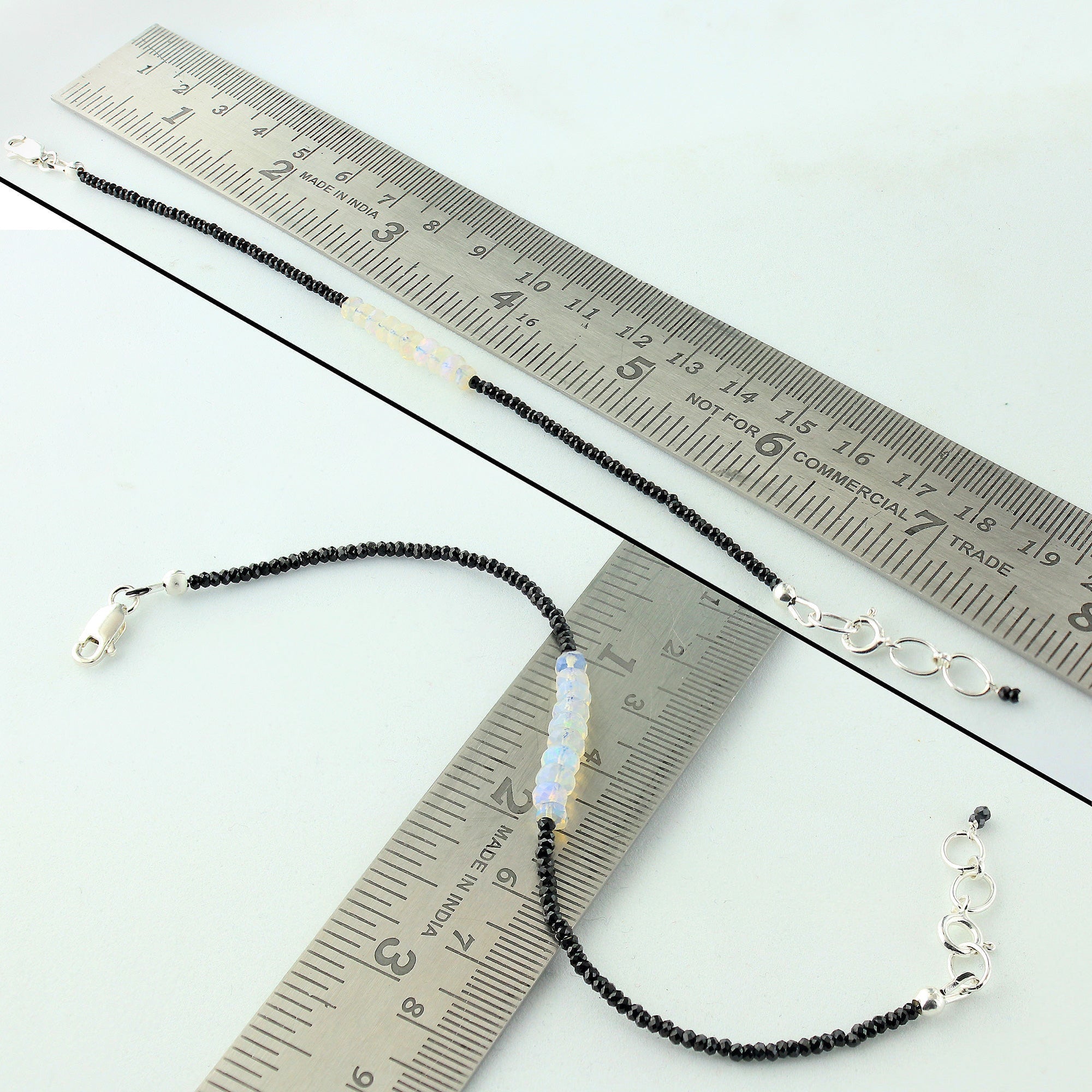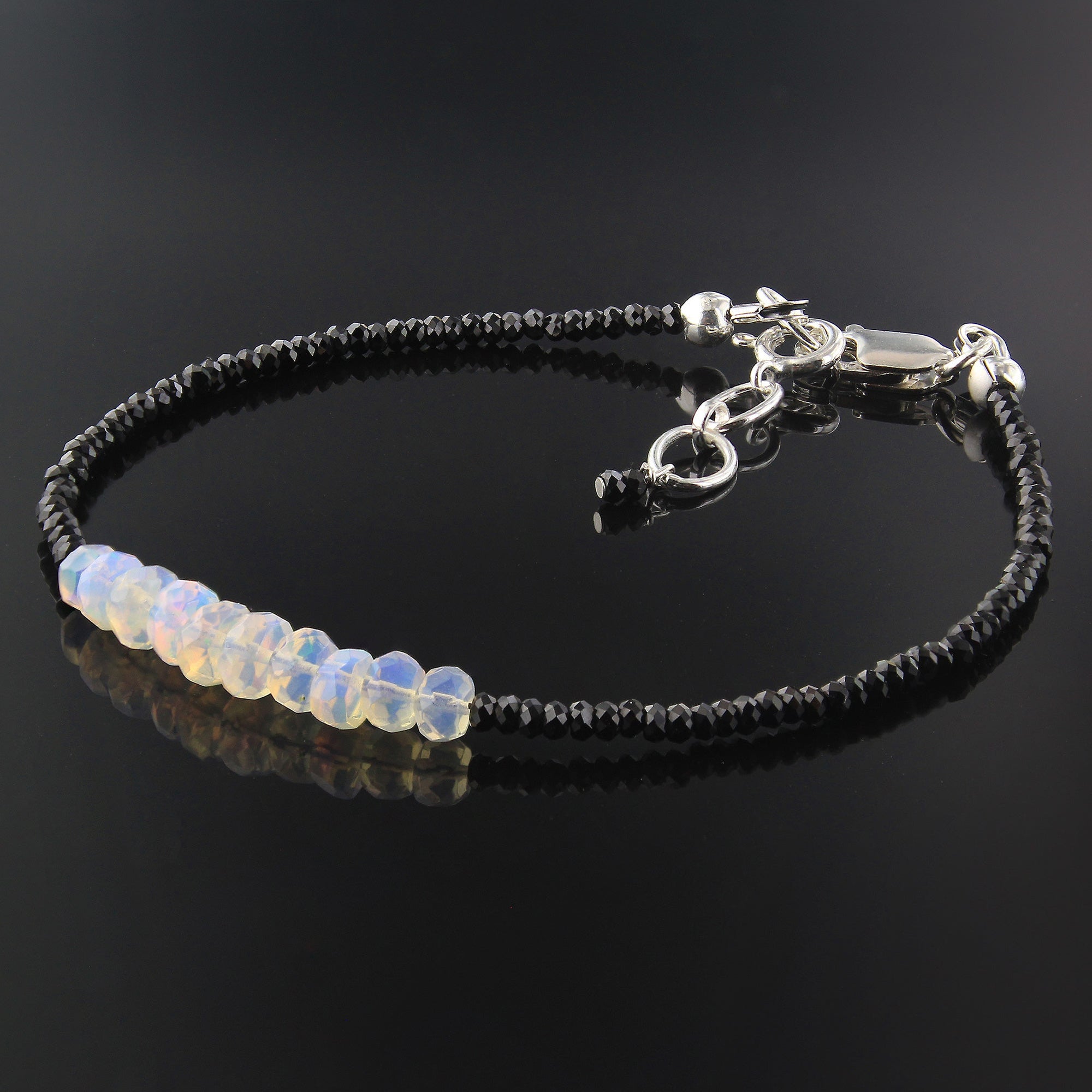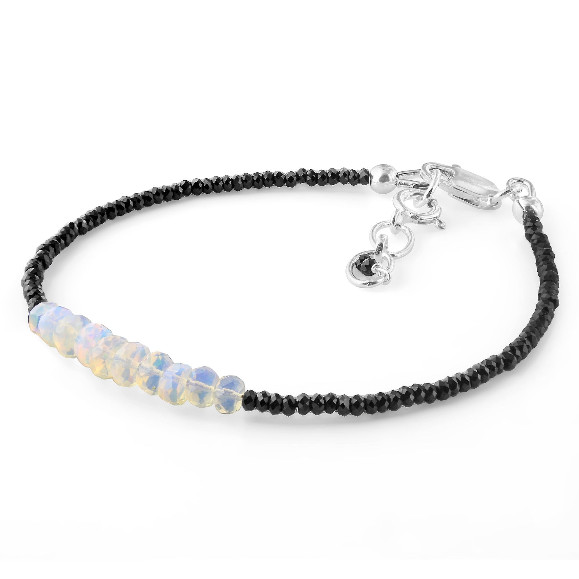Beautifully crafted in India, add the perfect pop of color and sparkle to any outfit with this gorgeous sterling silver faceted rondelles natural Ethiopian opal with black spinel bracelet! This stunning bracelet contains a rich shade of black and white with flashes of blue, green, and yellow, along with a secure lobster clasp. The perfect accessory to any outfit, this sterling silver faceted rondelle natural Ethiopian opal with black spinel bracelet is a sure must-have! It measures approximately 7.5" in length by 1.5mm & 2mm in bead size and weighs 3 grams.