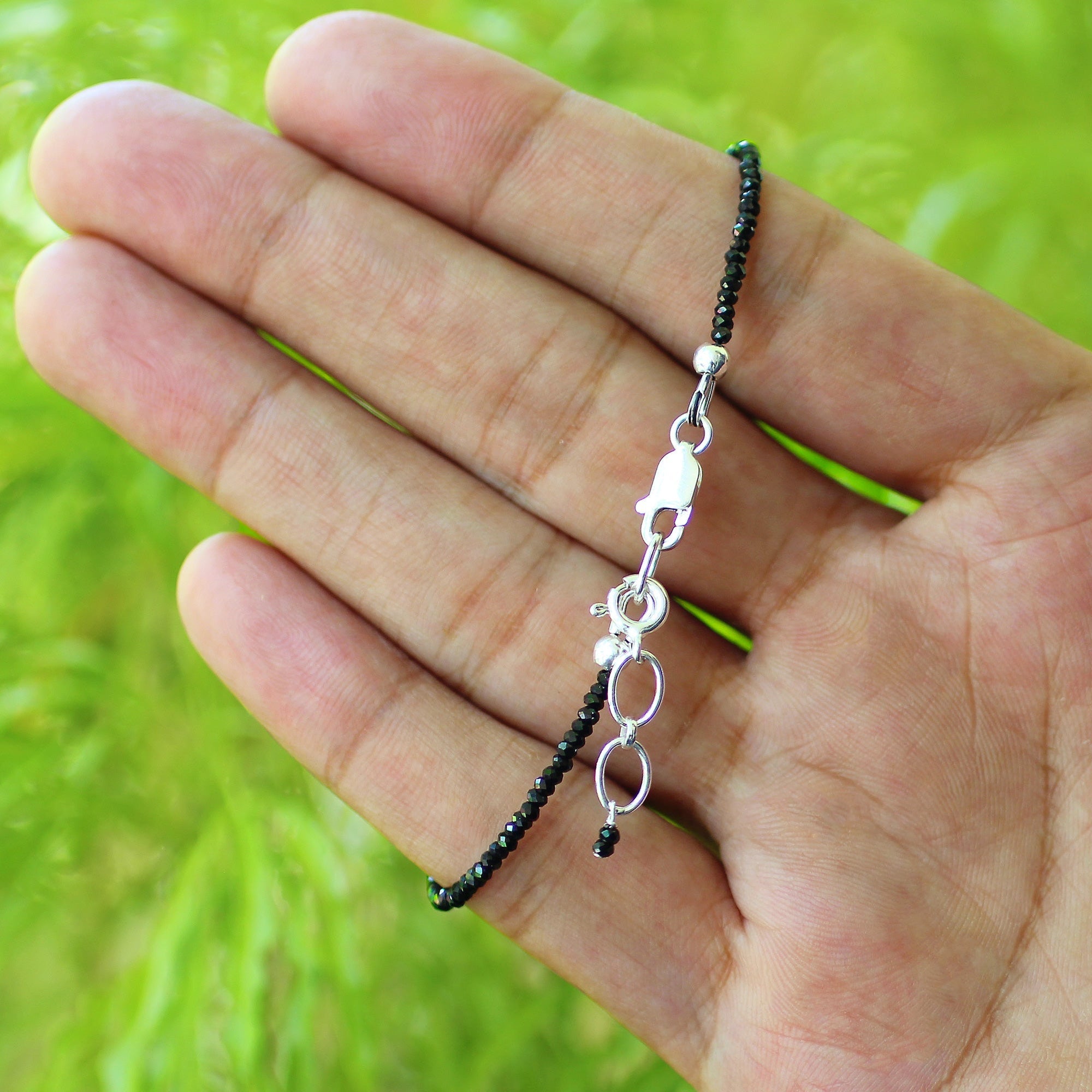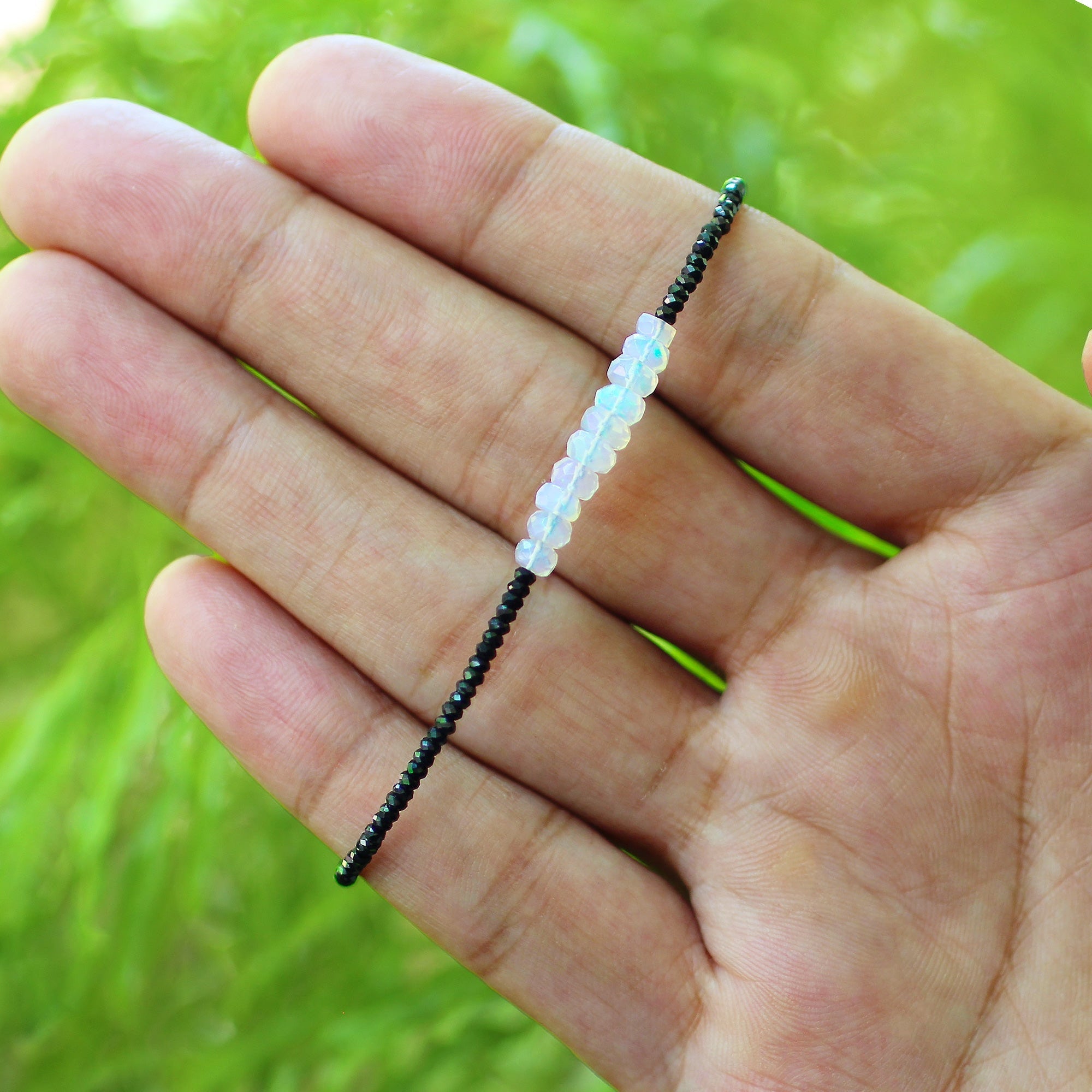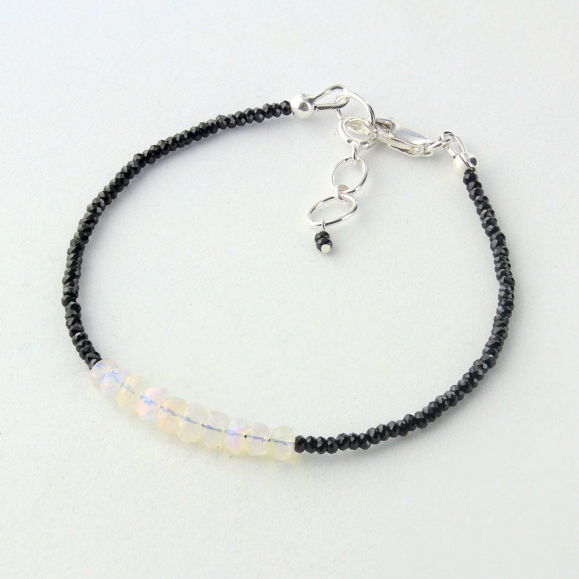 Beautifully crafted in India, add the perfect pop of color and sparkle to any outfit with this gorgeous sterling silver faceted rondelles natural Ethiopian opal with black spinel bracelet! This stunning bracelet contains a rich shade of black and white with flashes of blue, green, and yellow, along with a secure lobster clasp. The perfect accessory to any outfit, this sterling silver faceted rondelle natural Ethiopian opal with black spinel bracelet is a sure must-have! It measures approximately 7.5" in length by 1.5mm & 2mm in bead size and weighs 3 grams.