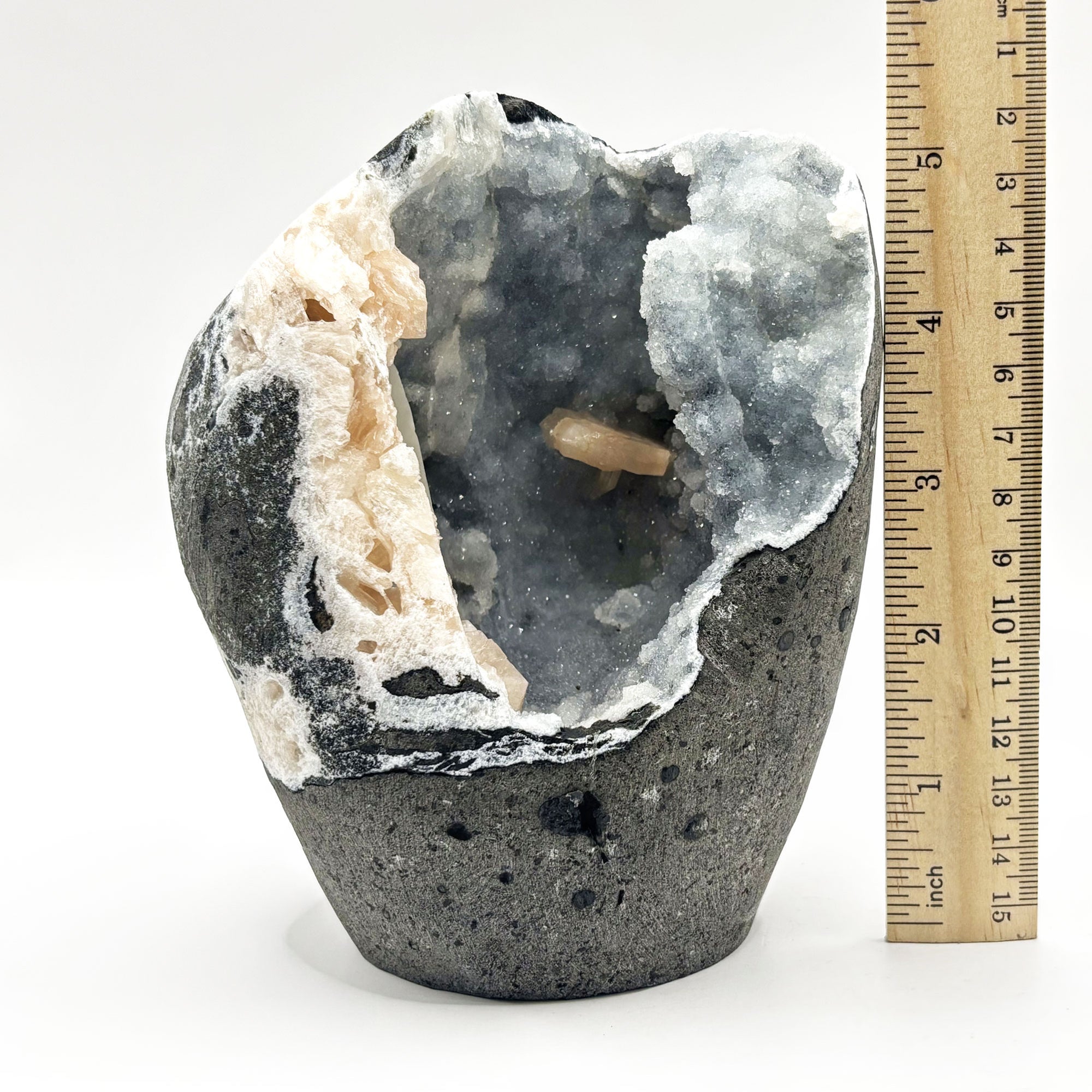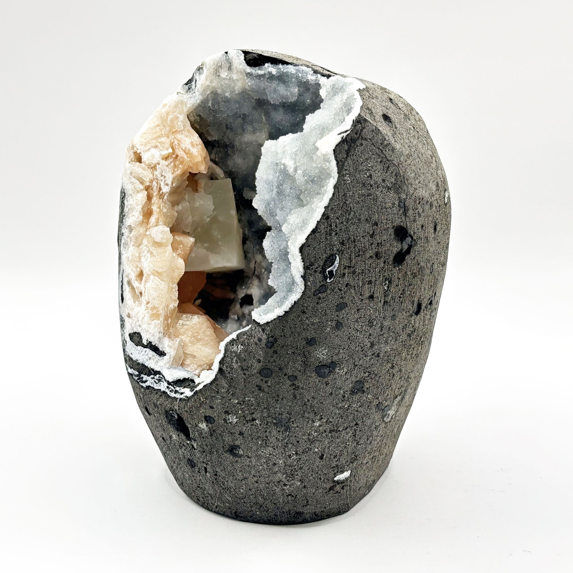 Introducing a captivating mineral specimen that combines the beauty of nature with the allure of rare crystals. This stunning cluster features Natural Calcite, Stilbite, and Chalcedony, each showcasing unique colors and formations. The specimen measures approximately 4 inches in length, 3 inches in width, and 5.5 inches in height, and weighs around 3.98 pounds. The crystals are securely attached to a natural matrix, creating a visually striking display.
