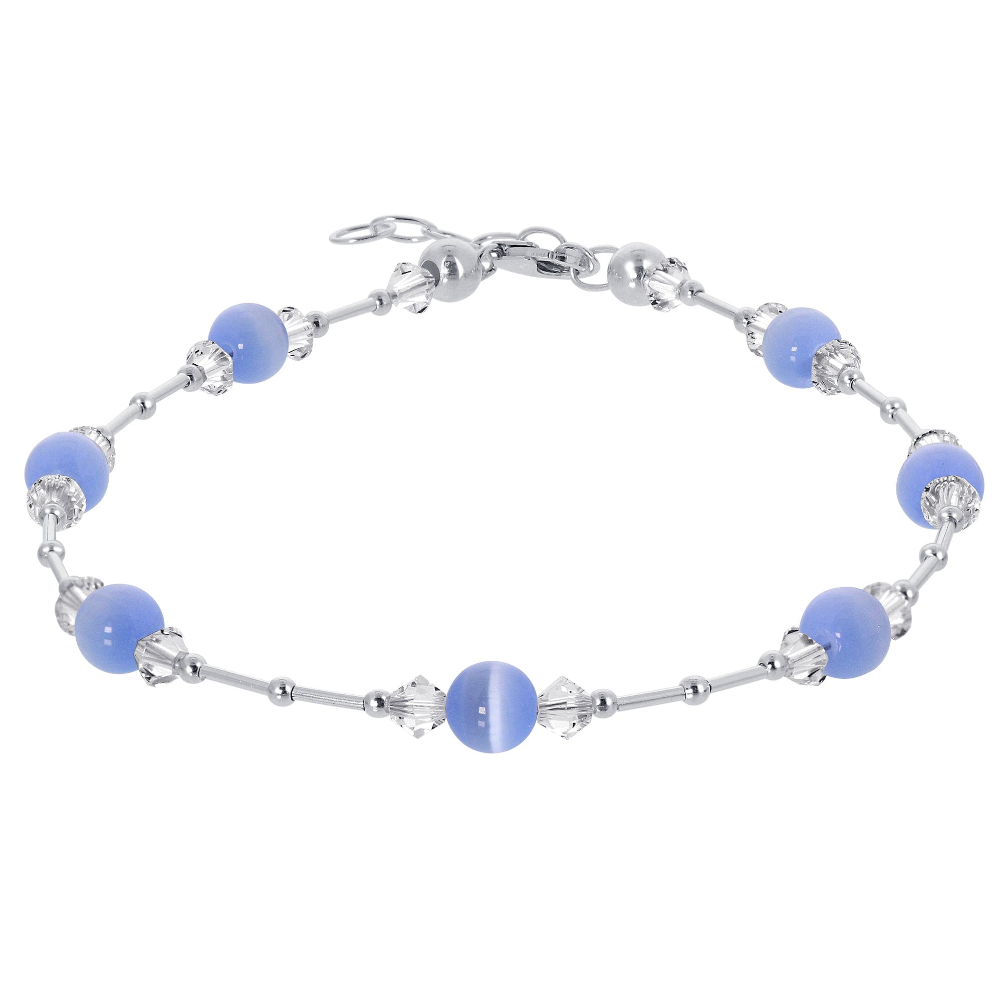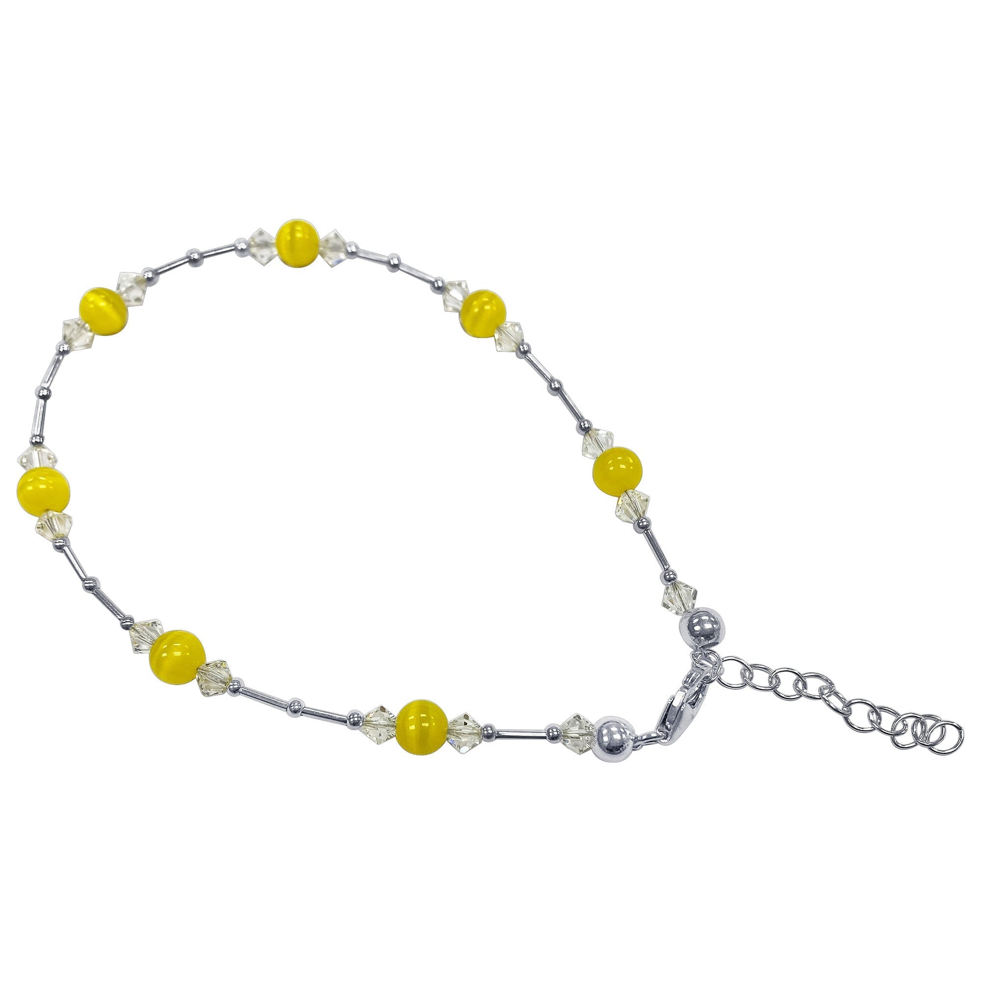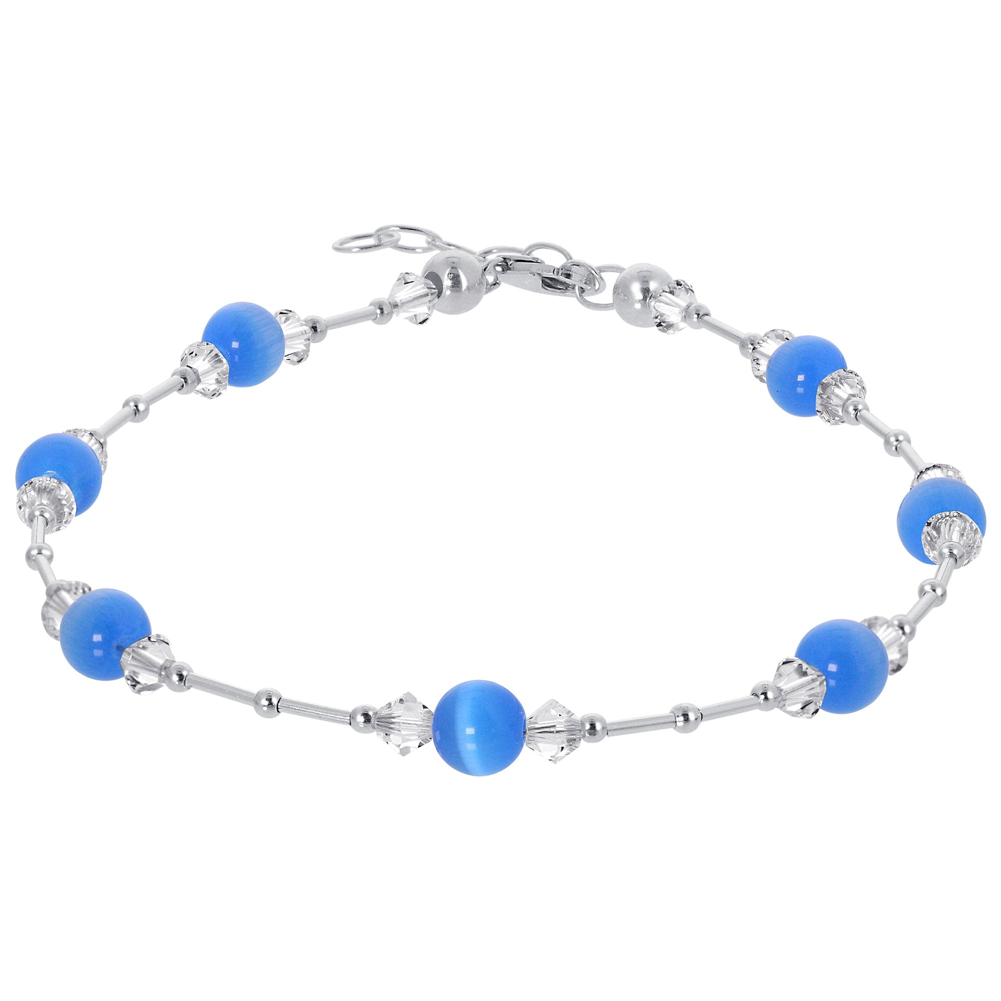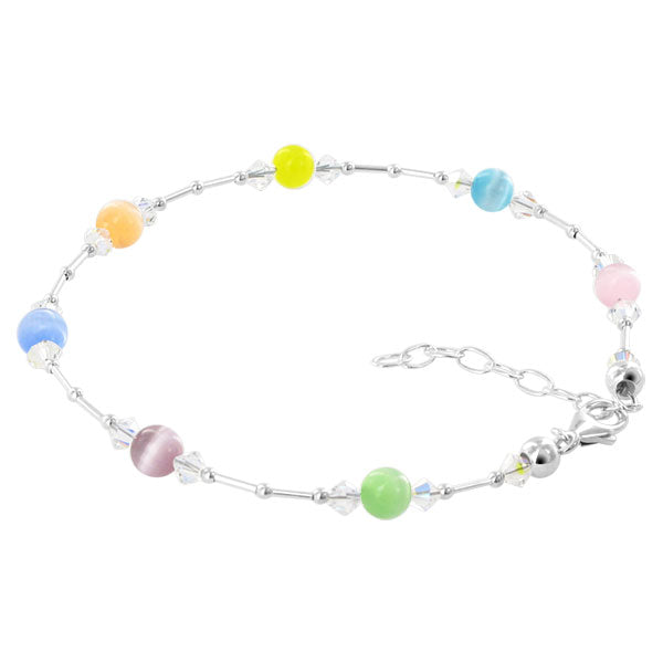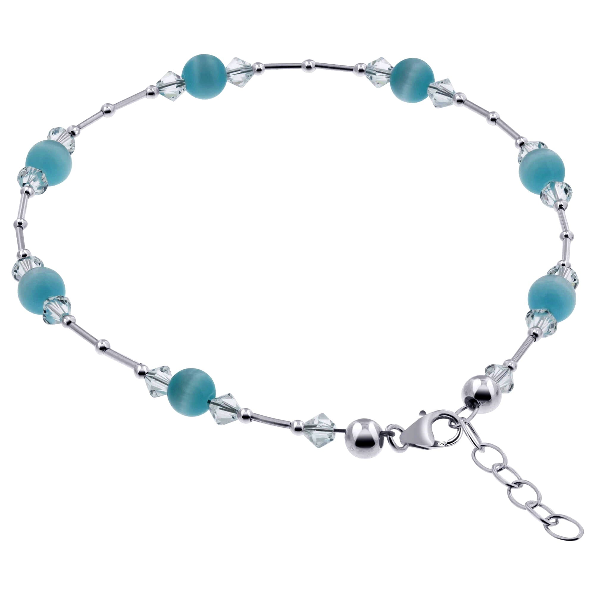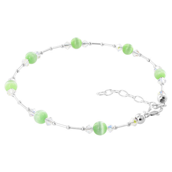 Indulge yourself without breaking the bank with this striking anklet. This stunning .925 sterling silver anklet is made of 5mm cats eye beads and 4mm bicone clear AB austrian crystal. The length of this anklet is adjustable from 9 inch to 10.5 inch and has a sterling silver lobster claw clasp.