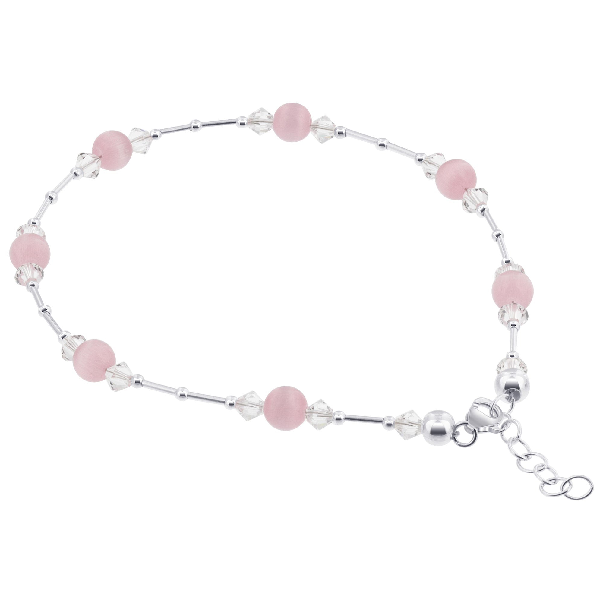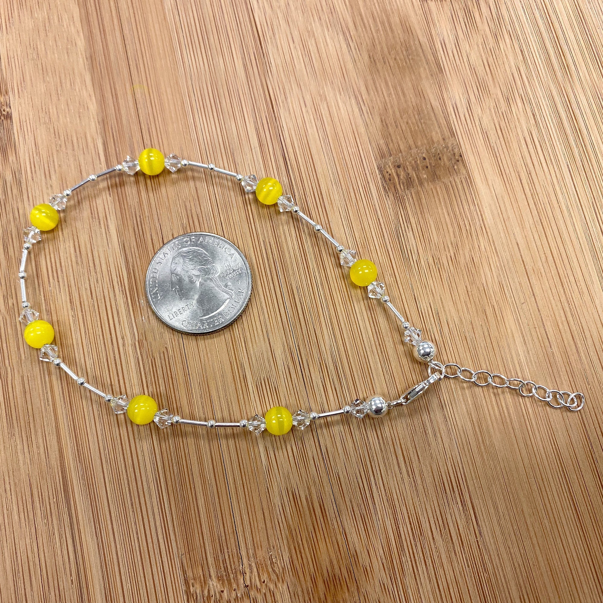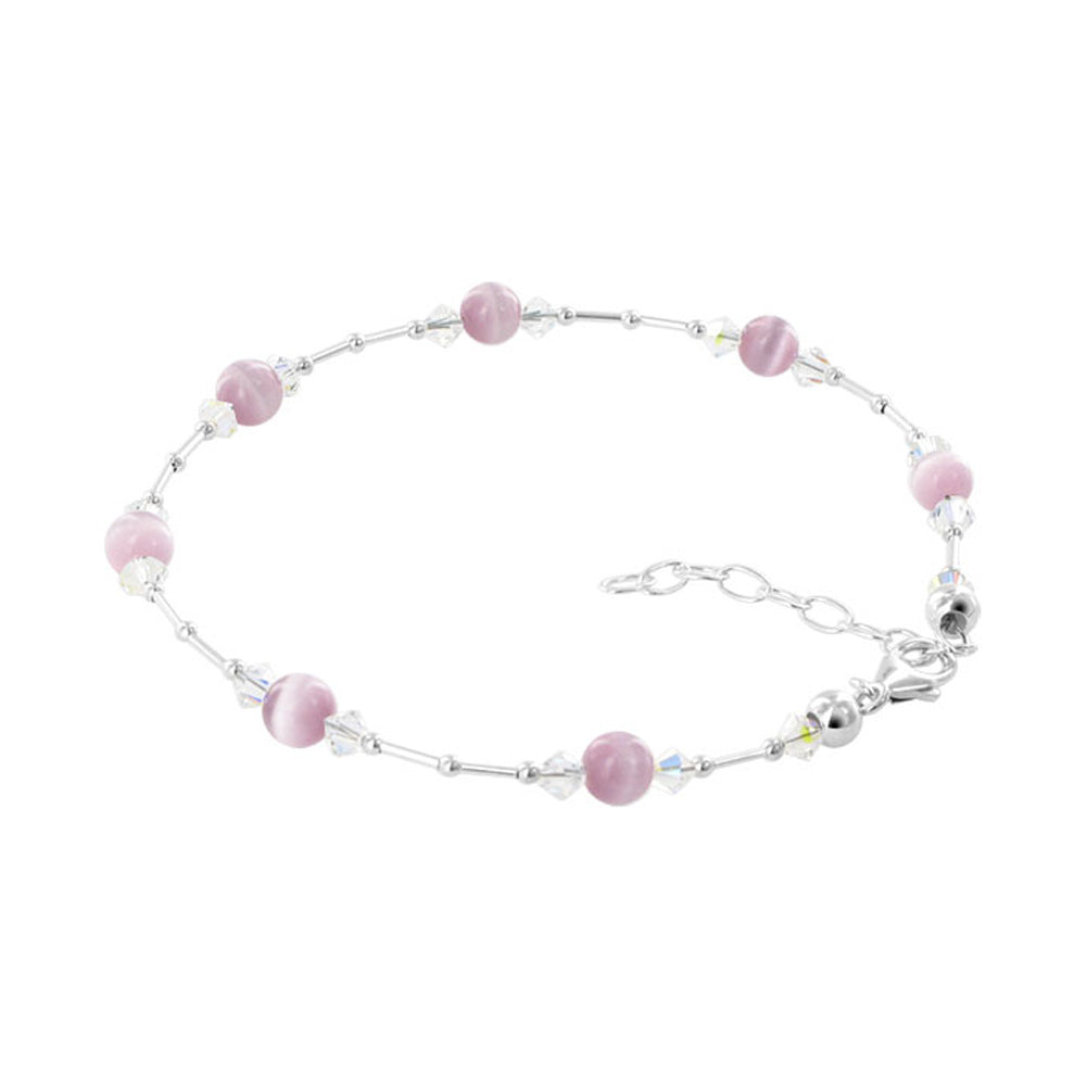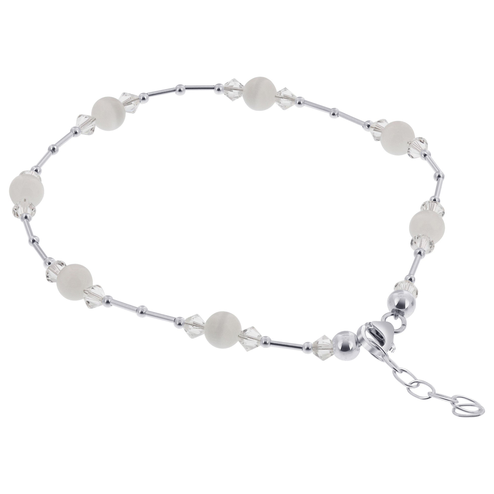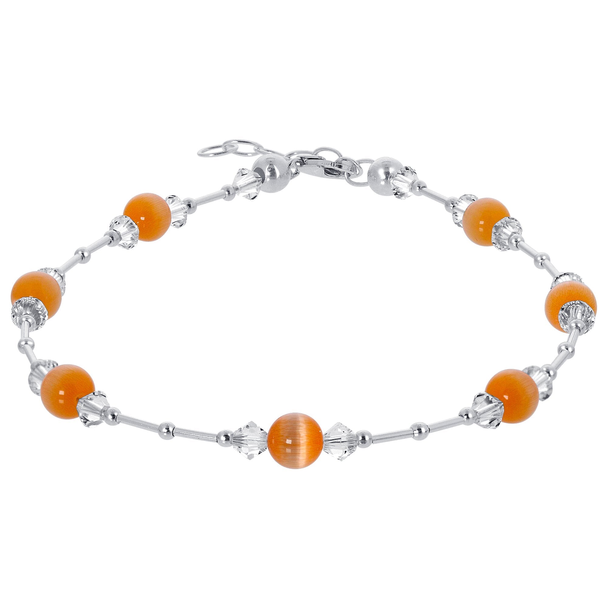Indulge yourself without breaking the bank with this striking anklet. This stunning .925 sterling silver anklet is made of 5mm cats eye beads and 4mm bicone clear AB austrian crystal. The length of this anklet is adjustable from 9 inch to 10.5 inch and has a sterling silver lobster claw clasp.