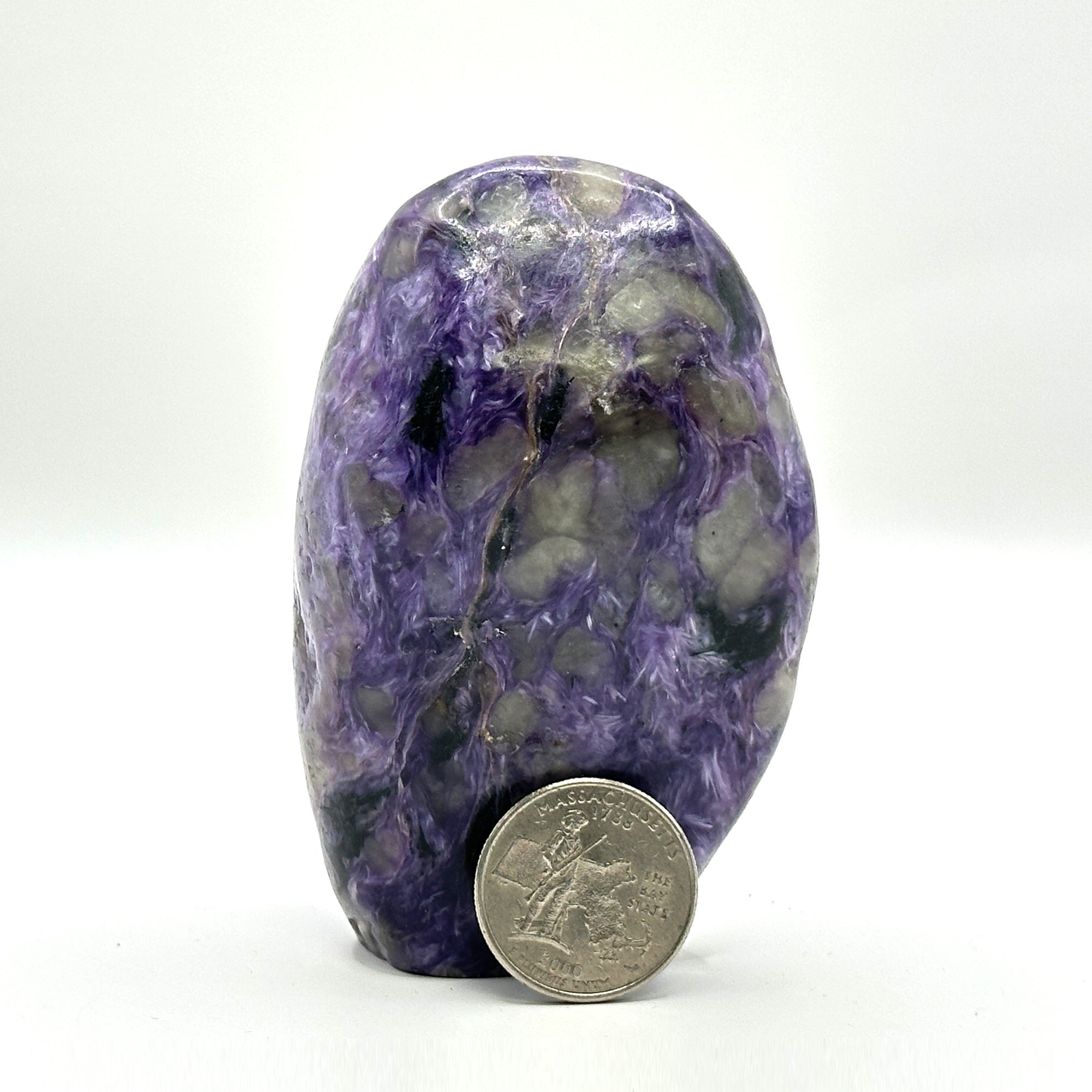 Natural charoite stone with freeform polished surface. The crystal displays vibrant purple swirls typical of Russian origin. It measures 2 inches long, 1.6 inches wide, 3.3 inches high and weighs 10.9 ounces.
