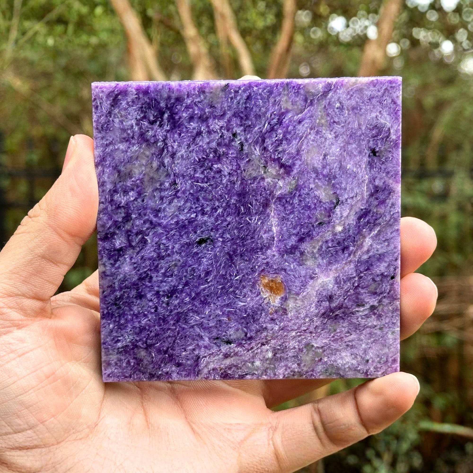 Natural polished purple charoite slab from Russia with a smooth, glossy surface. It measures 4 inches in length, 0.3 inches in width, and 4 inches in height, weighing 9.3 ounces. The slab is carved into a flat, plate style shape, allowing easy display or use in crystal collections.