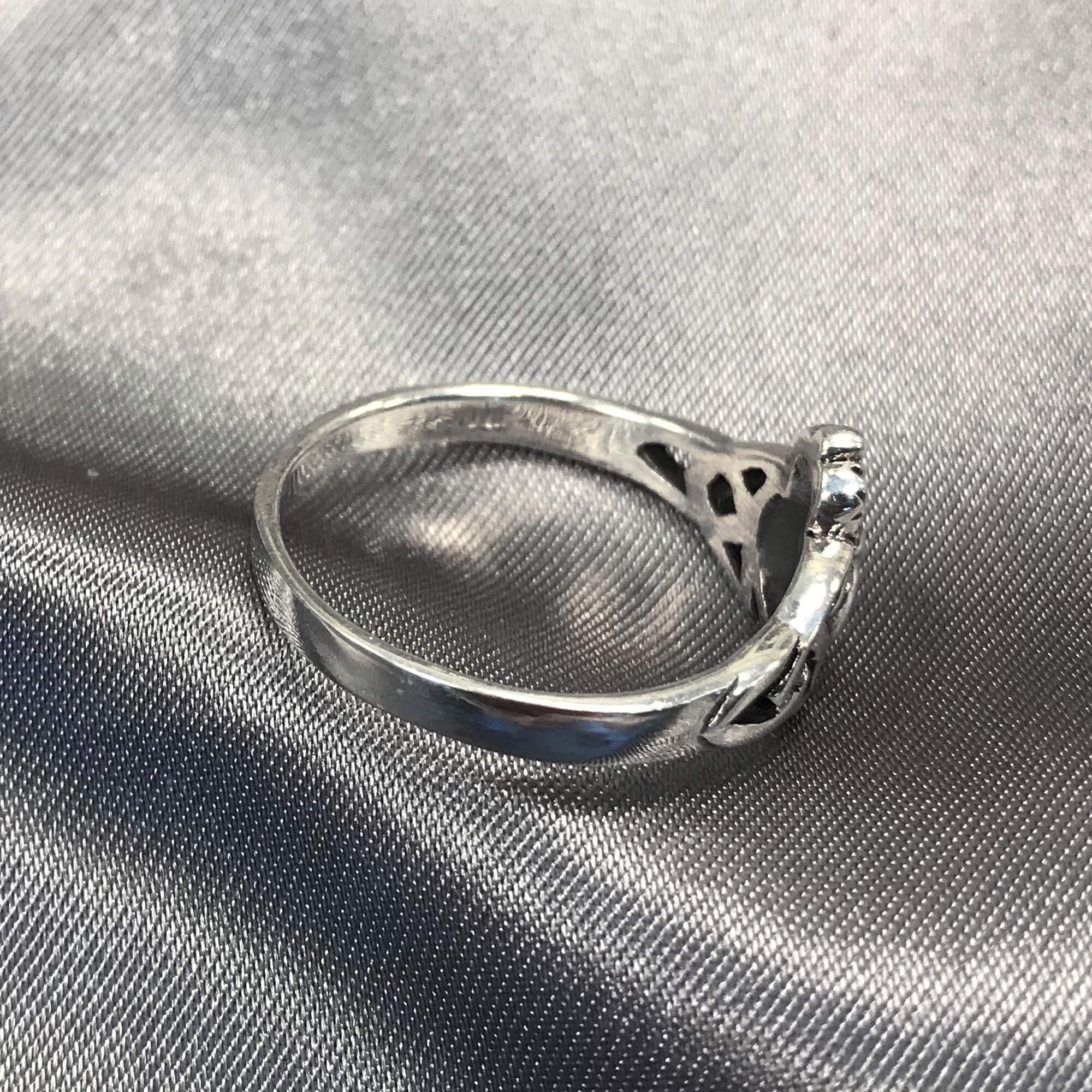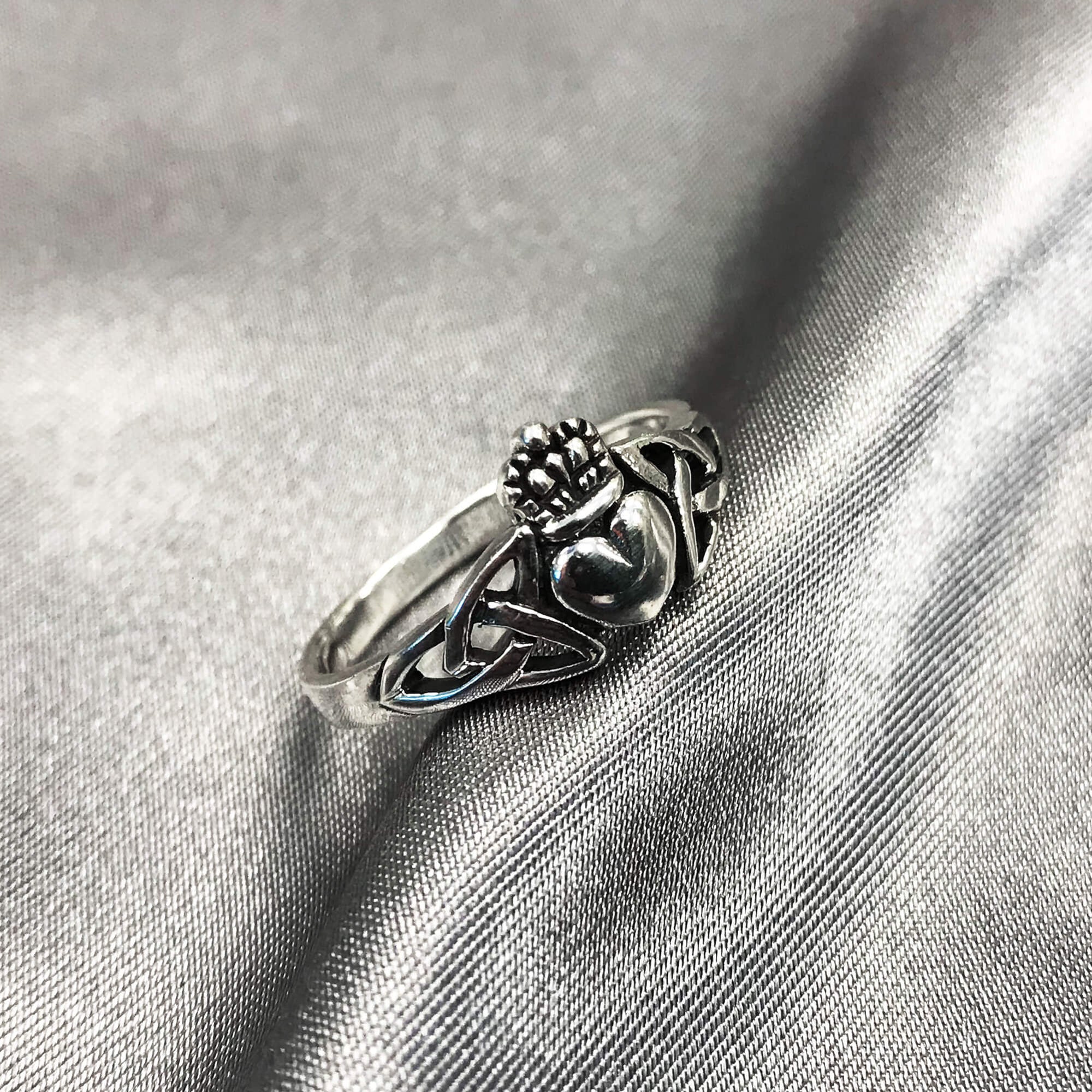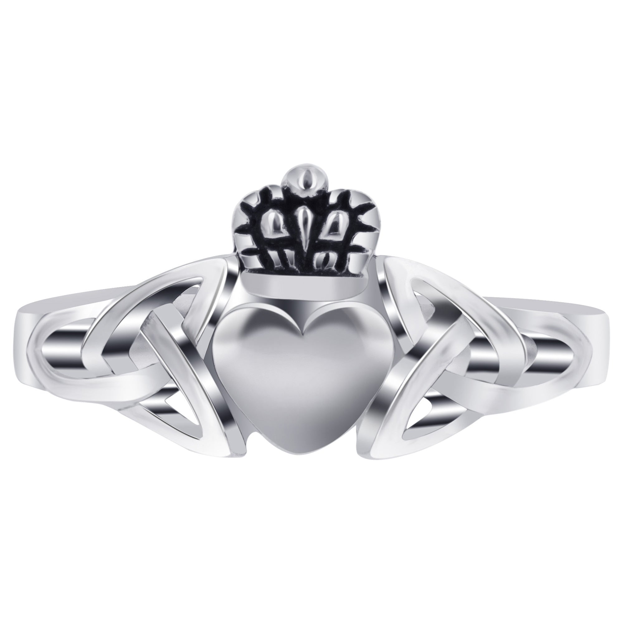 Beautiful 925 sterling silver heart knot ring. This lovely ring has a stunning heart in the center and is adorned with a knot-like pattern resembling hands holding the heart. Great for everyday wear! The Claddagh's distinctive design features two hands clasping a heart and is usually surmounted by a crown. The elements of this symbol are often said to correspond to the qualities of love (the heart), friendship (the hands), and loyalty (the crown). This Irish symbol first appeared in the 17th century as a ring and has been a part of Irish and modern Celtic cultural resurgence. In this ring the hands have been replaced by the triquetra representing the three promises of a relationship: to love, honor, and protect.