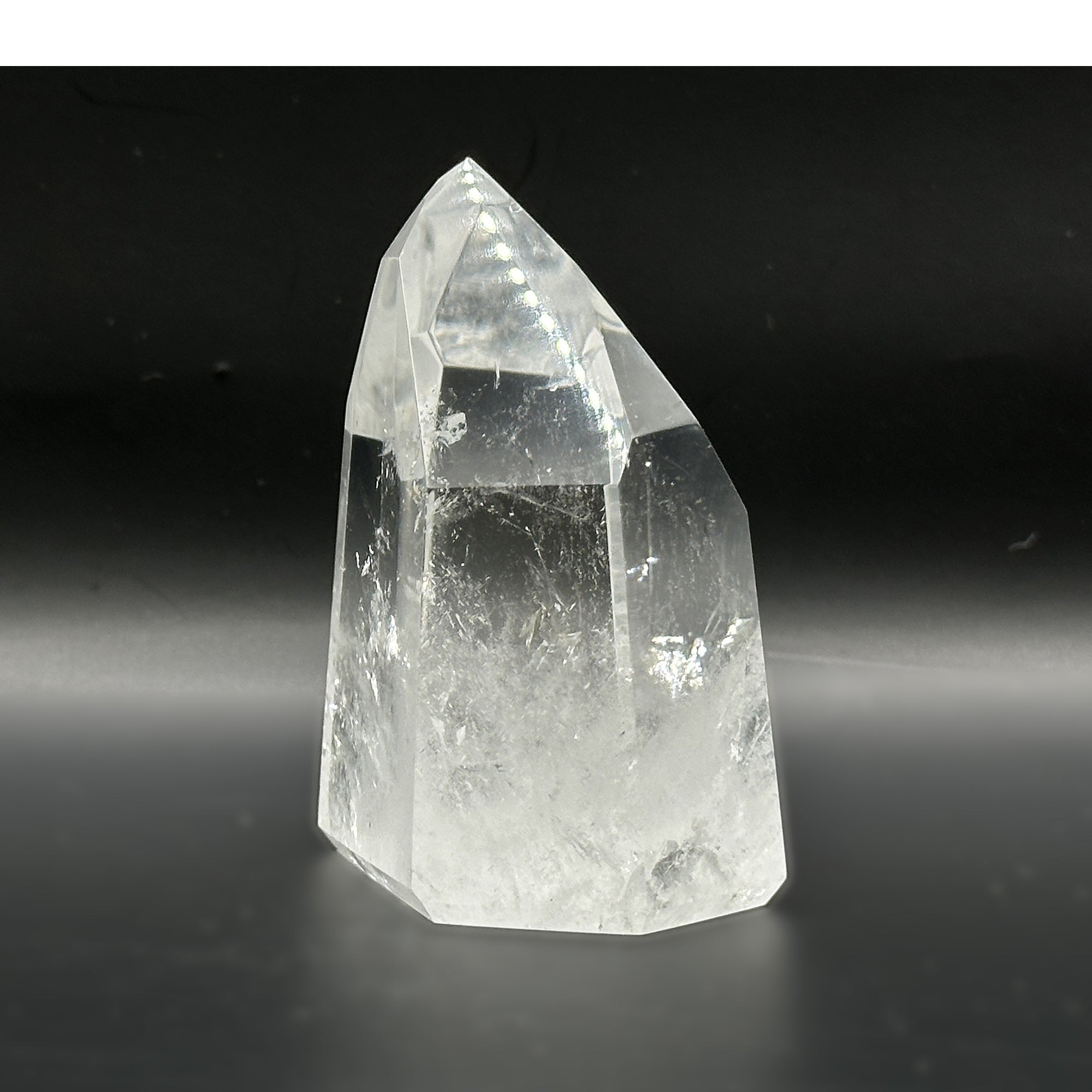 This natural Brazilian clear quartz point showcases a transparent, pristine structure with a smooth, naturally formed termination. Measuring approximately 2 inches long, 1.25 inches wide, and 2.5 inches tall, it weighs 7.4 ounces and displays unique natural striations characteristic of authentic quartz specimens.