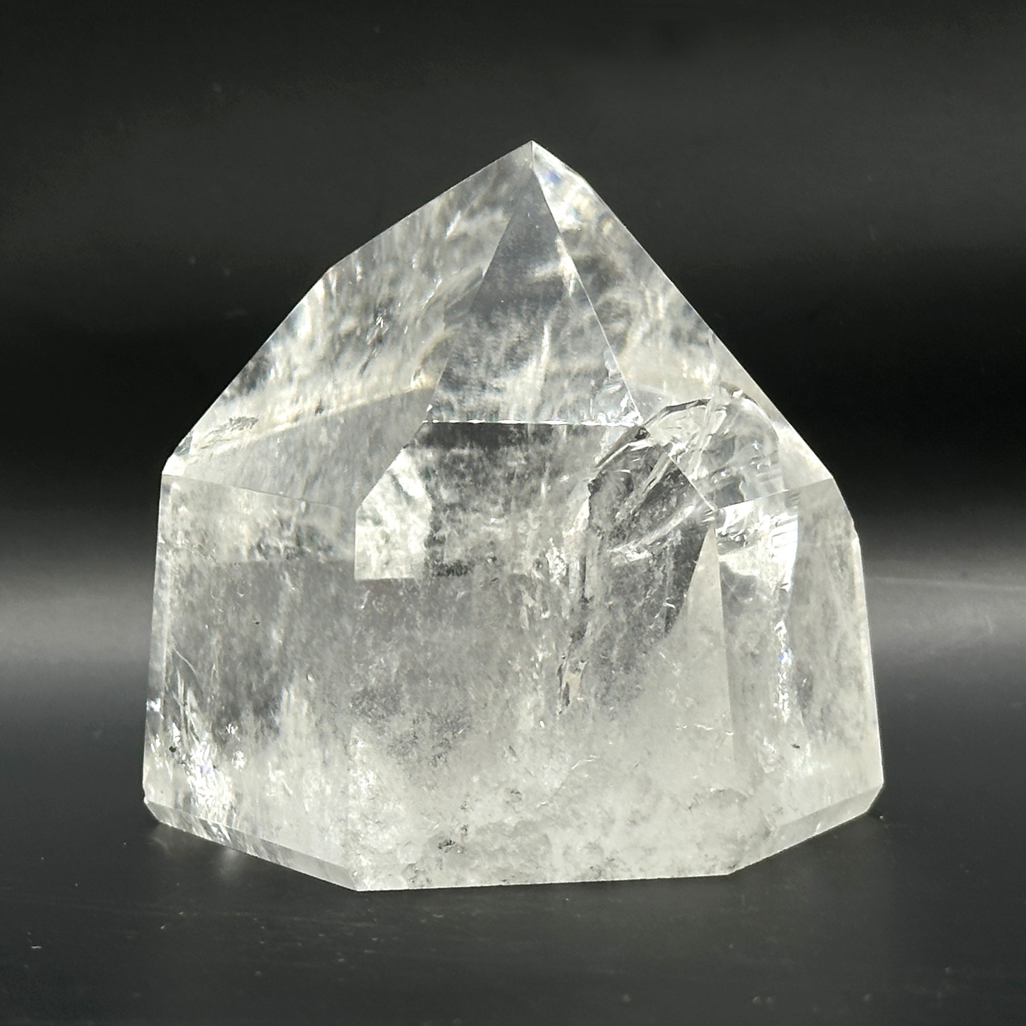 Natural clear quartz point hand polished in Brazil showcases a smooth, transparent crystal tower with a pointed tip that catches light beautifully. The stone measures approximately two inches tall and is crafted from pure quartz, weighing about 11.9 pounds, offering a solid, high‑quality feel.