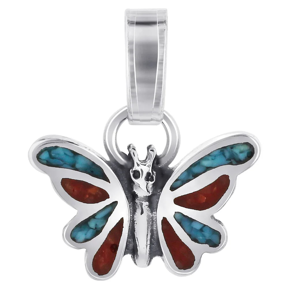 Exquisite 925 Sterling Silver Butterfly Pendant featuring a stunning inlay of Turquoise and Coral gemstones. This delicate charm showcases intricate craftsmanship, with the butterfly measuring 10mm in length and 9mm in width. Including the bail, the pendant has a total length of 1/2 inch, making it a perfect addition to any chain. Its elegant design adds a touch of nature-inspired beauty to your jewelry collection. Please note: This product is not Indian-made or an Indian product under 25 U.S.C. 305 et. seq.