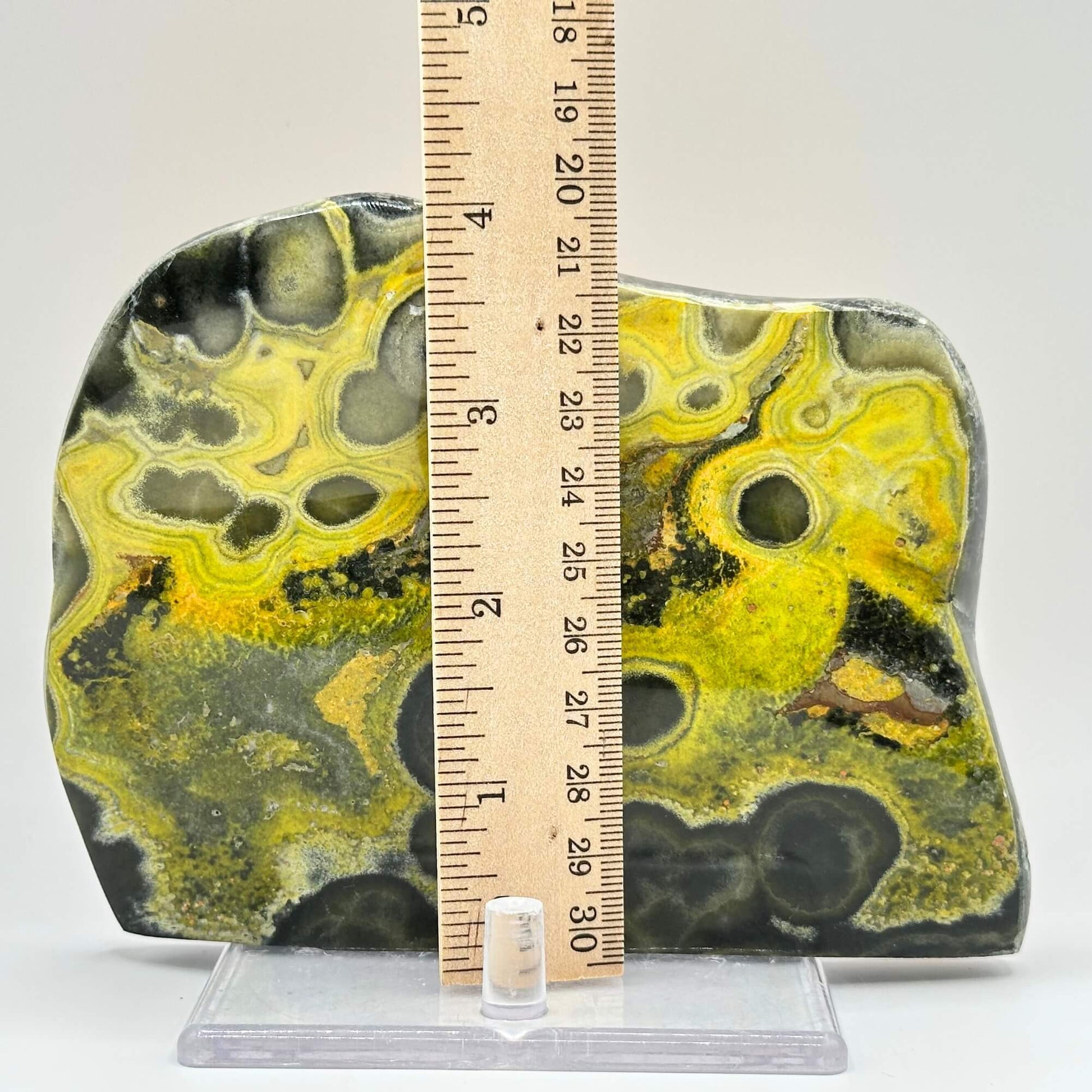 This striking bumblebee jasper slab features bold, natural patterns in vibrant hues of yellow, orange, black, and gray. Measuring approximately 4.4 inches in length, 0.5 inches in width, and 4 inches in height, it showcases the unique banding and coloration that make this material highly sought after by collectors and lapidary artists.