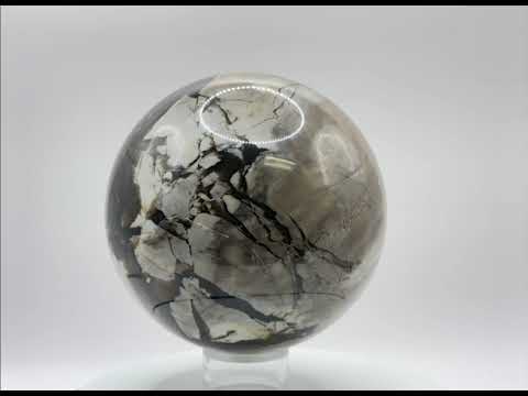 This impressive 4-inch volcanic agate sphere displays striking natural patterns in contrasting tones, with deep black areas that fluoresce a vivid green under UV light. The unique visual effect adds an extra layer of interest to the stone, making it a standout piece in any mineral or display collection.