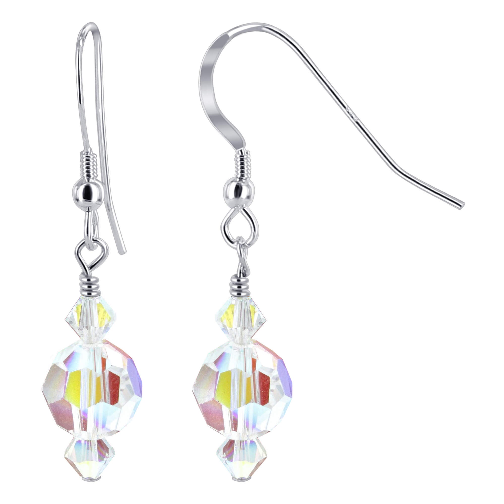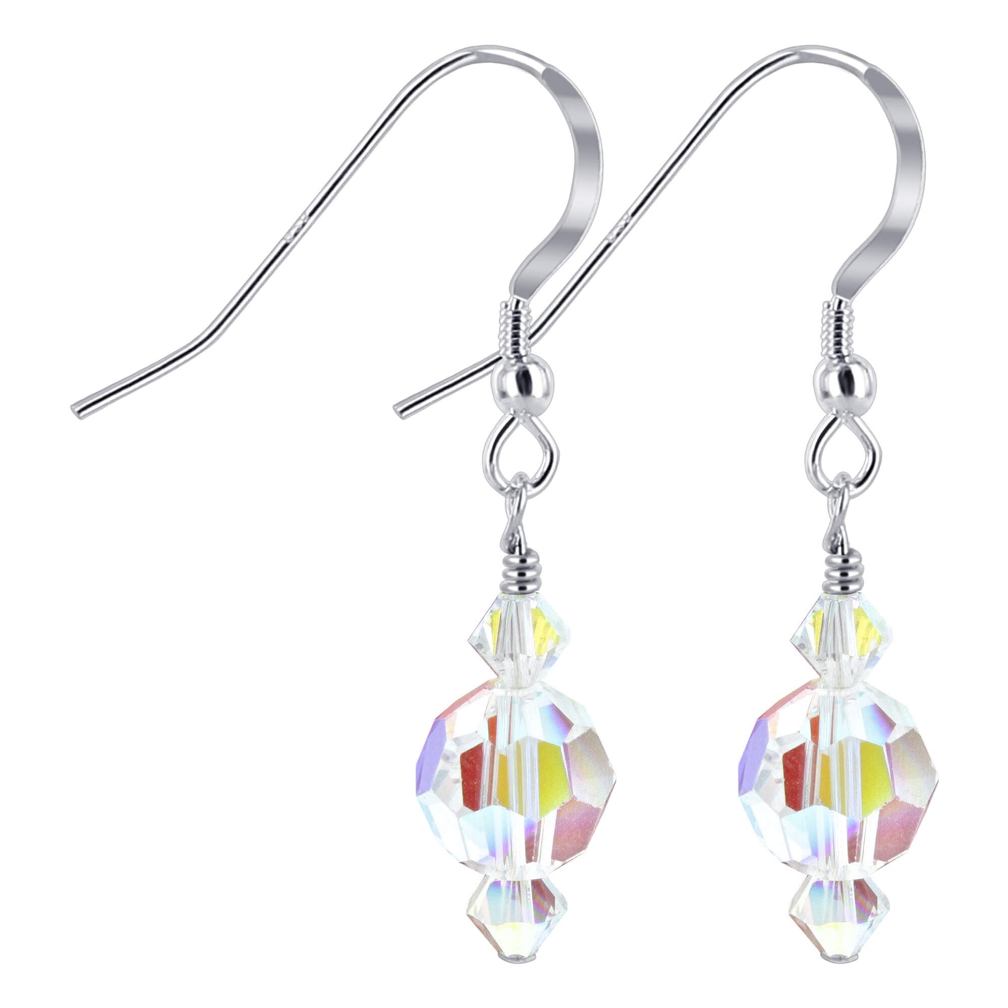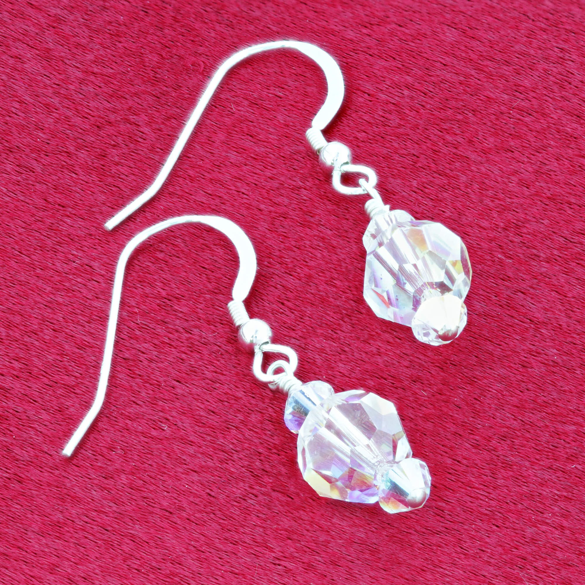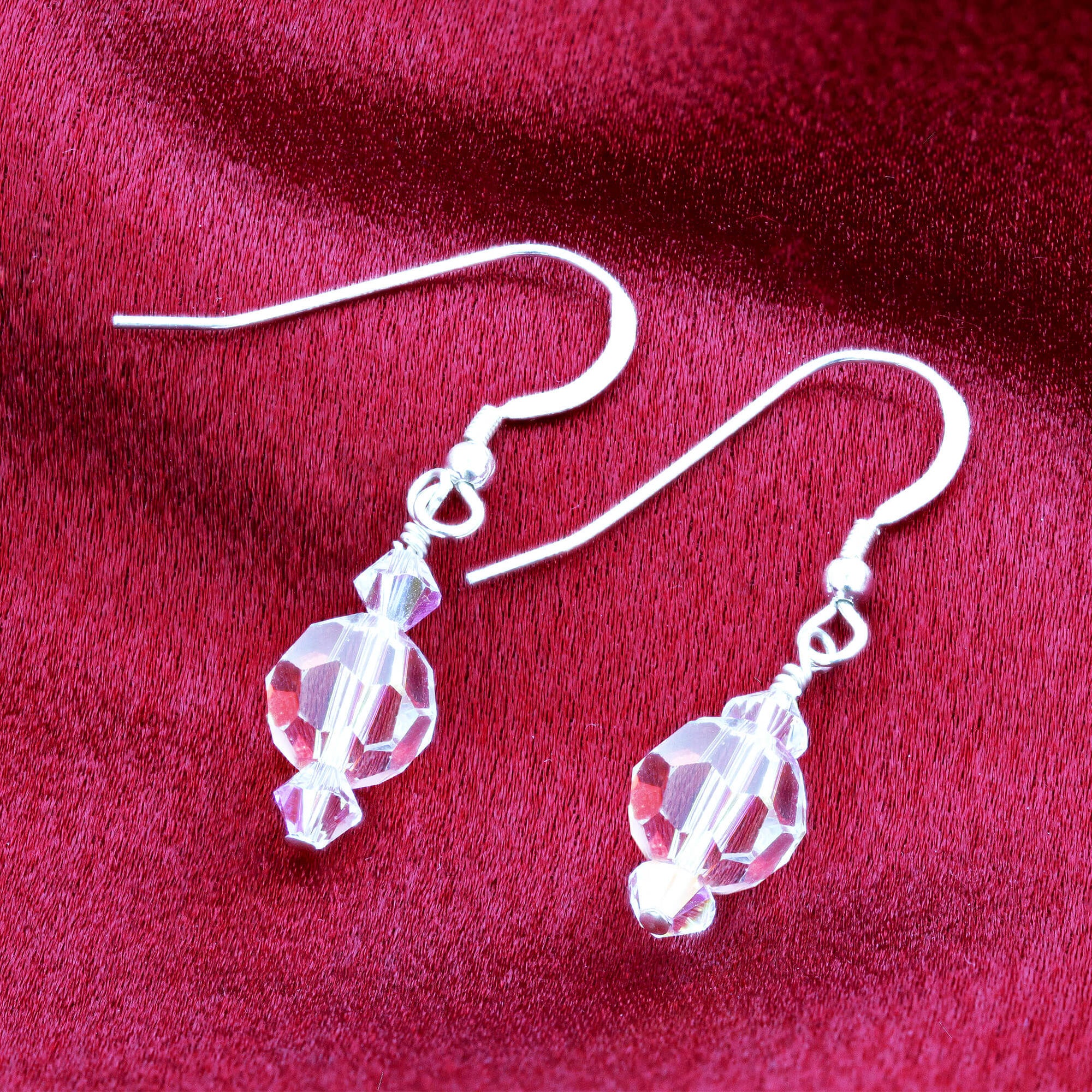 Add a touch of elegance to any outfit with these exquisite dangle earrings. They are made from high-quality 925 sterling silver. Each earring features a sparkling 8mm round clear AB Austrian crystal flanked by two 4mm bicone Austrian crystals in the same stunning hue.