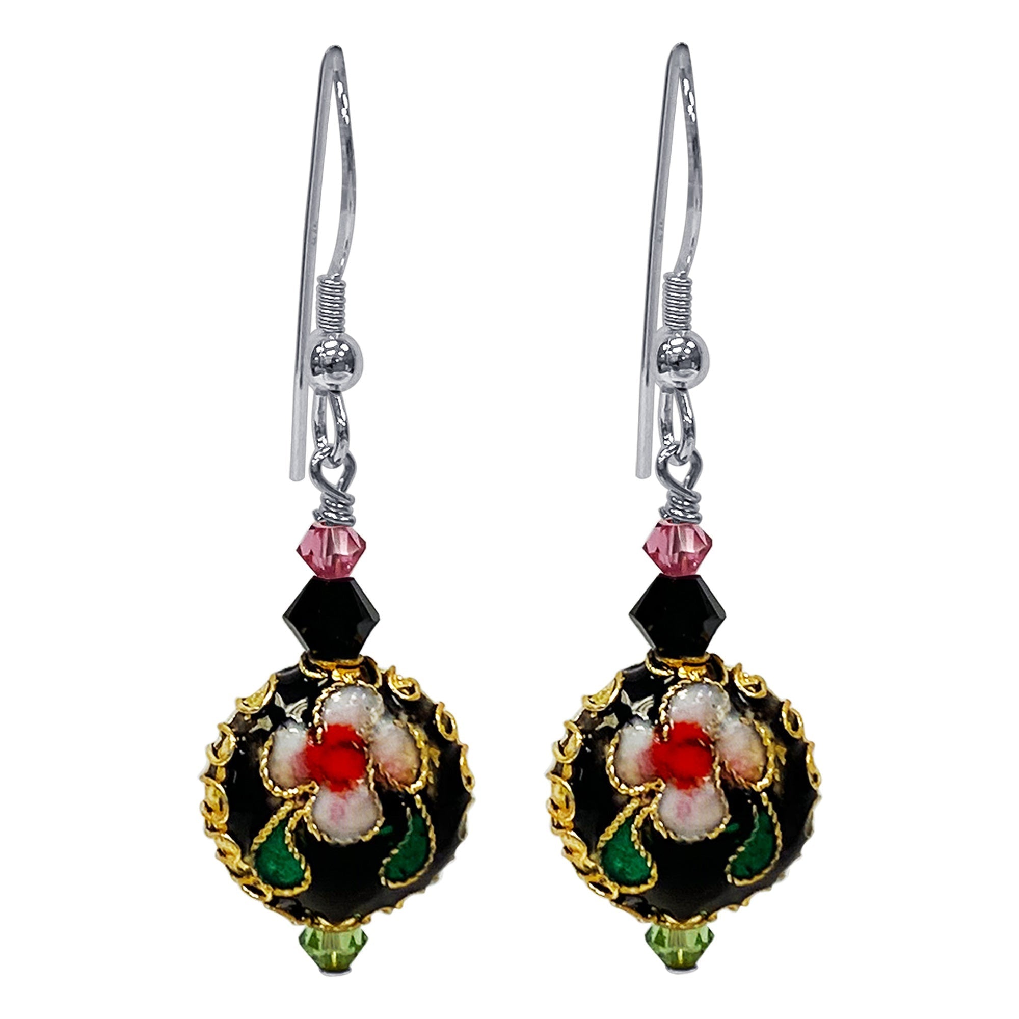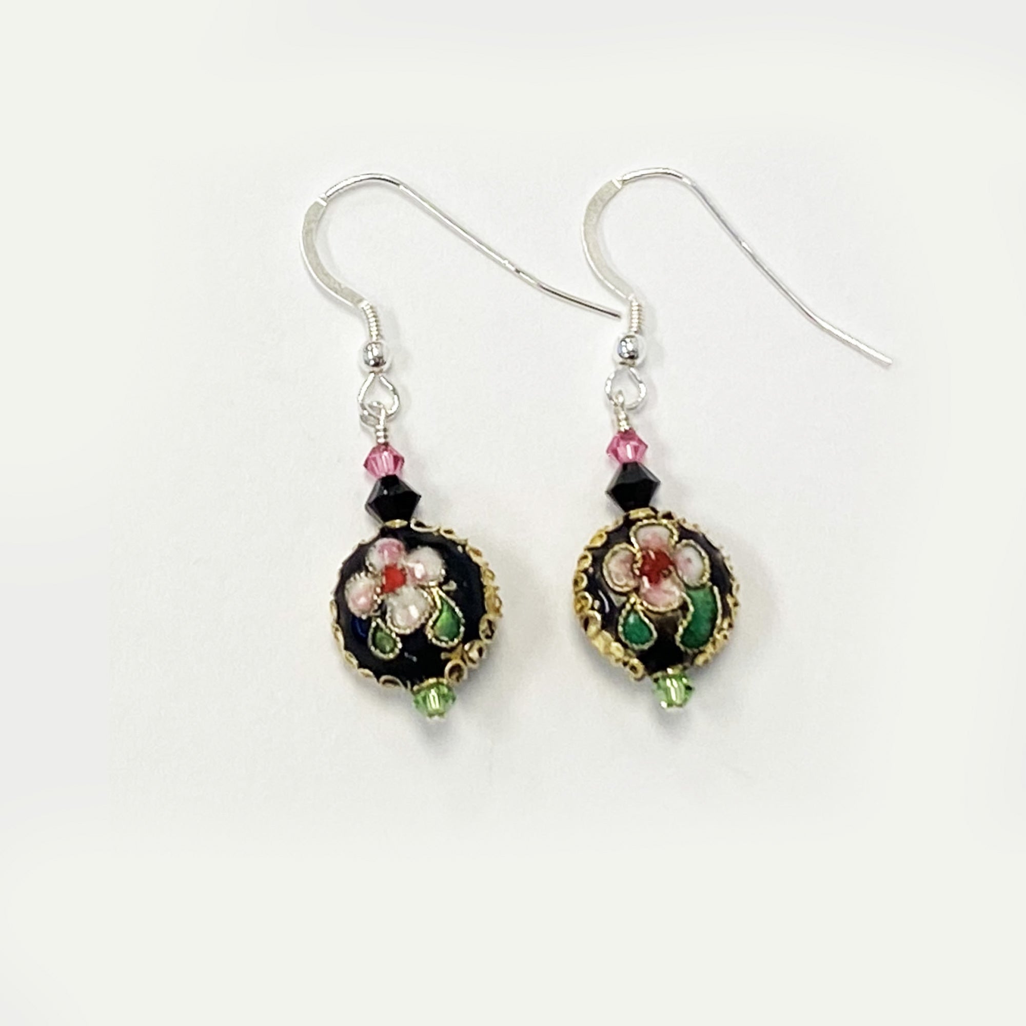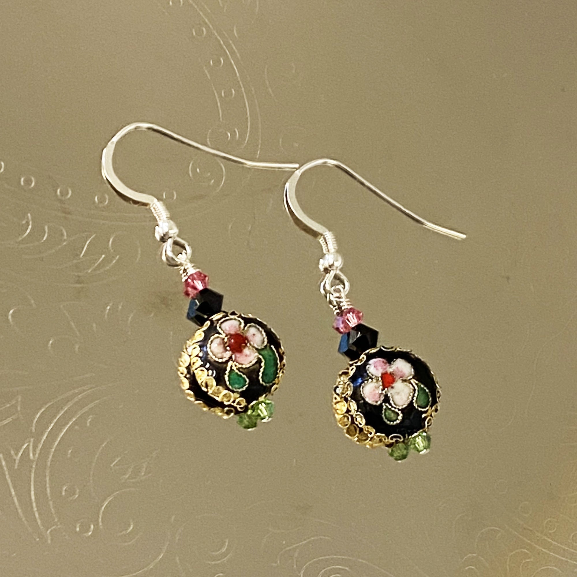 Elegance is magnificence; make it the attribute of your look with gorgeous handmade sterling silver drop earrings. This dainty pair of earrings is made of black, pink, and green Austrian crystals; also, there is a blue Cloisonne bead, which has such a pretty flower etched into the surface. These are stud earrings that all women should be proud to wear because of the secure leverback findings. 1. 5 inches long.